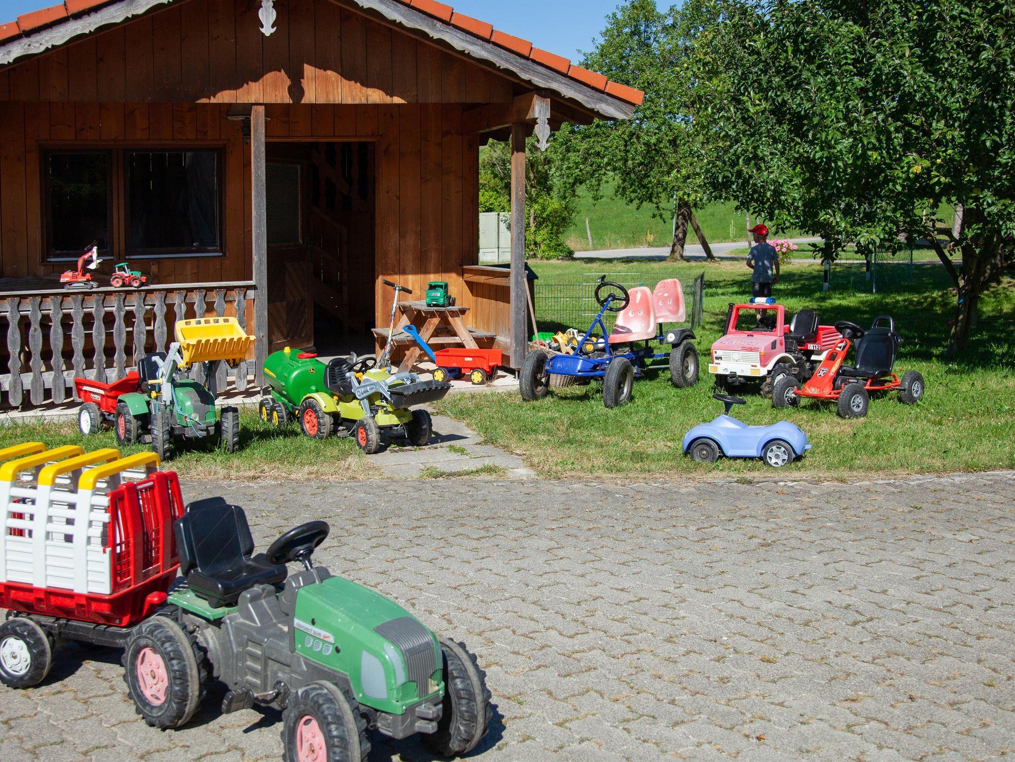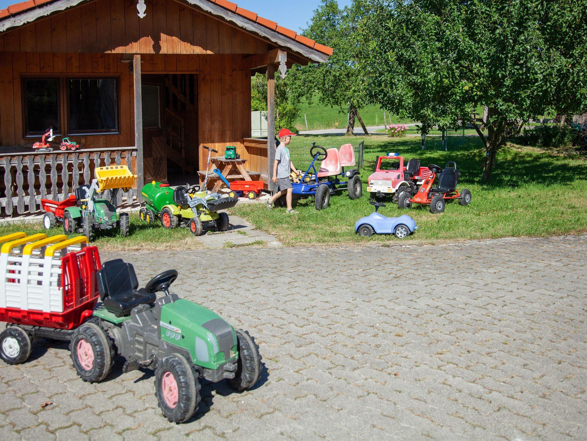Für die Kinder gibt es ein Spielhäuschen mit Trettraktoren, Kettcars, Bobbycar und anderen Spielsachen.
