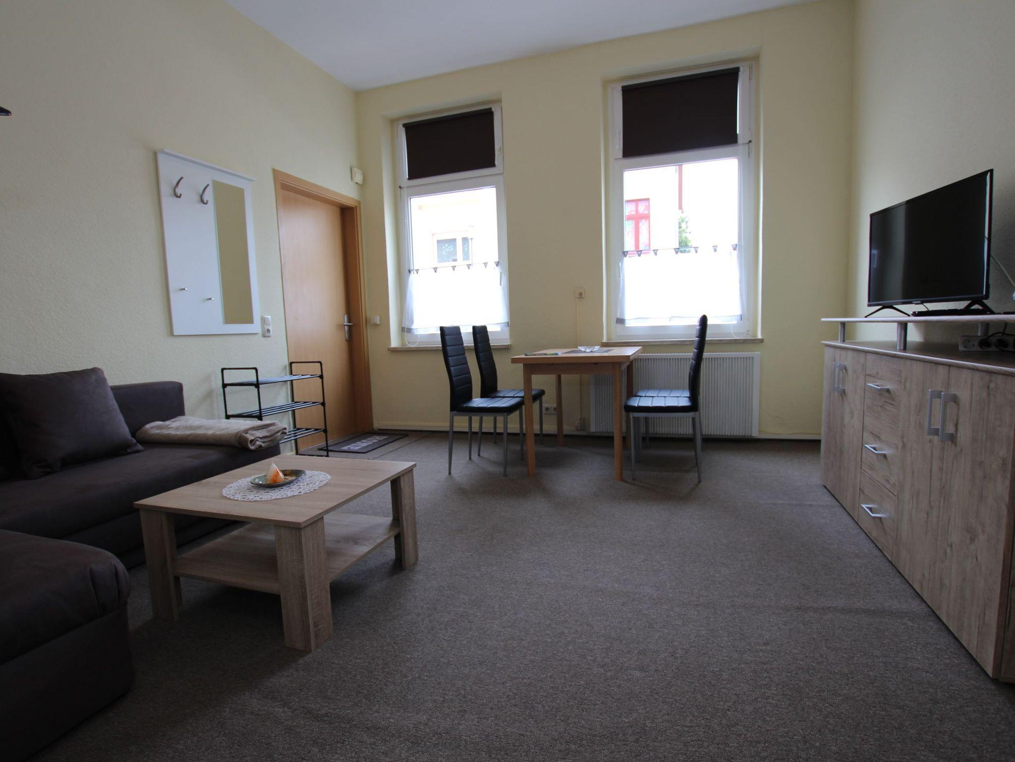 Die Ferienwohnung befindet sich in einem Haus mit 3 Wohnungen im Erdgeschoss und hat eine Größe von 40 m². Der gemütlich eingerichtete Wohnraum mit Sofaecke (Aufbettung für 3. Person), Couchtisch, TV, Radio, CD-Spieler und Esstisch mit Stühlen lädt zum Verweilen ein. Die Küche ist zum Wohnzimmer offen und modern ausgestattet mit Cerankochfeld, Backofen, Mikrowelle, Toaster, Wasserkocher, Kaffeemaschine und Kleinutensilien. Das Bad ist gefliest und mit einer Dusche, Waschtisch und WC ausgestattet. Im separaten Schlafzimmer mit dem Boxspringbett (1,80 m x 2,00 m), Nachttischen und dem Kleiderschrank finden Sie Nachtruhe. WLAN ist vorhanden. Im umzäunten Innenhof befindet sich eine Sitzecke mit Gartenmöbeln, Sonnenschirm und Grill. Diese Sitzecke wird gemeinschaftlich genutzt mit anderen Gästen des Hauses. Für wohlige Wärme sorgt eine Speicherheizung, die über ein Thermostat regelbar ist. Heizung/Strom werden nach Verbrauch berechnet.