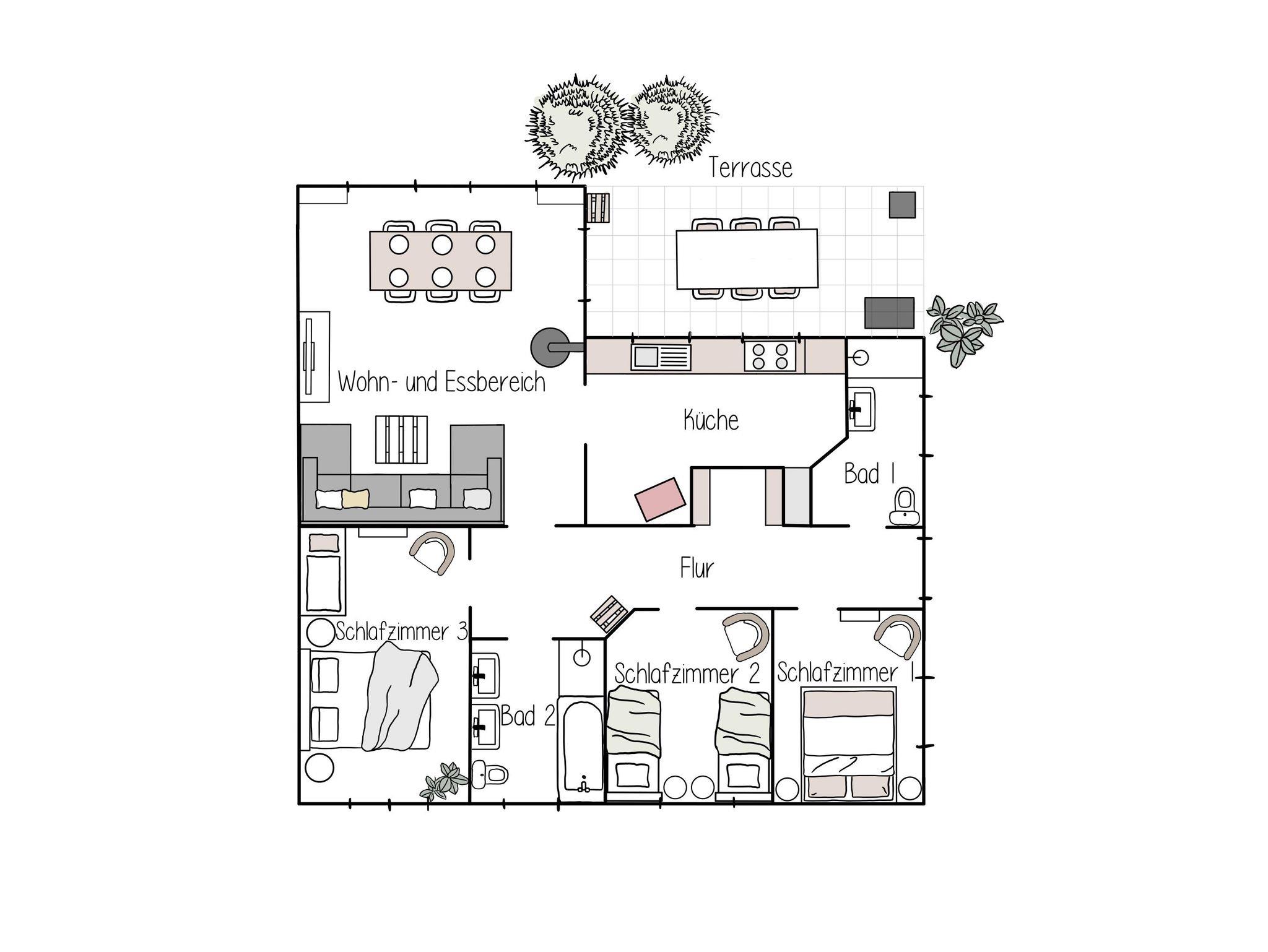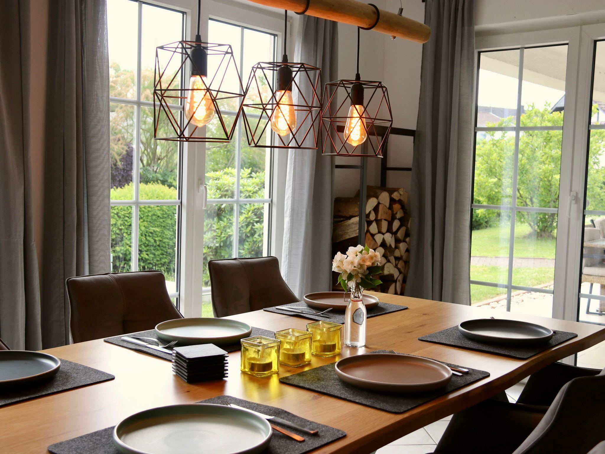 Ihnen gefällt die Vulkaneifel besonders gut und Sie suchen noch eine schöne Unterkunft, in der man sich wie zu Hause fühlen kann? Dann schauen Sie sich doch mal unsere neu eingerichtete Ferienwohnung für maximal 6 Personen an. Die modern eingerichtete Erdgeschosswohnung mit rund 110 qm verfügt über ein geräumiges Wohnzimmer mit einer gemütlichen Wohnlandschaft. Von dort aus kann man einen schönen Filmeabend mit Kaminblick genießen. Der Essplatz ist umgeben von großen bodentiefen Fenstern, sodass das Wohnzimmer tagsüber mit schönem Tageslicht beleuchtet wird. Die Küche mit offenem Zugang zum Wohnbereich lädt zum gemeinsamen Kochen ein. Mit dem induktionsfähigen Kochfeld und dem Blick nach draußen macht das Kochen doch viel mehr Spaß. Von einem langen Flur abgehend, befinden sich die drei Schlafzimmer. Zwei der drei Schlafzimmer verfügen über jeweils ein Doppelbett (1,80m), das dritte Schlafzimmer ist mit zwei 90cm Betten ausgestattet, die wahlweise zusammen geschoben werden können. Das kleinere Bad verfügt über eine Dusche mit Toilette und Waschbecken. Das große geräumige Bad schließt eine Dusche mit Badewanne, zwei Waschbecken und einer Toilette ein. Der große Garten mit gefliester Terrasse und großer Rasenfläche bietet viel Platz zum Spielen und Entspannen. Hier kann man es sich im Sommer, aber auch im Winter gut gehen lassen.