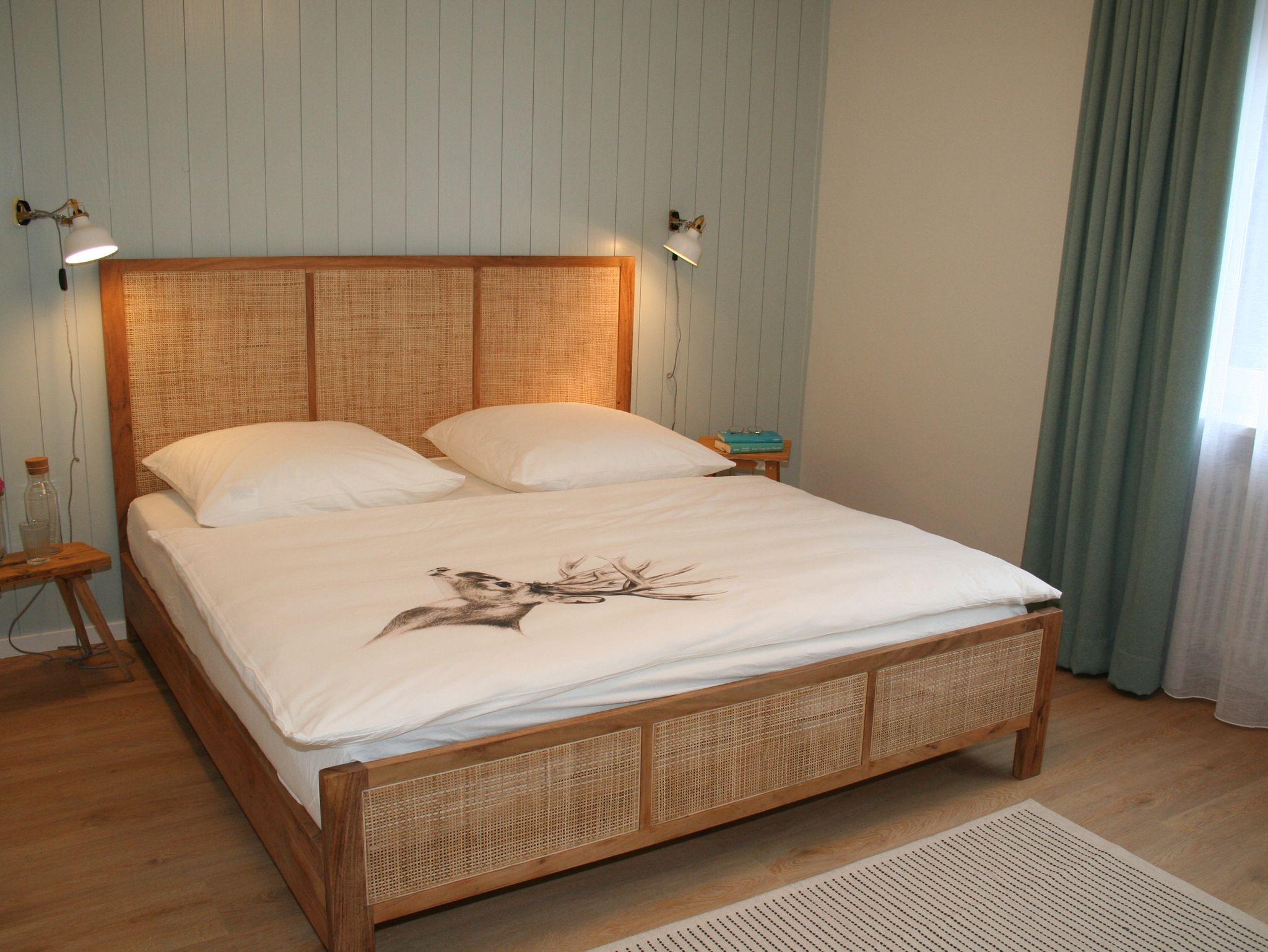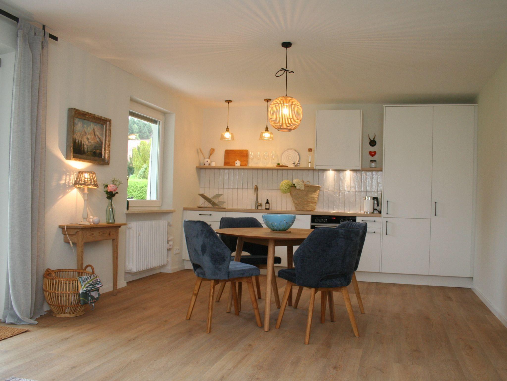 Die neu renovierte Erdgeschosswohnung, verfügt über zwei Schlafzimmer, ein bedingt barrierefreies Badezimmer, eine voll ausgestattete Küche und ein Wohnzimmer mit Panorama Fenster auf die südliche Terrasse mit Garten. Die Ferienwohnung ist nicht rollstuhlgerecht.