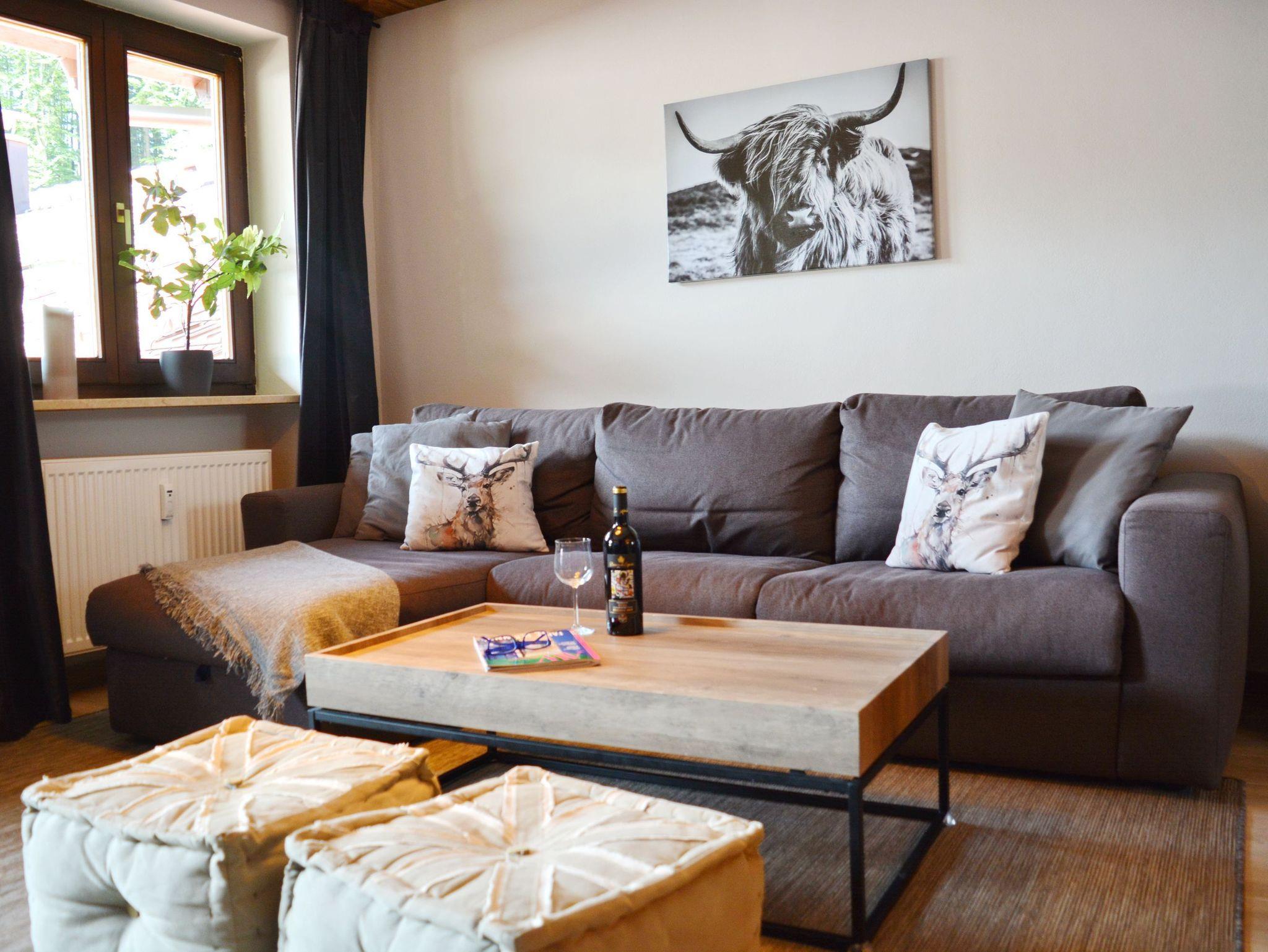 Diese stilvoll eingerichtete Ferienwohnung im 2. Obergeschoss bietet modernes alpenländisches Design, gemütlichen Komfort und einen Südbalkon mit Berg- und Burgblick. Freuen Sie sich auf ein separates Schlafzimmer mit Boxspringbett, ein helles Wohn-/Esszimmer mit Schlafsofa, eine voll ausgestattete Küche mit Stil sowie ein modernes Bad mit bodengleicher Dusche. WLAN, Bettwäsche, Handtücher und Parkplatz sind inklusive. Fahrradabstellplatz vorhanden. Nichtraucherwohnung, keine Haustiere.
