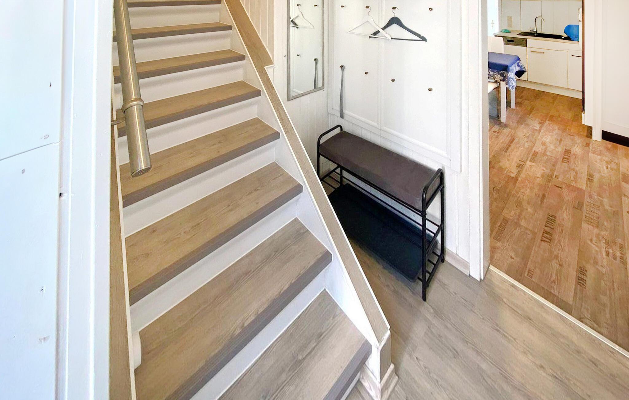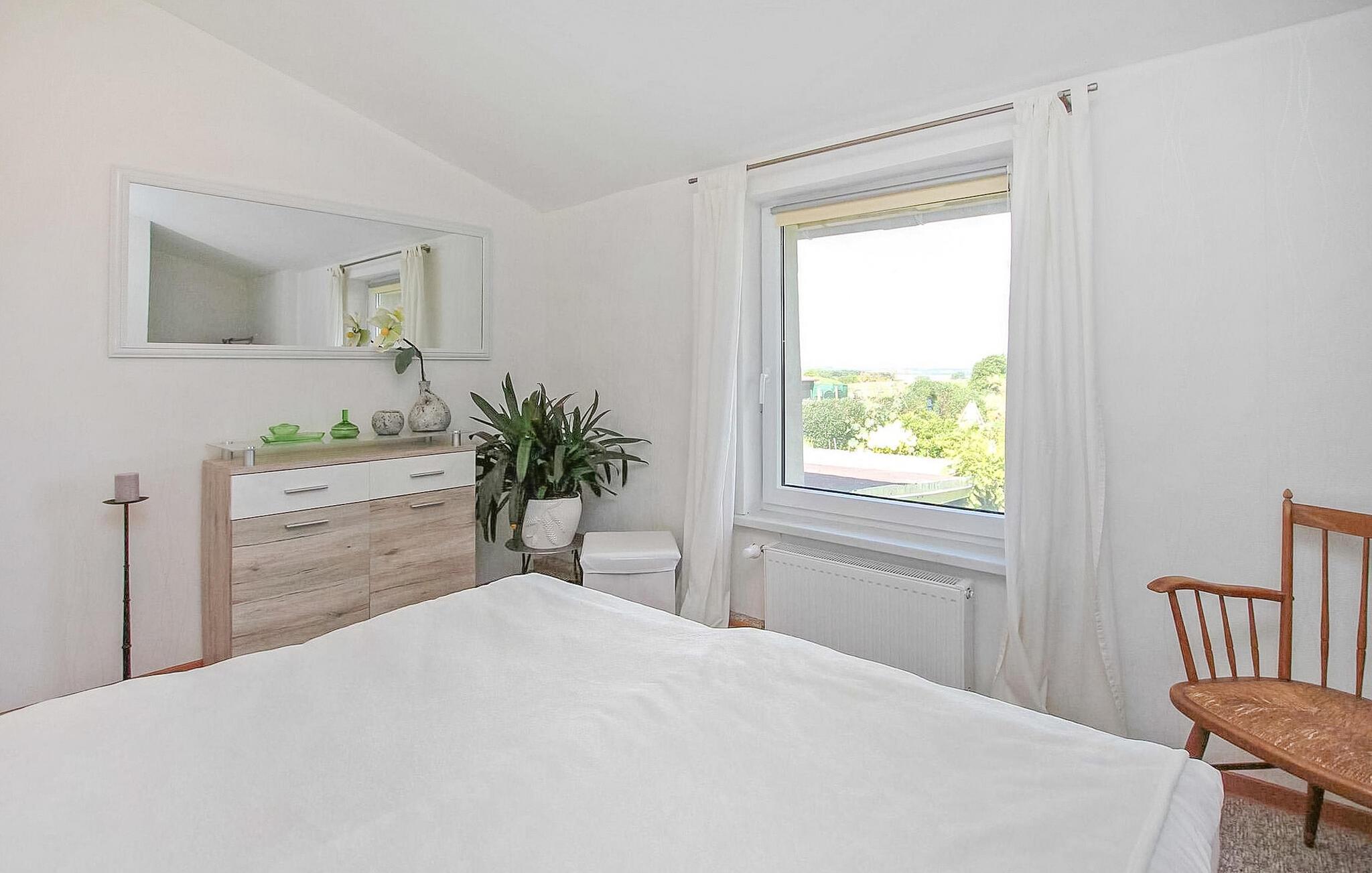 Die ca. 60 qm große, zentral beheizte Nichtraucher-Wohnung verfügt über einen separaten Eingang sowie Insektenschutz an den Fenstern und erstreckt sich über zwei Etagen. Im unteren Bereich befindet sich eine große, 2022 modernisierte Küche (Esstisch, E-Herd mit Backofen, Kühlschrank mit Gefriermöglichkeit, Geschirrspüler, Mikrowelle, div. Küchenkleingeräte) und dahinter das Bad (Dusche, WC, Waschmaschine). Über eine relativ steile Treppe sind das Wohnzimmer (Couch, Flachbild-TV) und zwei Schlafzimmer davon ein Durchgangszimmer -(jeweils mit Doppelbett und Seeblick) erreichbar. Zusätzlich stehen eine neue, überdachte und modern möblierte Terrasse, Parkplatz, Fahrrad-Unterstellmöglichkeiten, 2 Leihfahrräder gegen Gebühr, Grill und eine weitere schöne Sitzecke im Garten zur Verfügung.