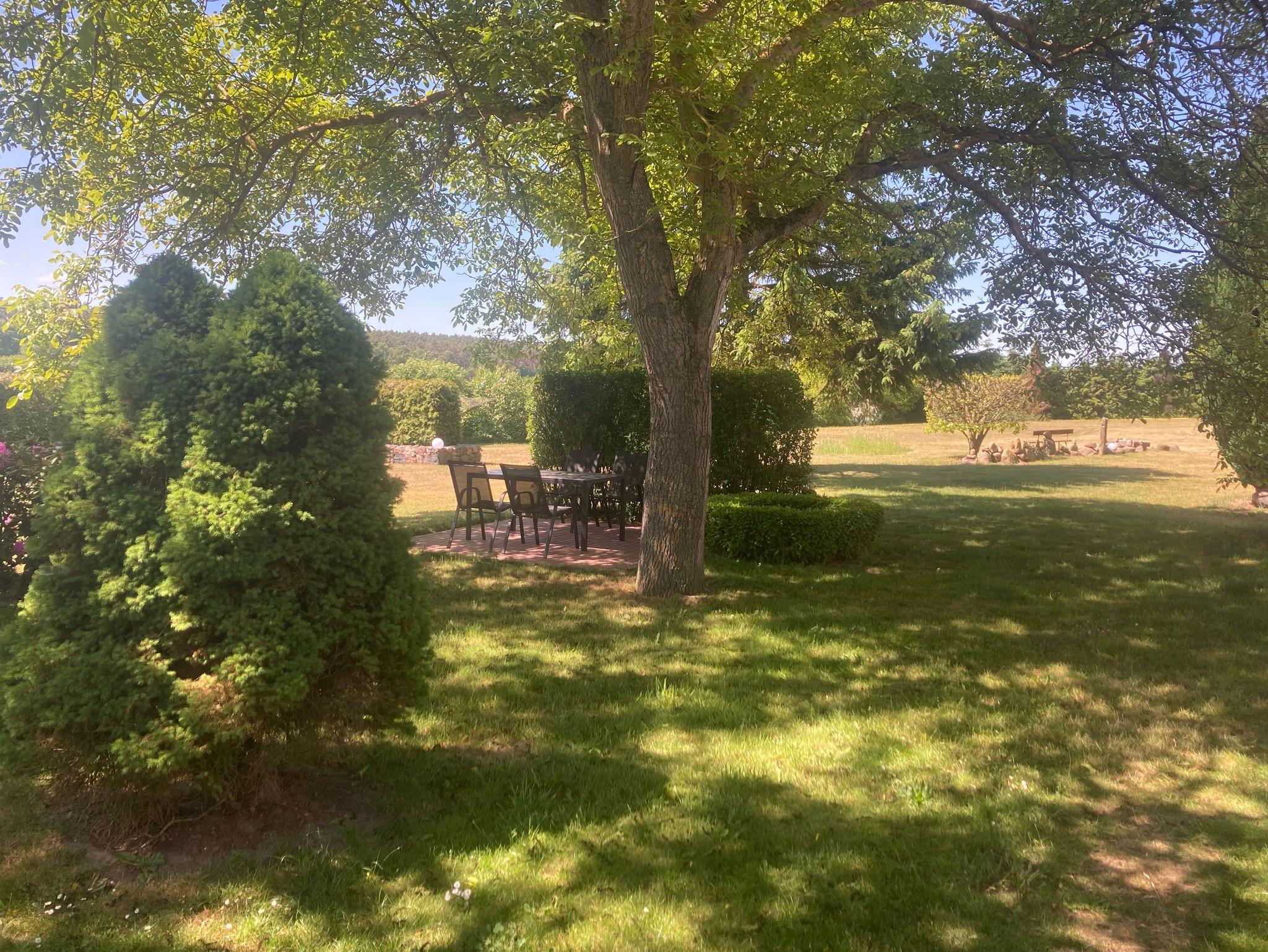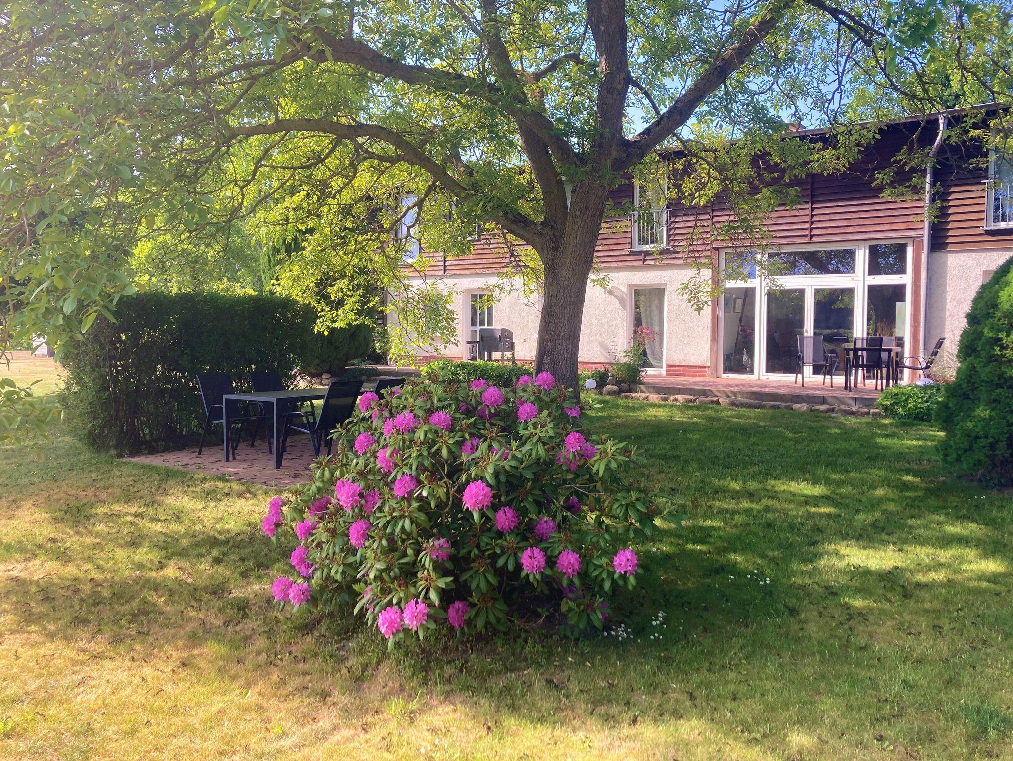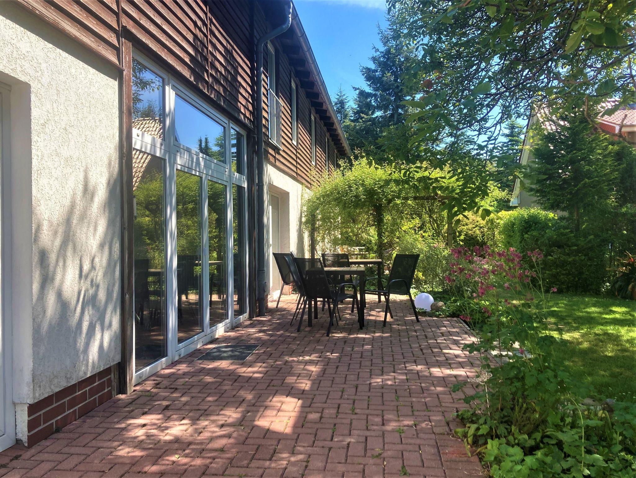 Die große Gemeinschaftsterrasse im Garten kann gern genutzt werden.