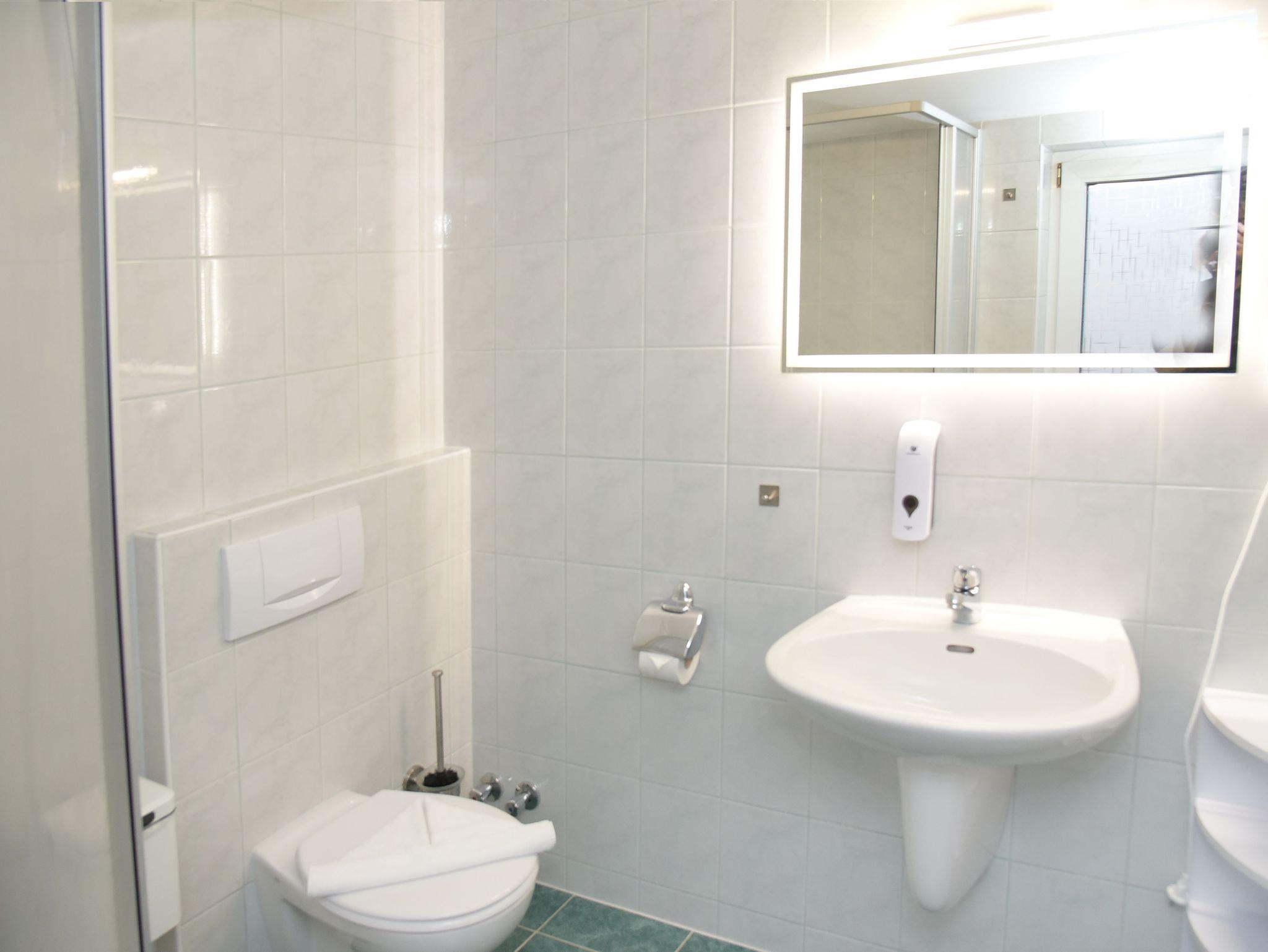 Wasserkocher, Toaster und Kaffeemaschine ausgestattet. Das Badezimmer