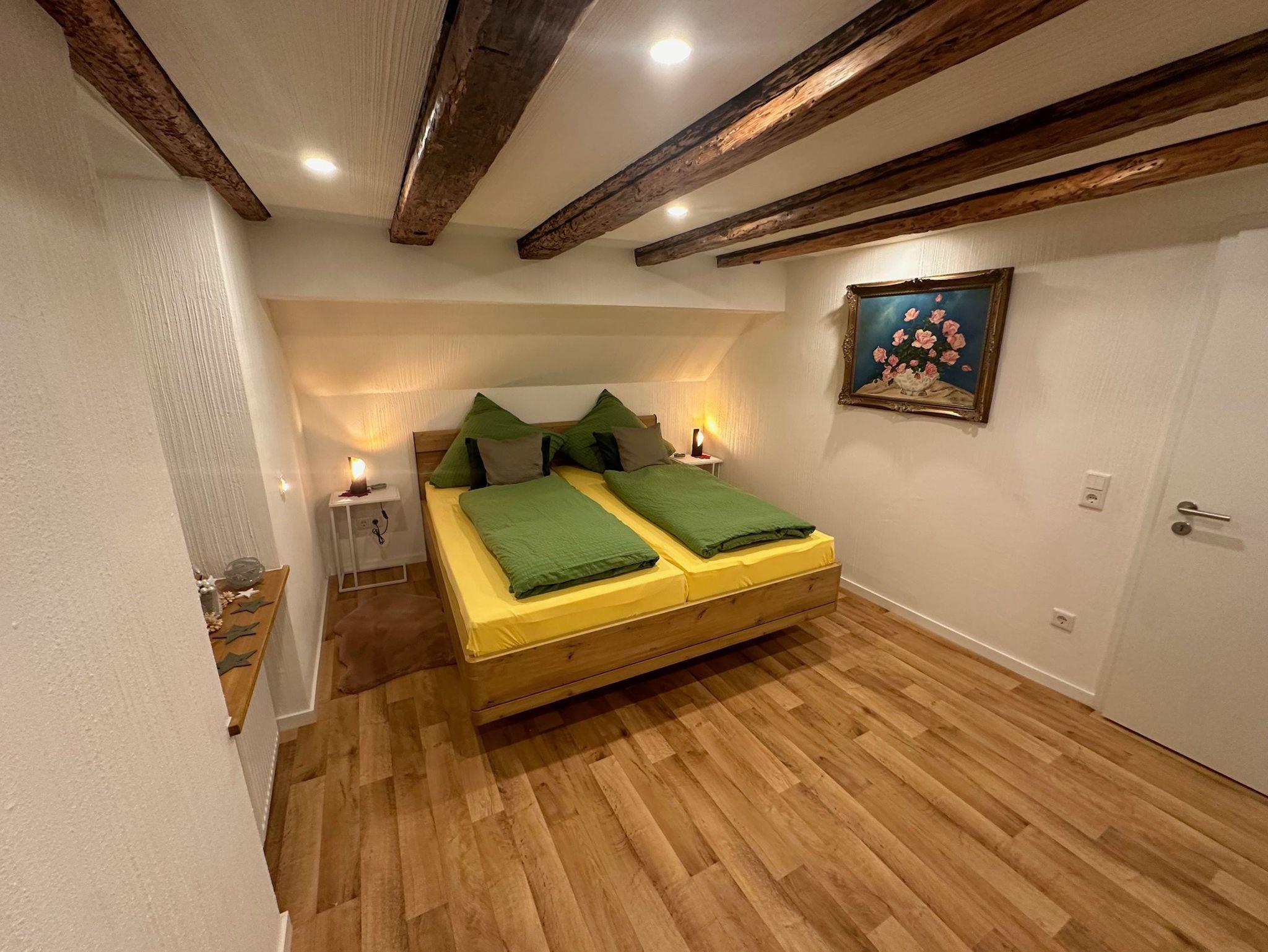 Im großzügigem Schlafzimmer gegenüber kommt die Holzbalkendecke zur vollen Ausstrahlung, besonders bei Sonnenuntergang. In dem gemütlichen Bett aus Eiche mit bequemer Betthöhe sowie komfortablen Matratzen in zwei Härtegraden und warmen Licht auf den Nachttischen lässt es sich träumen.