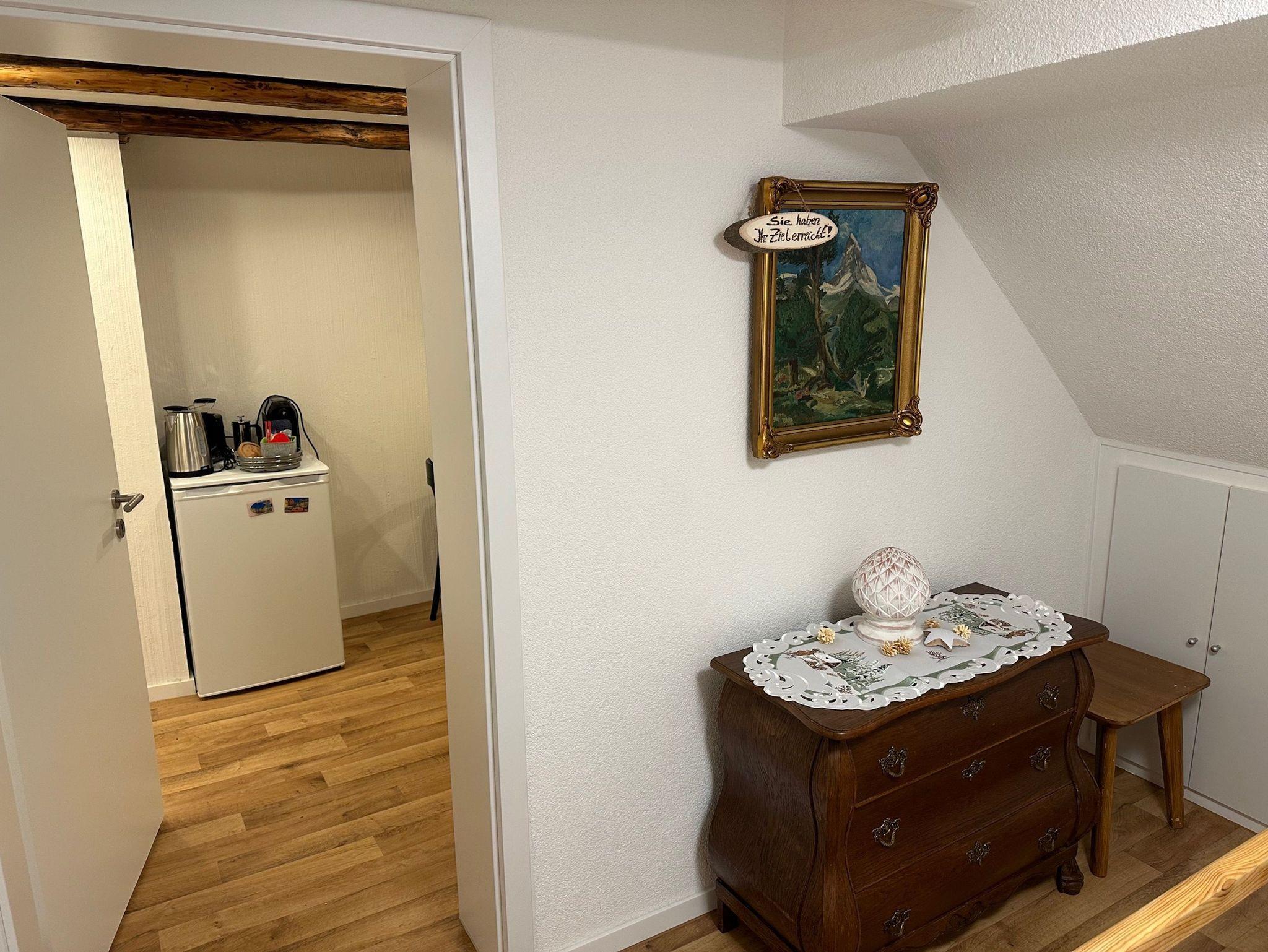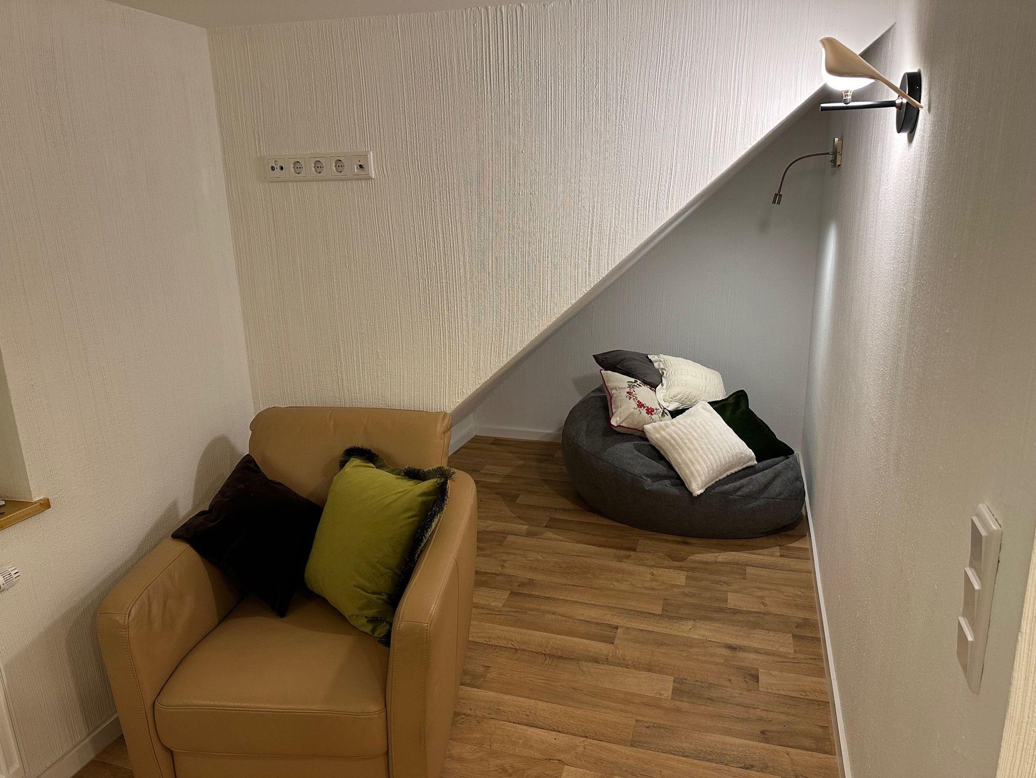 Die obere Ferienwohnung mit einer Fläche vom 50m2 erreicht man über eine renovierte Holztreppe mit kleinem Vorflur mit einer optionalen Abstellmöglichkeit für Schuhe und Koffer für längere Aufenthalte, ganz wie man möchte.