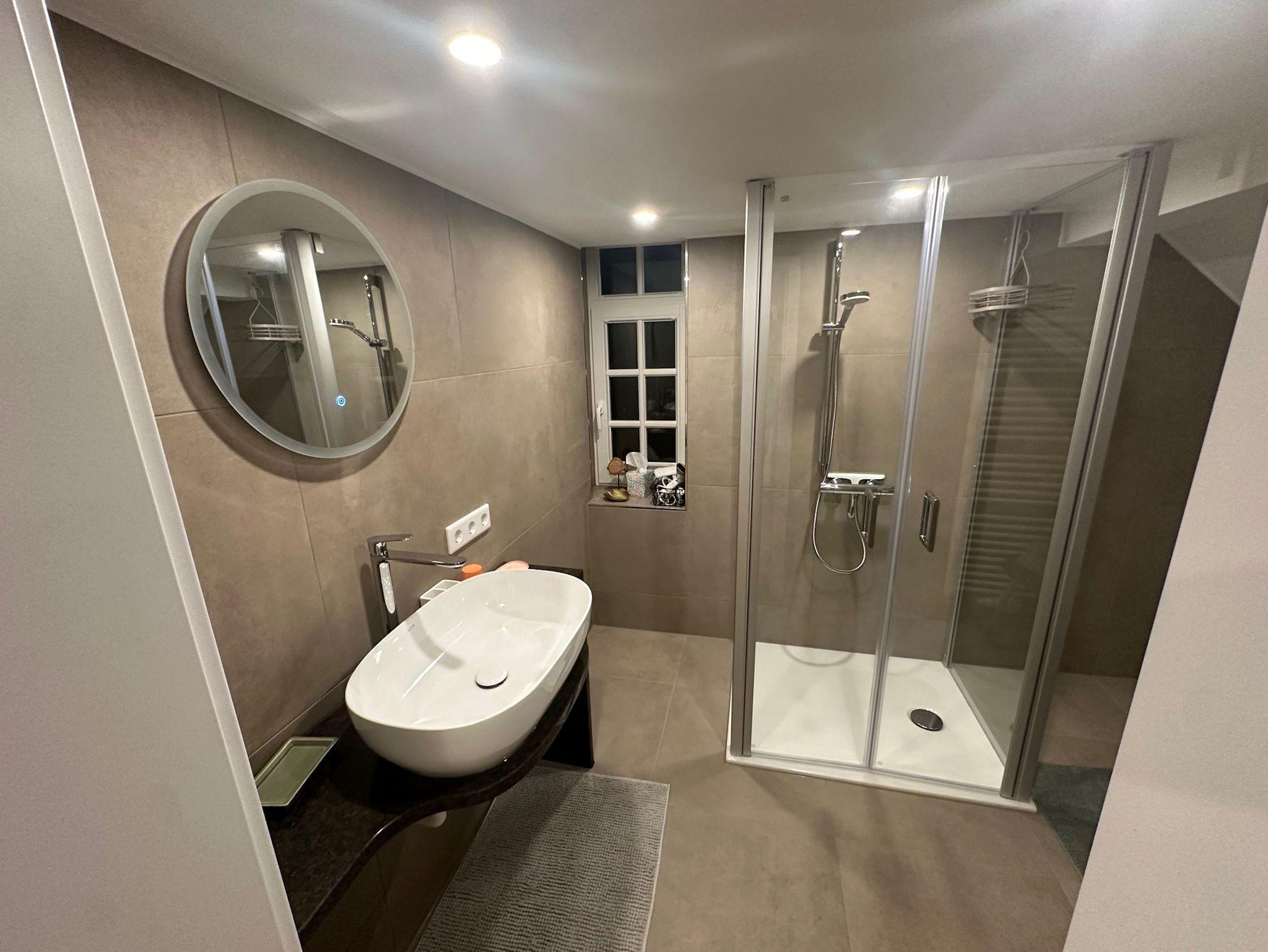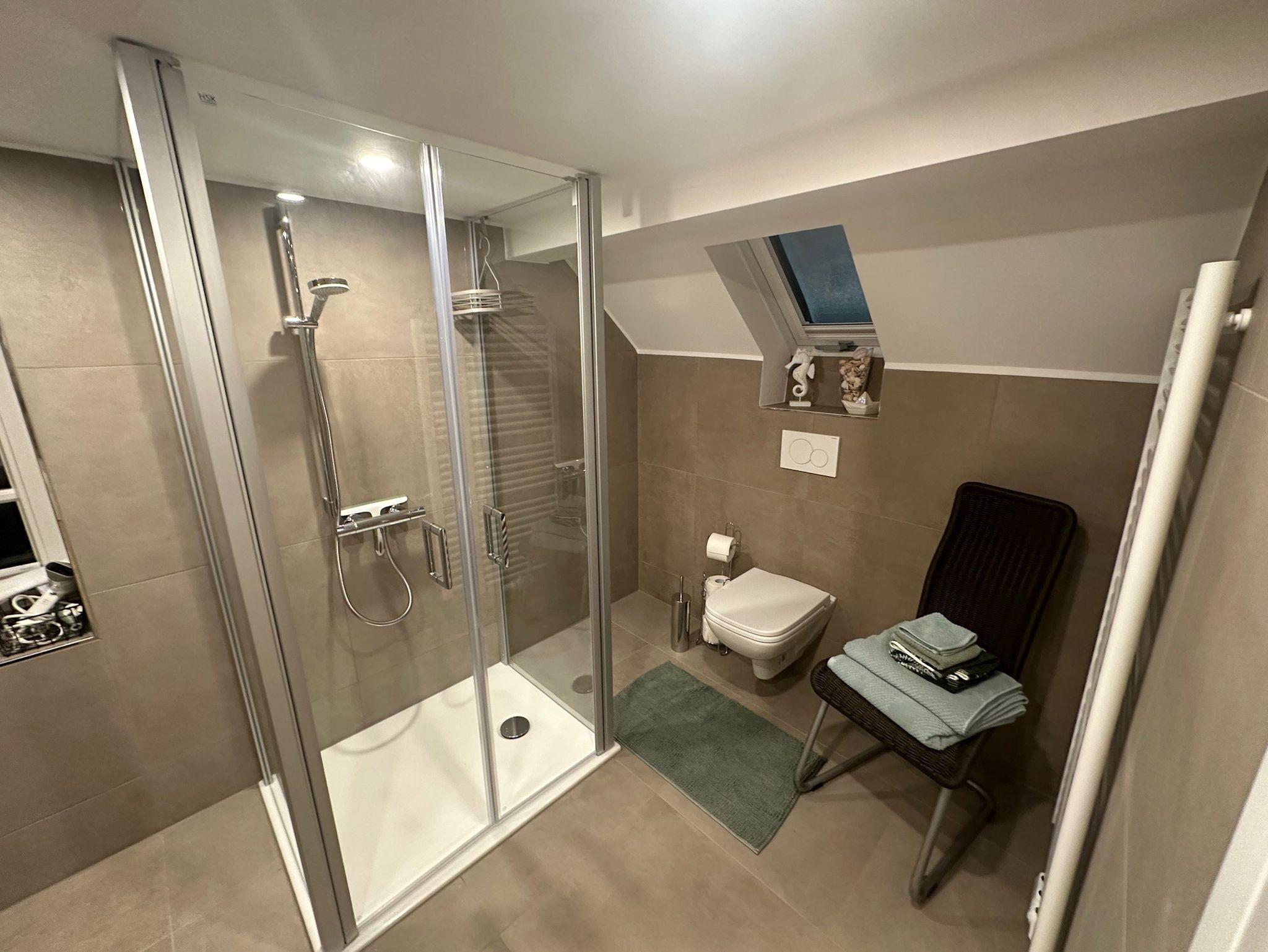 Das Bad ist baubedingt etwas kleiner, aber auch hier finden Sie eine ebene Duschwanne mit Glaswänden, eine Waschschale mit Chocolade-Granit-Ablagefläche, einen Handtuchwärmer, komfortabler Toilette und Plissee-Rollos vor.