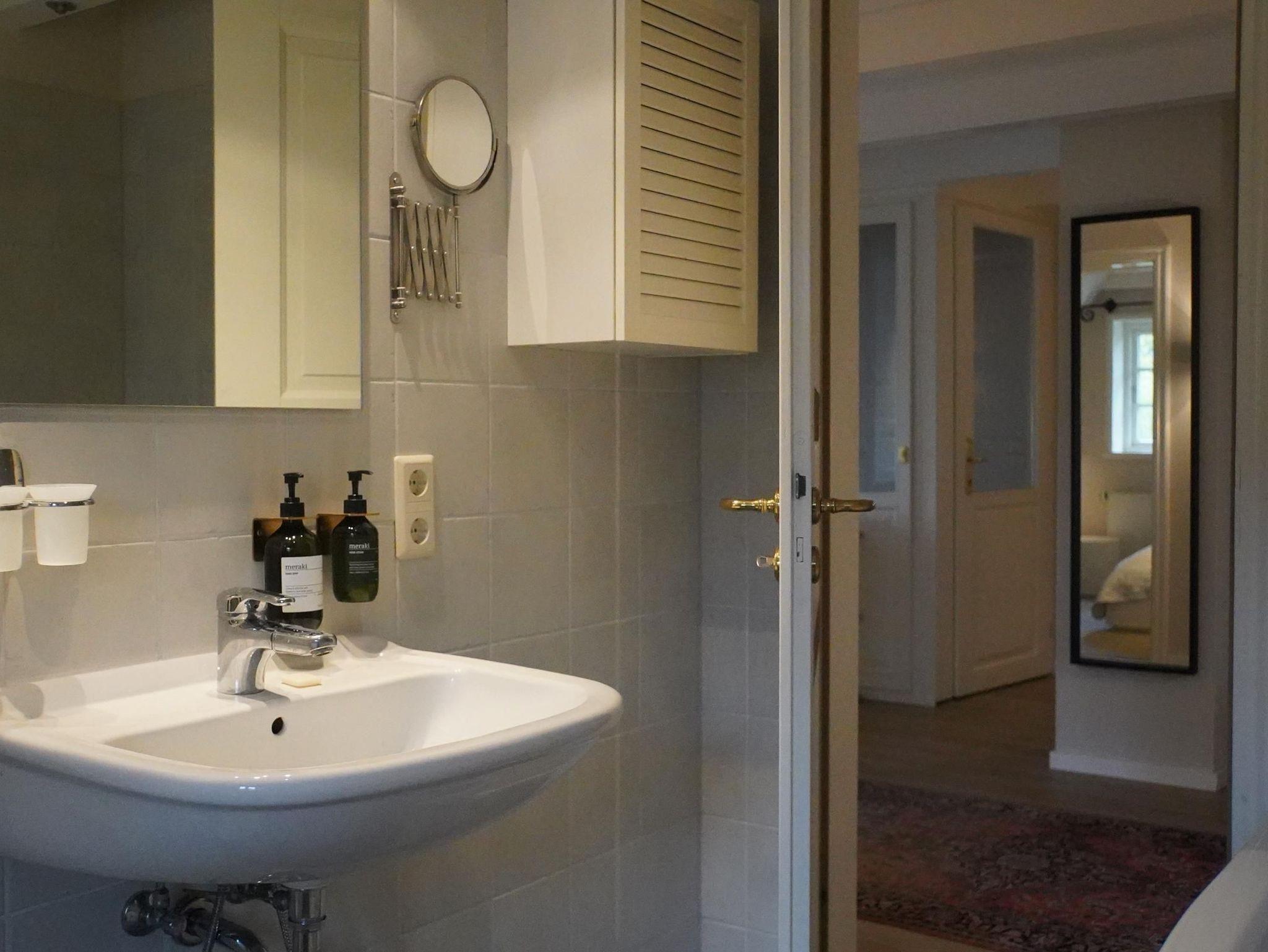 Sanitär: bodenebene Dusche, Föhn, Handtuchheizkörper, Schminkspiegel.
