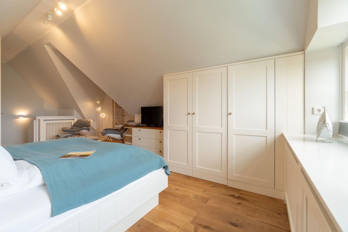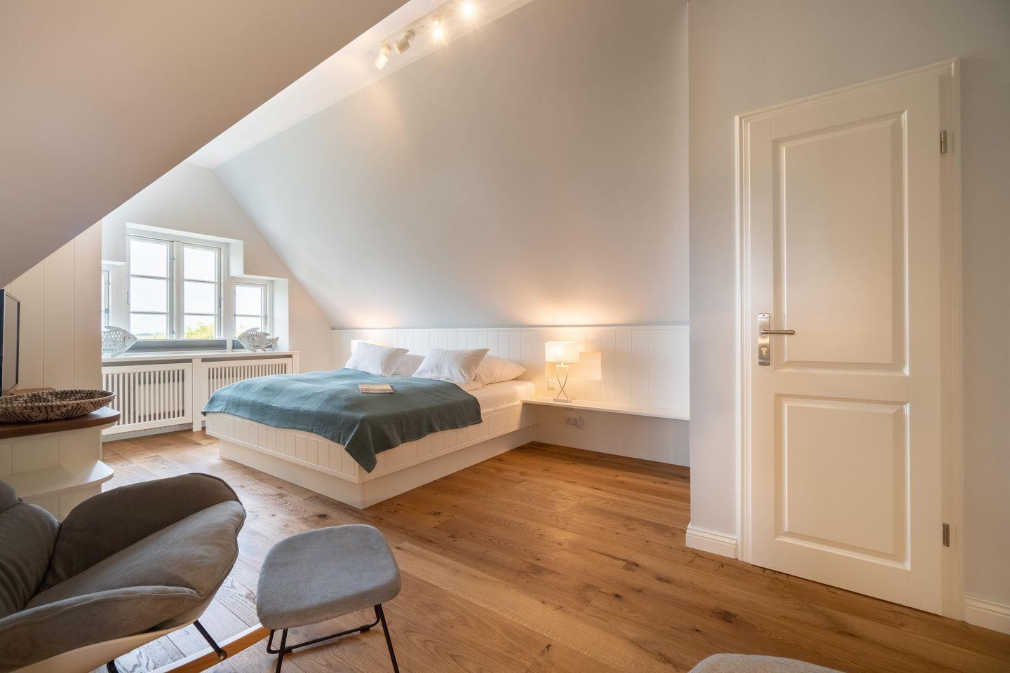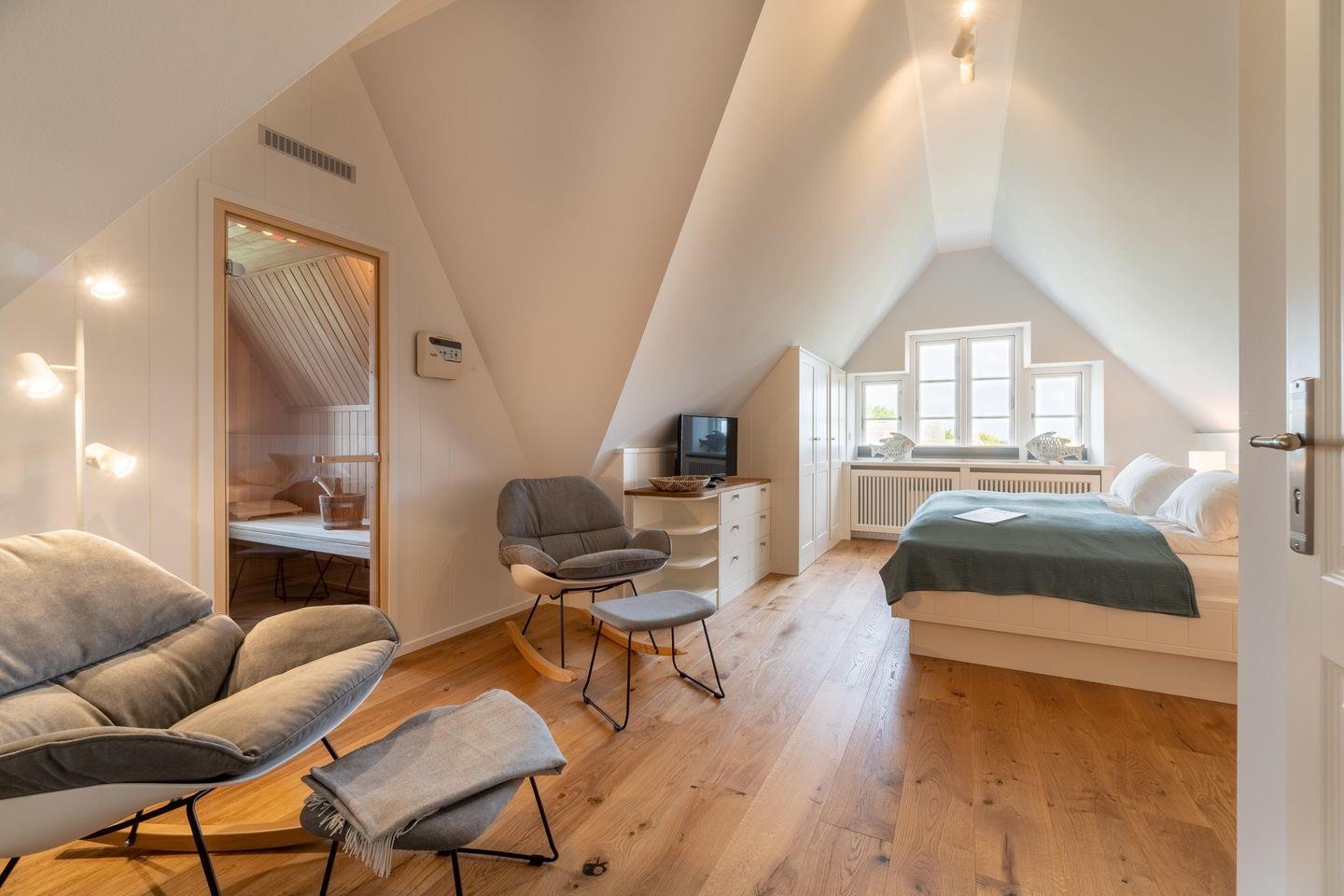 Das hohe Dachgeschoss strahlt nordisch noble Gemütlichkeit aus und lädt mit Sauna und zwei Relax-Sesseln im Ruhebereich zur Urlaubsentspannung ein. Ein großzügiger Schlafbereich mit Doppelbett (2,00m x 2,00m) befindet sich ebenfalls im Dachgeschoss.
