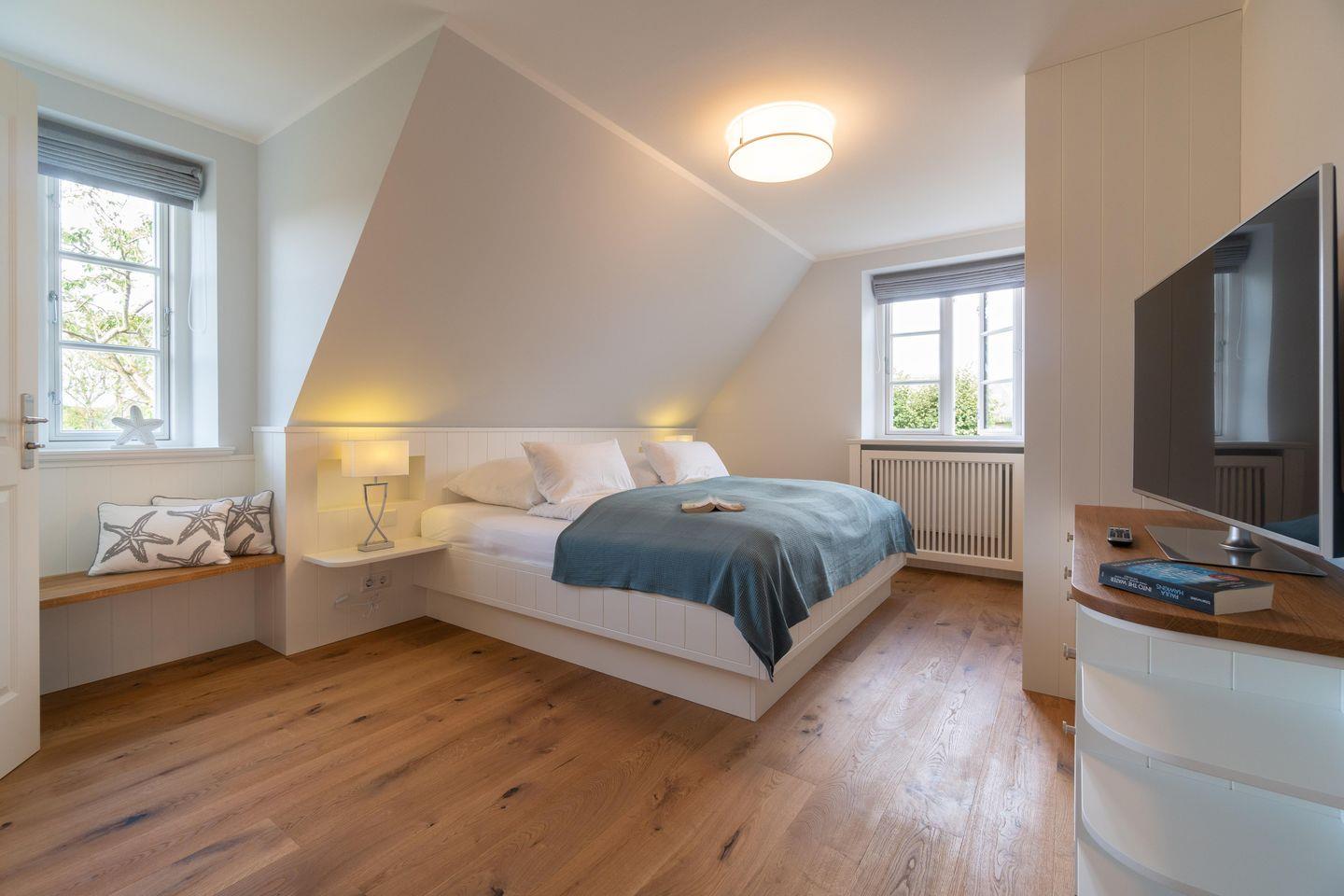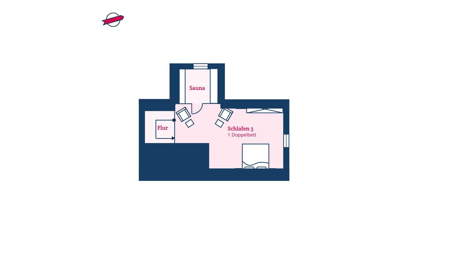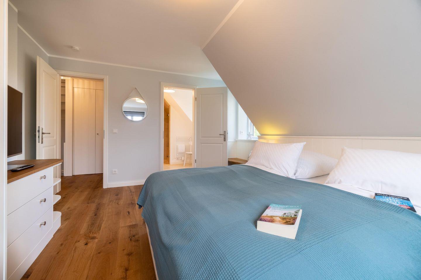Das hohe Dachgeschoss strahlt nordisch noble Gemütlichkeit aus und lädt mit Sauna und zwei Relax-Sesseln im Ruhebereich zur Urlaubsentspannung ein. Ein großzügiger Schlafbereich mit Doppelbett (2,00m x 2,00m) befindet sich ebenfalls im Dachgeschoss.