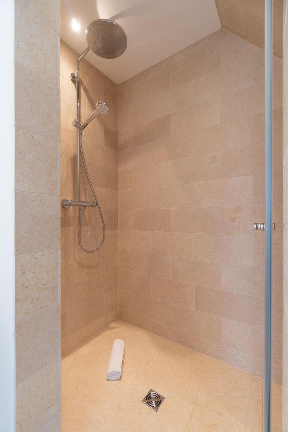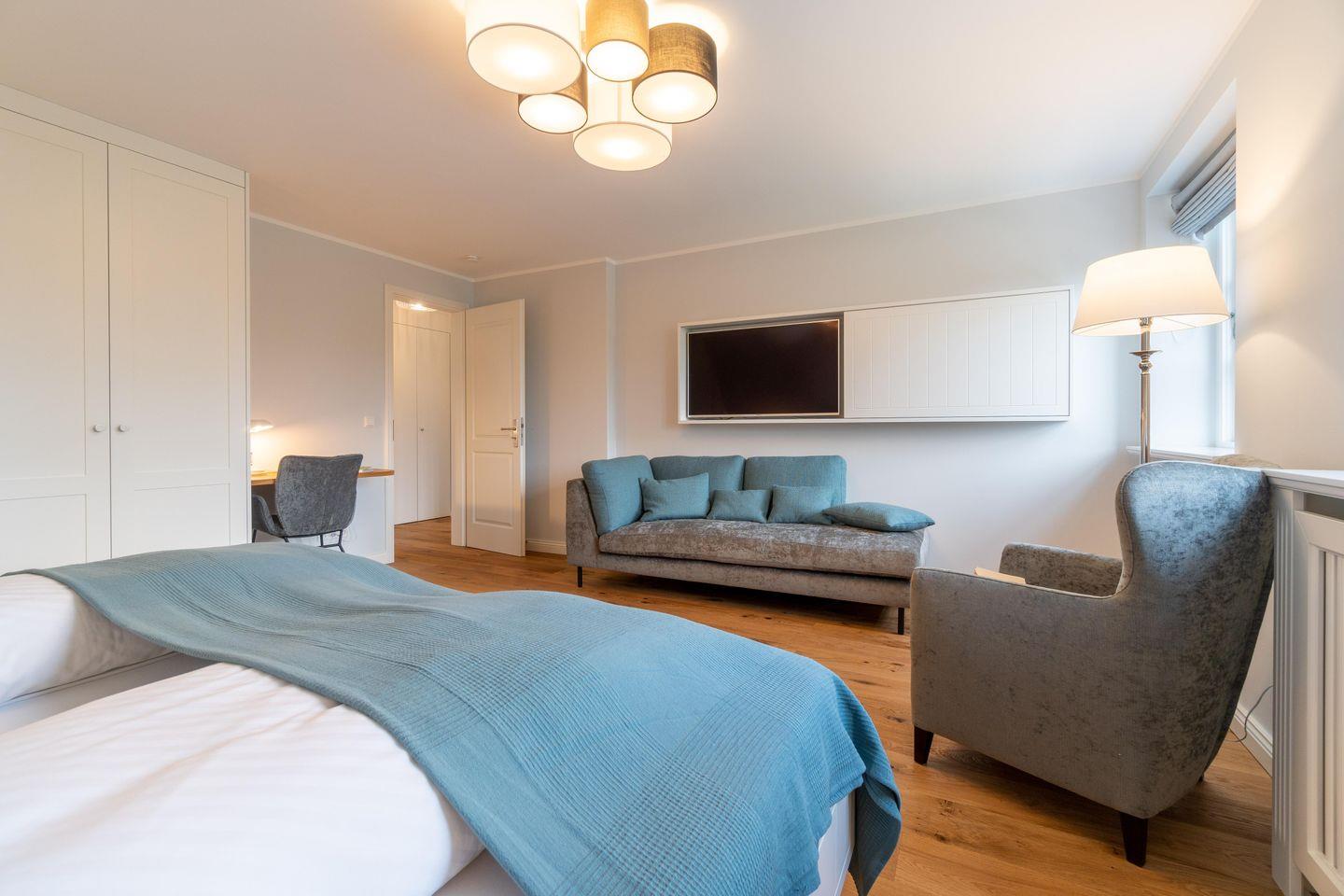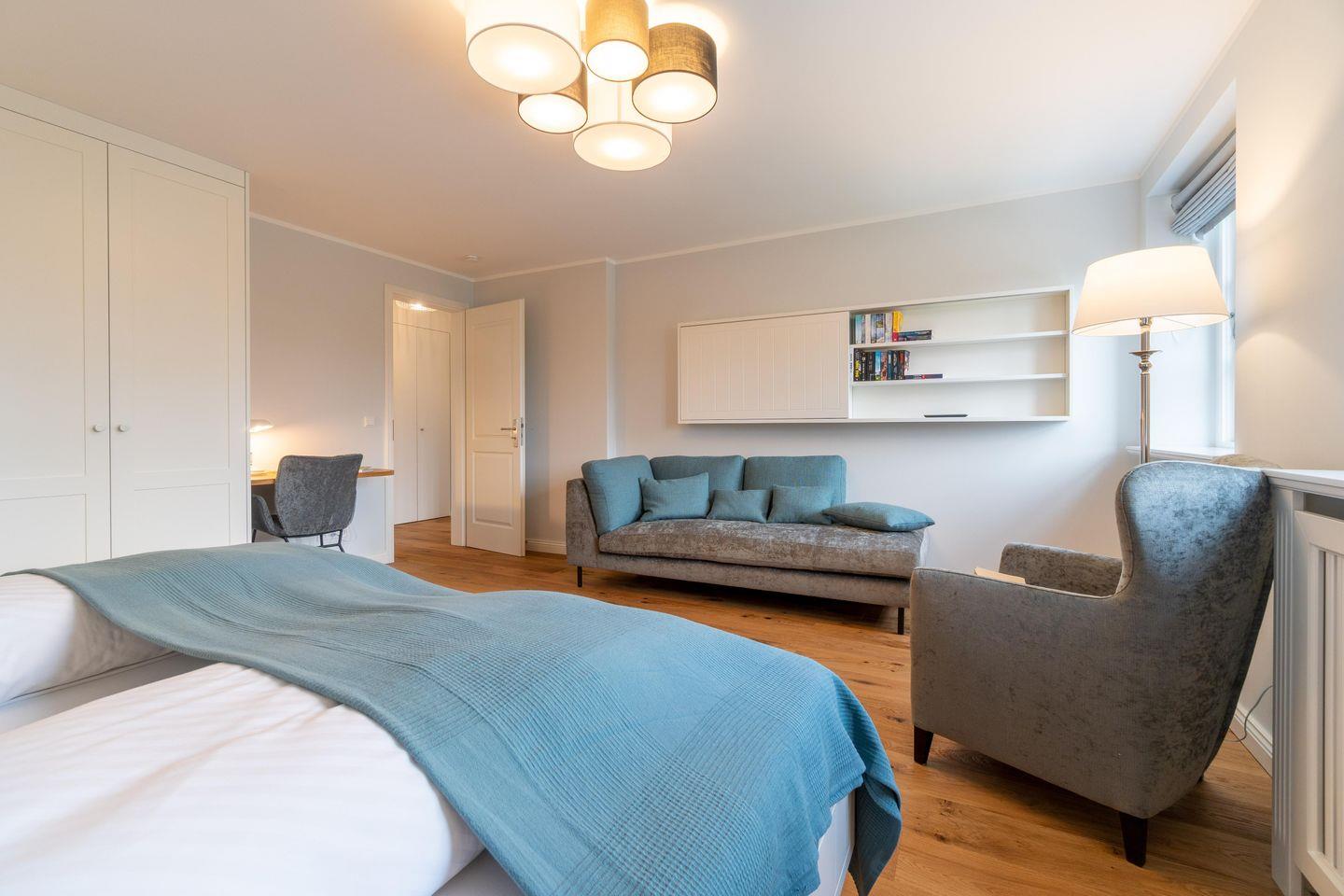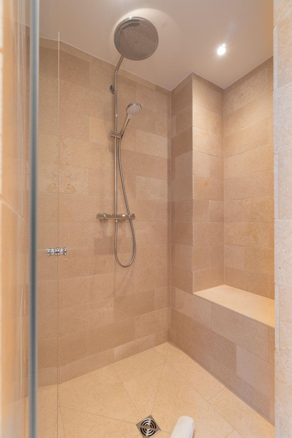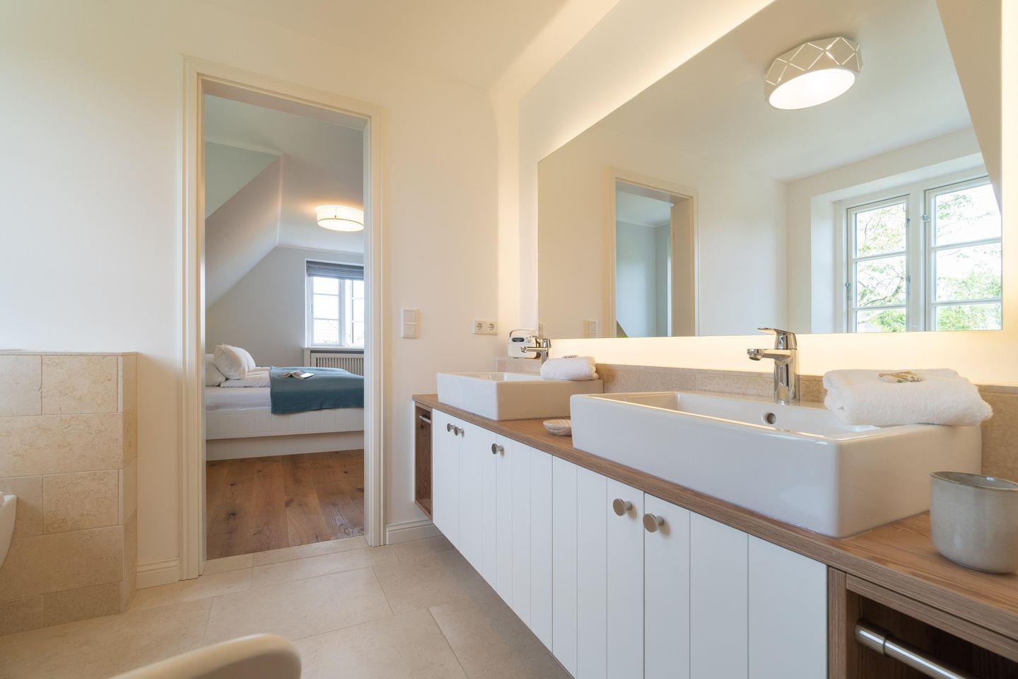 Im Obergeschoss befindet sich ein Schlafzimmer mit Doppelbett (2,00m x 2,00m) und einem en-suite Bad mit Dusche. Im großzügigen Masterbedroom (Doppelbett 2,00m x 2,00m) mit Récamière und Lesesessel befindet sich auch ein Arbeitsbereich. Direkt nebenan liegt ein weiteres Bad mit Dusche und Badewanne.