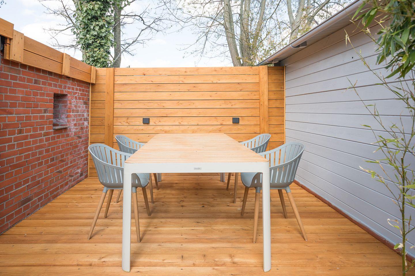 Auf der geschützten Terrasse stehen für Sie Gartenmöbel, Grill und Liegen bereit.