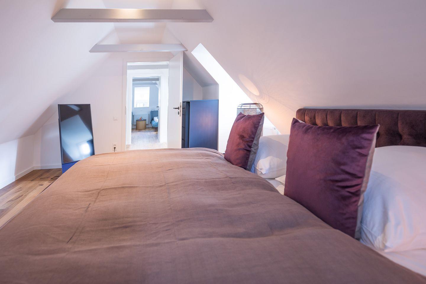 Das Ferienhaus verfügt über zwei Schlafzimmer, die beide über eine Treppe im Obergeschoss erreichbar sind. Die Betten (180 x 200 und 2x 90x 200) sind bei Ankunft liebevoll bezogen. Im größeren Schlafzimmer befindet sich ein TV.
