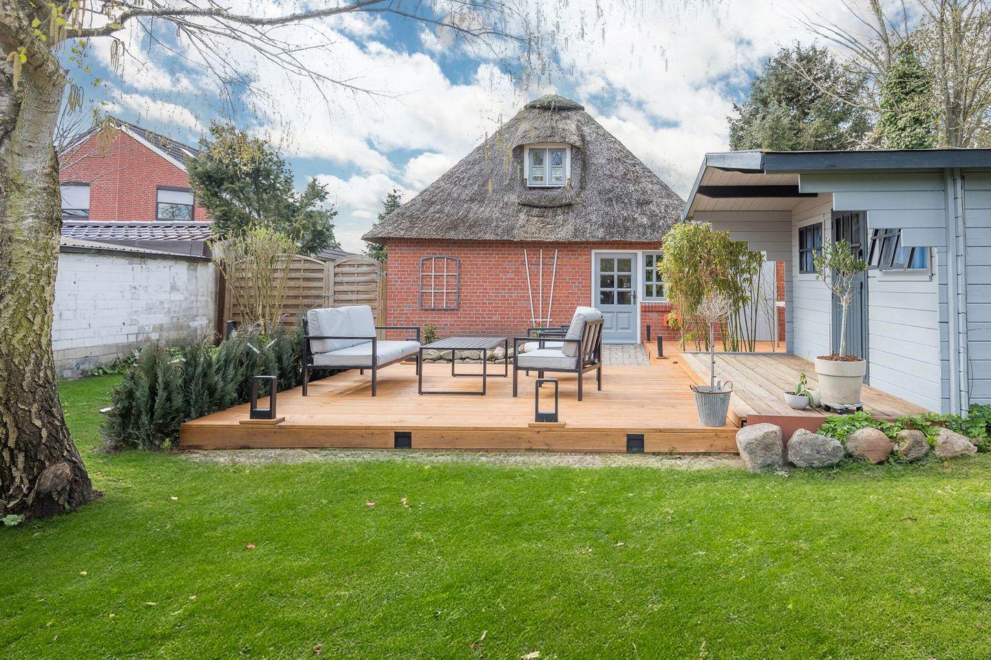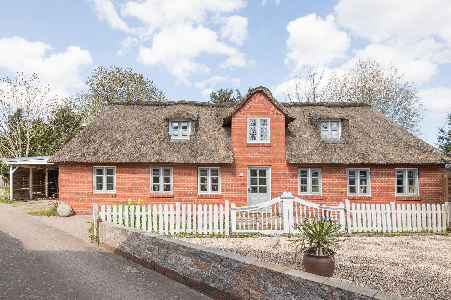 Modernes reetgedecktes Ferienhaus in Mildstedt mit Terrasse, WLAN und Gartenmöbeln, ideal für Familien und vierbeinige Freunde.