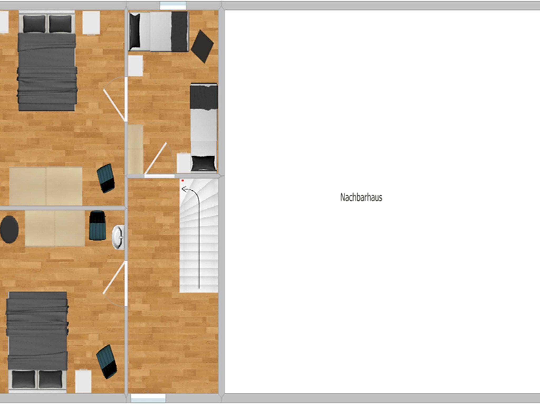 Es gibt drei Schlafzimmer: Zwei mit je einem Doppelbett und ein weiteres Zimmer mit zwei Einzelbetten (Durchgangszimmer zu einem der beiden Doppelzimmer). Auf der Galerie der oberen Etage kann bei Bedarf eine Person auf einem Zusatzbett schlafen.