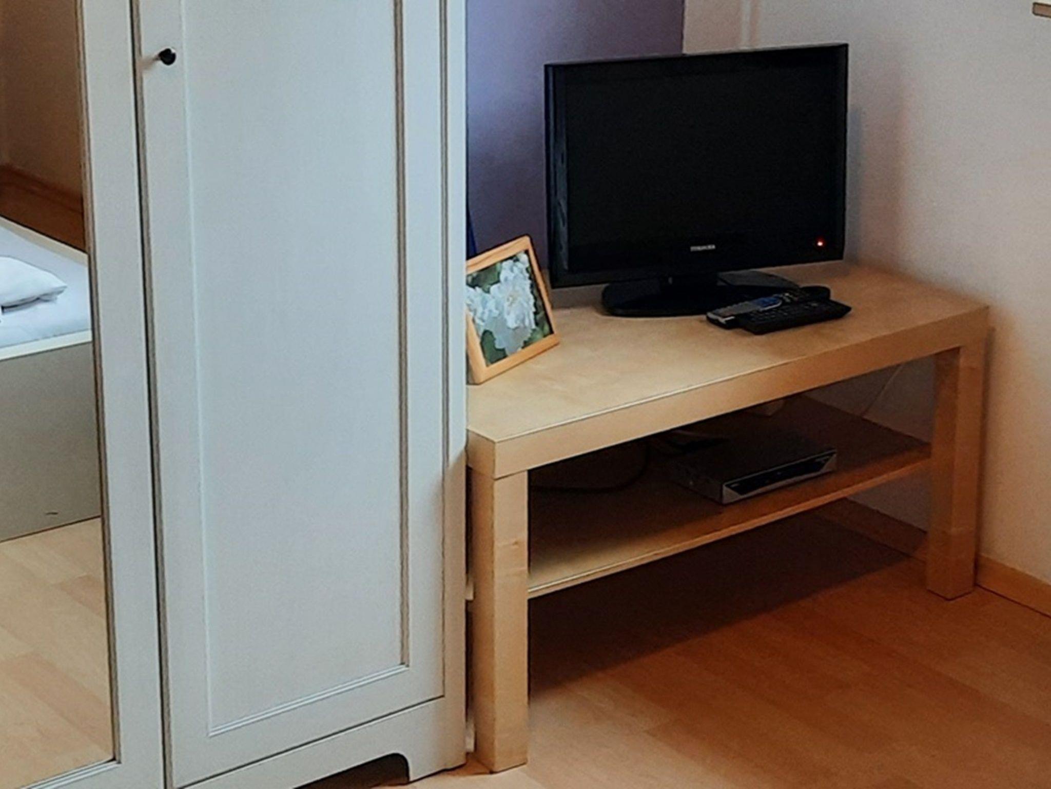 Ein Doppelzimmer verfügt über ein zusätzliches kleines TV-Gerät und DVD-Player.