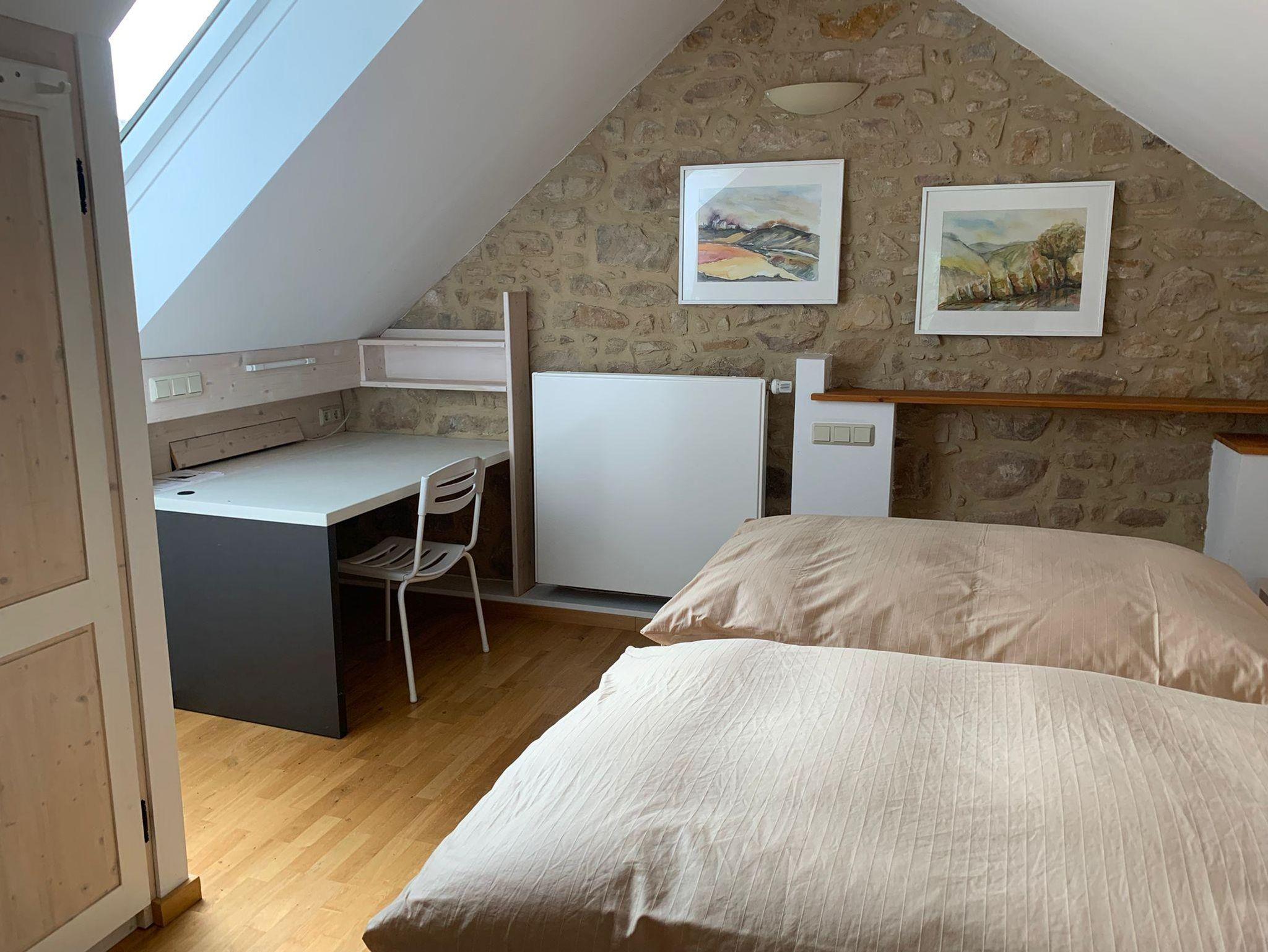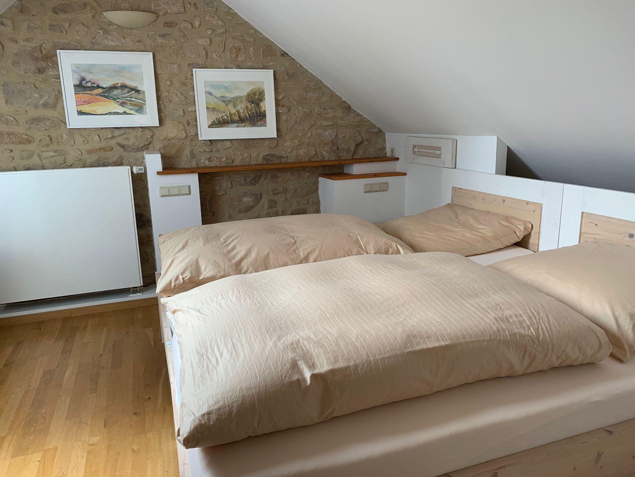 Willkommen in der Ferienwohnung Steinhauser im alten Winzerhaus. Begleiten Sie uns vom Hof (mit Parkmöglichkeit) nach oben auf die große, teilweise überdachte Terrasse, die einen tollen Blick auf den Übergang vom Garten zum Wald bietet. Genießen Sie hier einen entspannten Abend bei einem schönen Glas Pfälzer Wein. Von der Terrasse gelangen Sie in das großzügige Wohnzimmer, gestaltet in einer Kombination aus Alt und Neu, ein Konzept, das sich mehrfach wiederholt. Die großzügige Eckcouch lädt zum entspannten Beieinandersitzen oder auch zum Fernsehen ein. Vom Wohnzimmer mit Ausgang zu der zweiten, kleineren, überdachten Terrasse an der Westseite, mit Blick über den Garten in den sich daran anschließenden Wald, gelangen Sie über die geschwungene Treppe in das Schlafzimmer mit Doppelbett (auch getrennt stellbar, offene Fussteile) im Obergeschoss. Hier haben Sie aus 2 Fenstern einen schönen Ausblick auf den Pfälzerwald. Wieder zurück im Wohnzimmer, geht es weiter in die Wohnküche. Hier finden Sie neben der üblichen Küchenzeile einen Esstisch für 4 Personen und eine bequeme Couch zum gemütlichen Fernsehen. Dann geht es weiter in das Tageslichtbad mit Badewanne, Waschbecken und WC. Daneben befindet sich das 2. Schlafzimmer mit 2 Betten (auch hier offene Fussteile) und großem Einbauschrank. Bei einem kleinen Rundgang können Sie vom auf verschiedenen Ebenen angelegten Garten weite Ausblicke über die schöne Pfalz genießen.