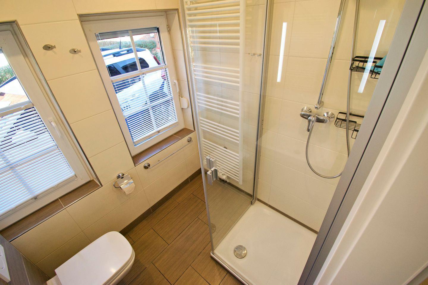 Ein eigener Pkw-Stellplatz befindet sich direkt vor der Haustür. Die Terrasse bietet einen schönen Blick in die Natur und ist mit einem Strandkorb sowie einem Gartentisch mit Stühlen ausgestattet. Die überdachte Fläche lädt zum Verweilen ein. Fahrräder können bequem im Gartenhaus untergestellt werden.