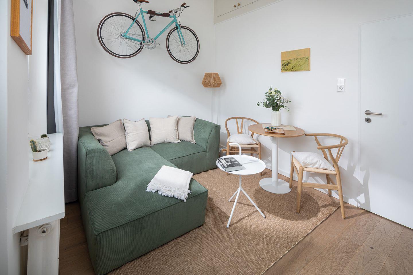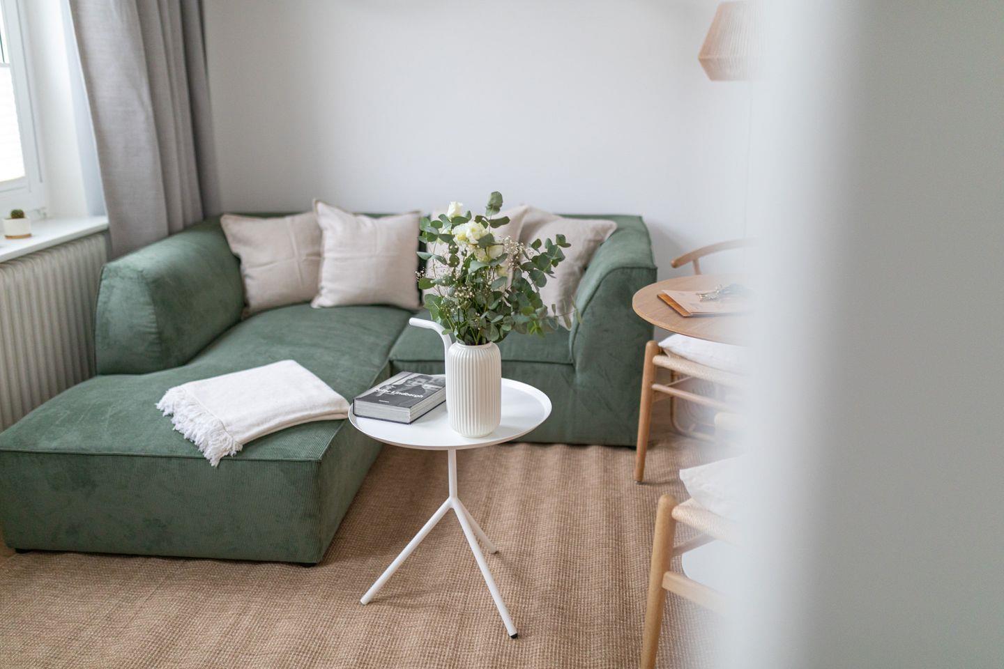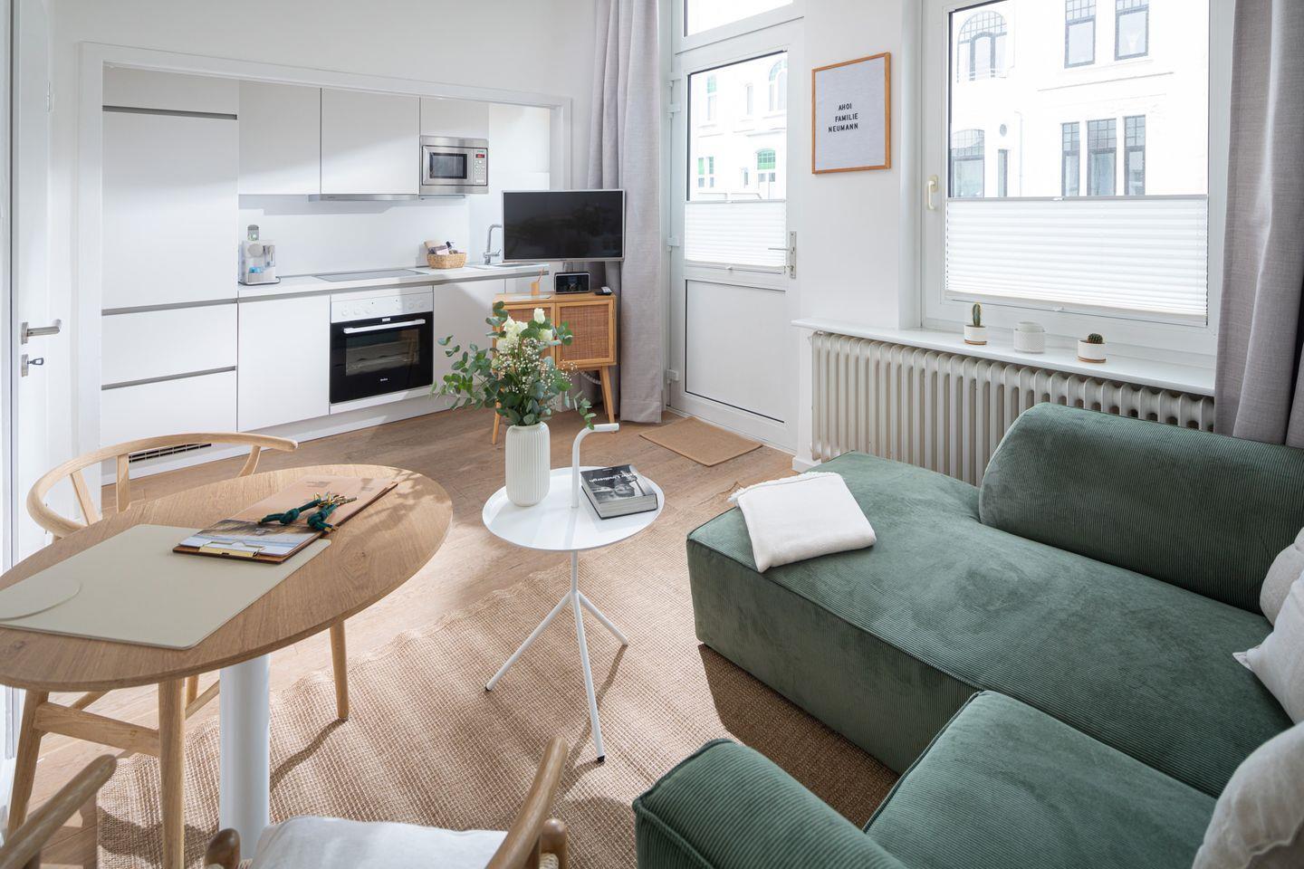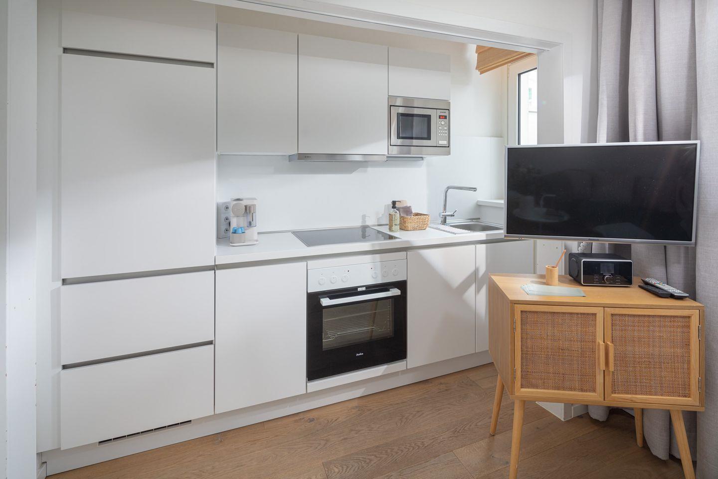 Im offenen Wohnzimmer mit integrierter Küche erwartet Sie eine voll ausgestattete Küche mit Kühlschrank, Gefrierfach, Backofen, Mikrowelle, Ceranfeld, Kaffeemaschine und einer Nespresso-Kapselmaschine. Der große Fernseher lädt zu gemütlichen Abenden ein.