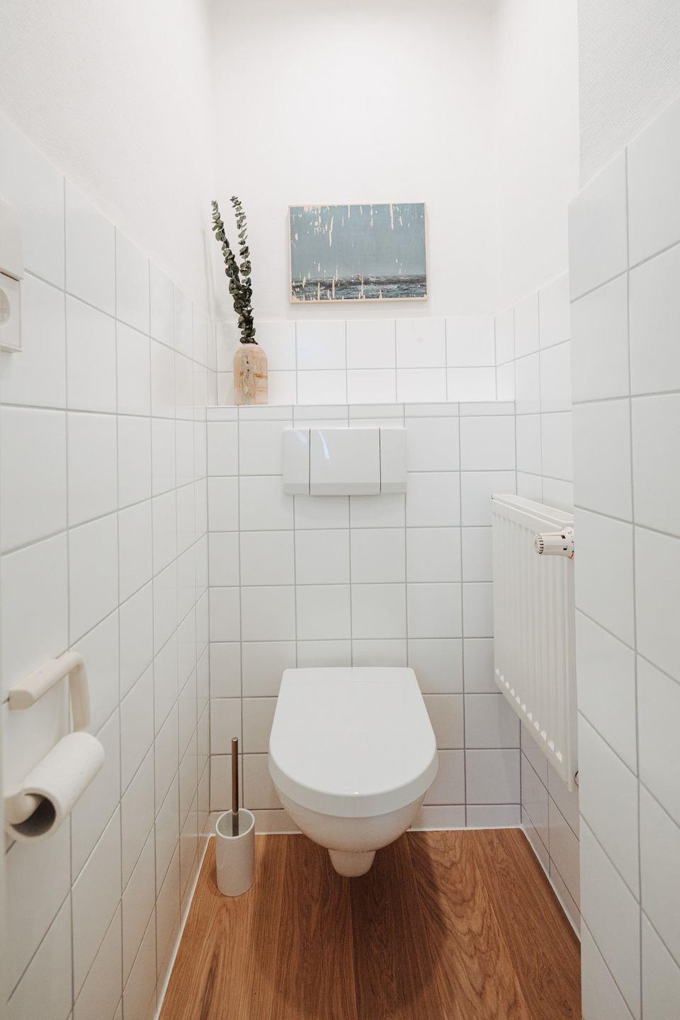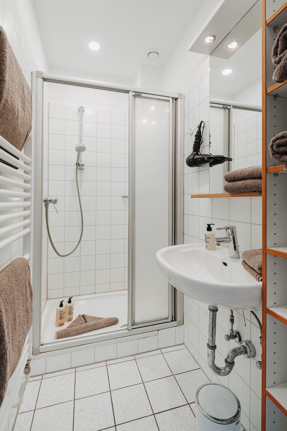 Die Wohnung beeindruckt mit einem Schlafzimmer, ausgestattet mit einem großzügigen Boxspringbett der Größe 180x200cm, das höchsten Schlafkomfort verspricht. Das Badezimmer verfügt über eine Dusche sowie ein Waschbecken, während die separate Toilette zusätzliche Privatsphäre bietet.