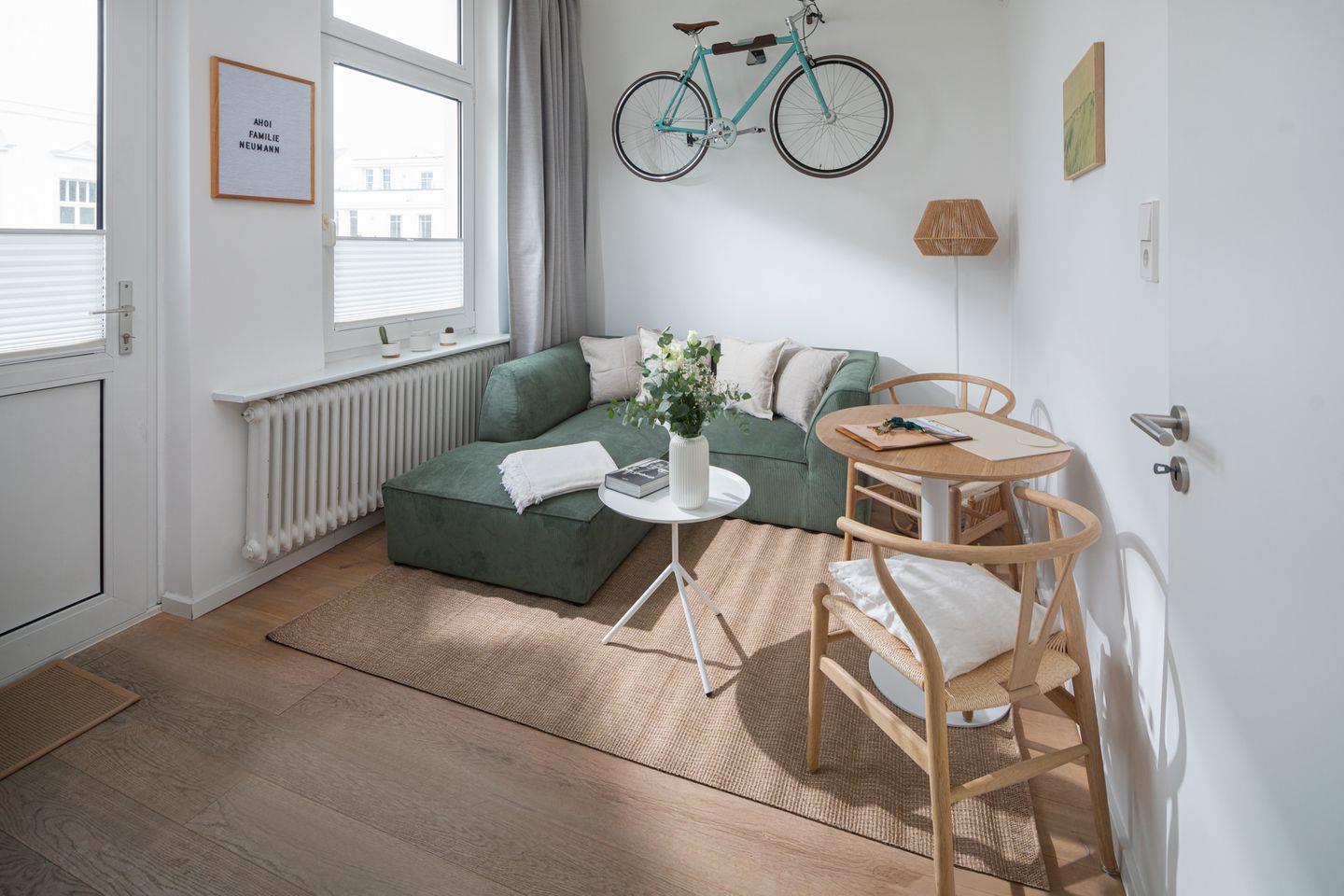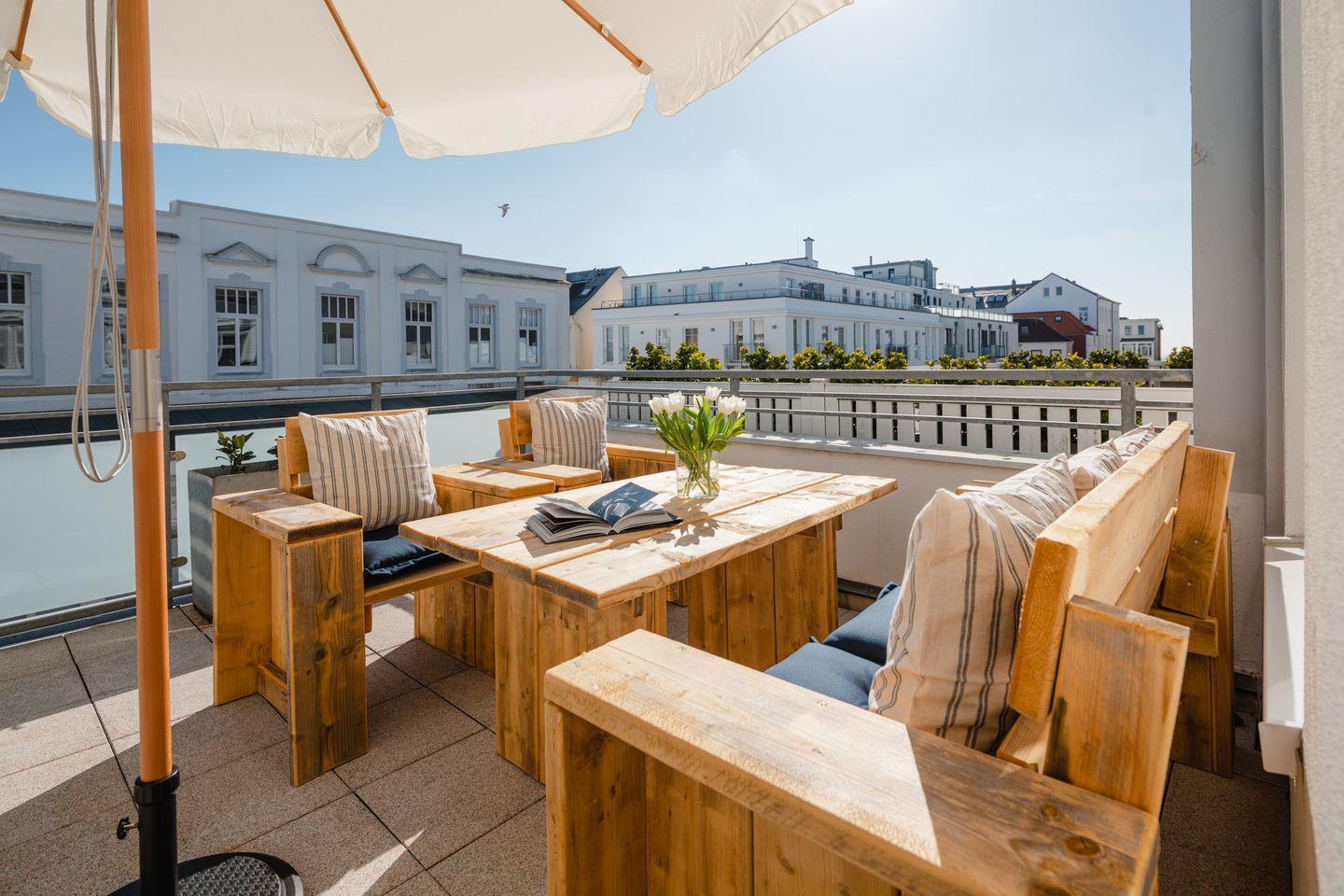 Ein absolutes Highlight dieser Ferienwohnung ist der großzügige Balkon mit exakter südlicher Ausrichtung, der eine Fläche von etwa 20 Quadratmetern umfasst. Hier können Sie auf einer stilvollen Holzsitzgruppe entspannen, die Sonne auf den beiden Liegen genießen und sich unter dem Sonnenschirm zurückziehen. Der skandinavische Einrichtungsstil verleiht der Wohnung eine besondere Wohlfühlatmosphäre.