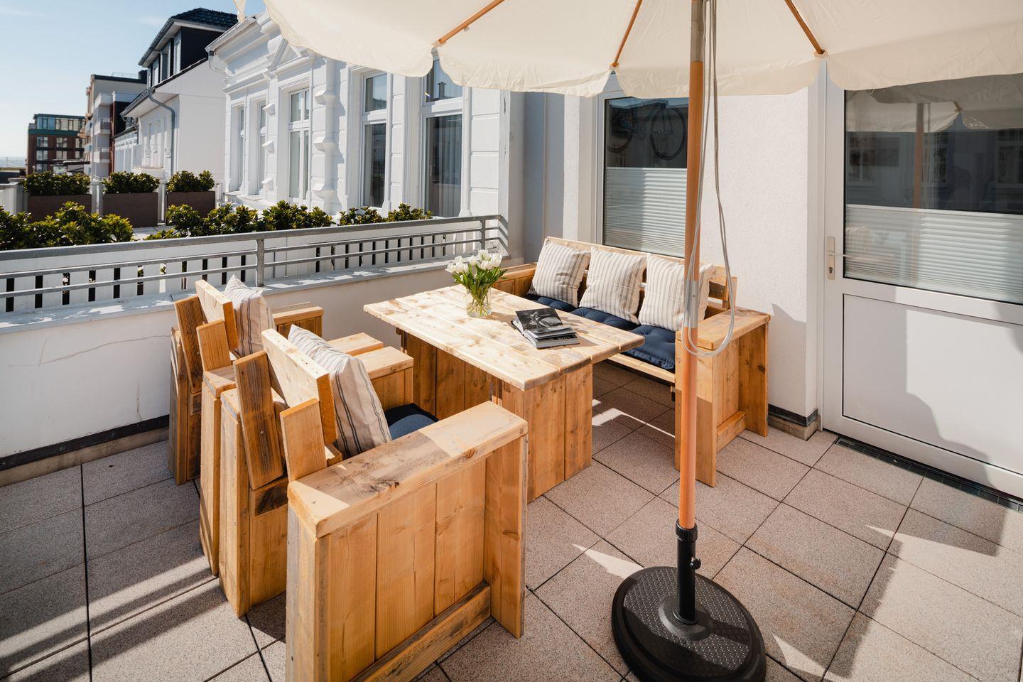 Hier beginnt Urlaub. Genießen Sie das sonnige Wetter und die frische Nordseeluft auf der großzügigen Terrasse.