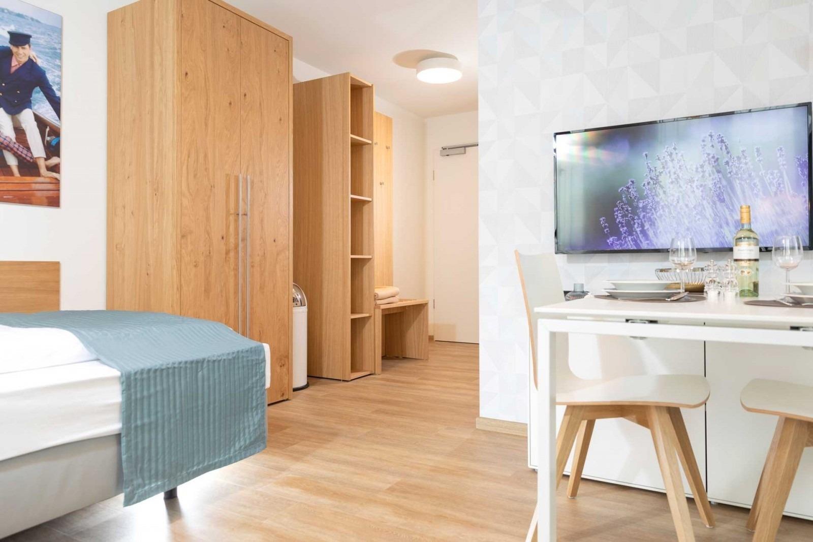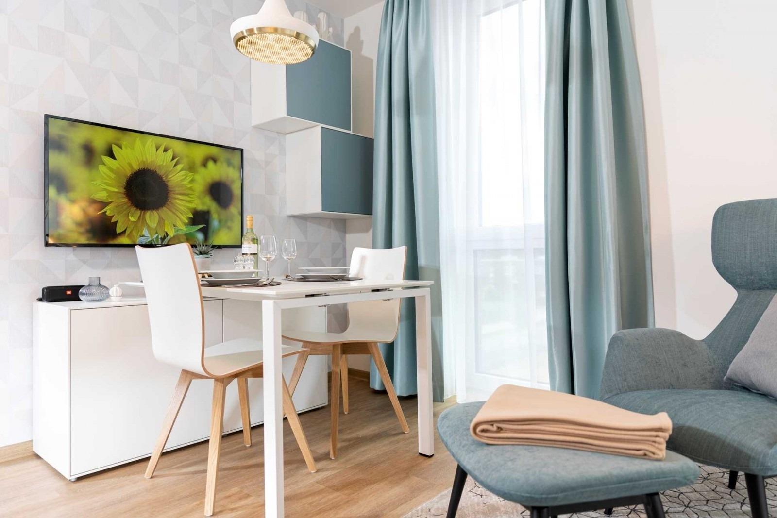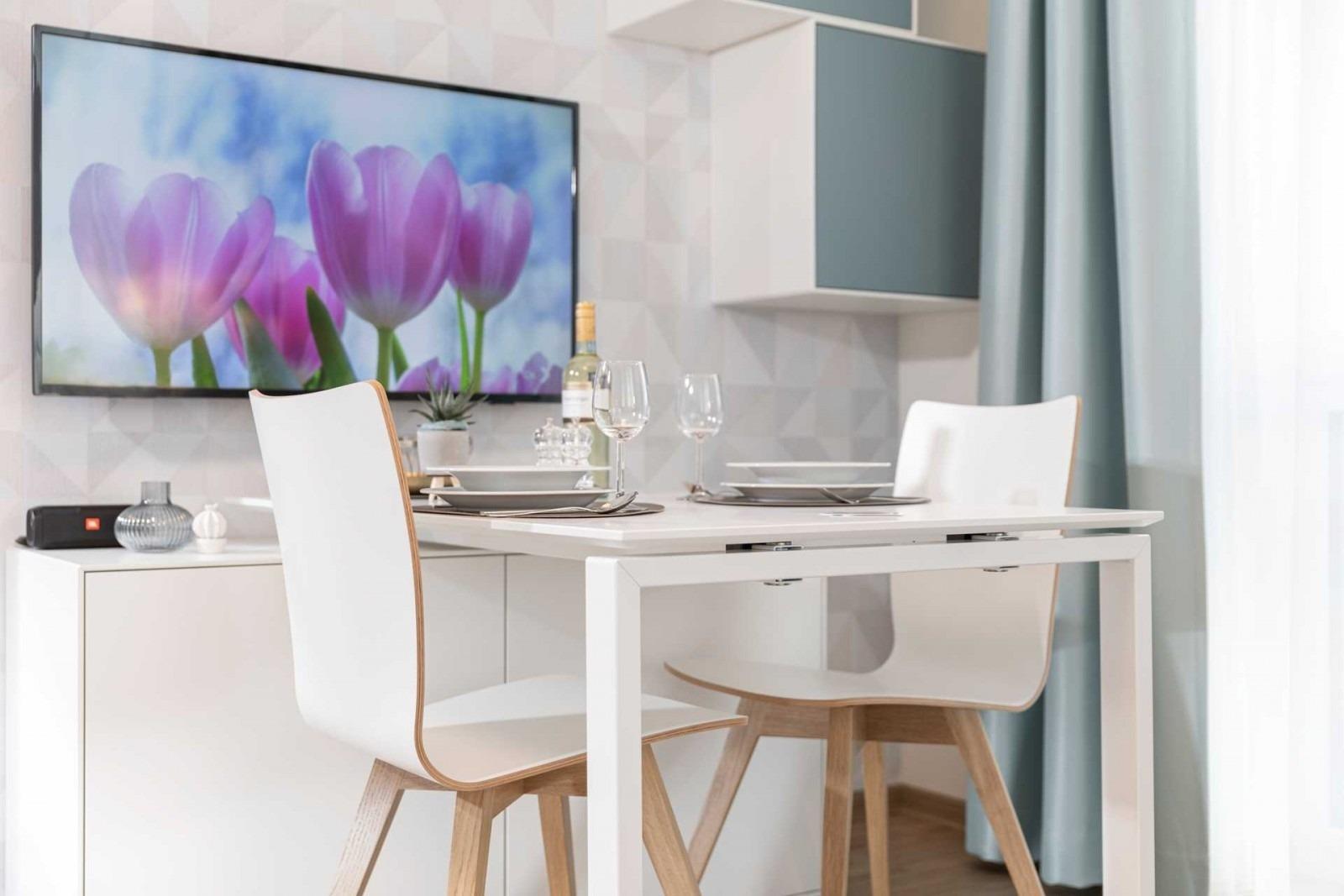Der Tisch im Essbereich mit 2 Stühlen ist multifunktional und kann durch seine technische Ausstattung auch als Schreibtisch genutzt werden. Ganz selbstverständlich verfügt das Apartment über einen kostenfreien Internetanschluss, einen internetfähigen Smart-TV und ein Bluetooth-Radio.