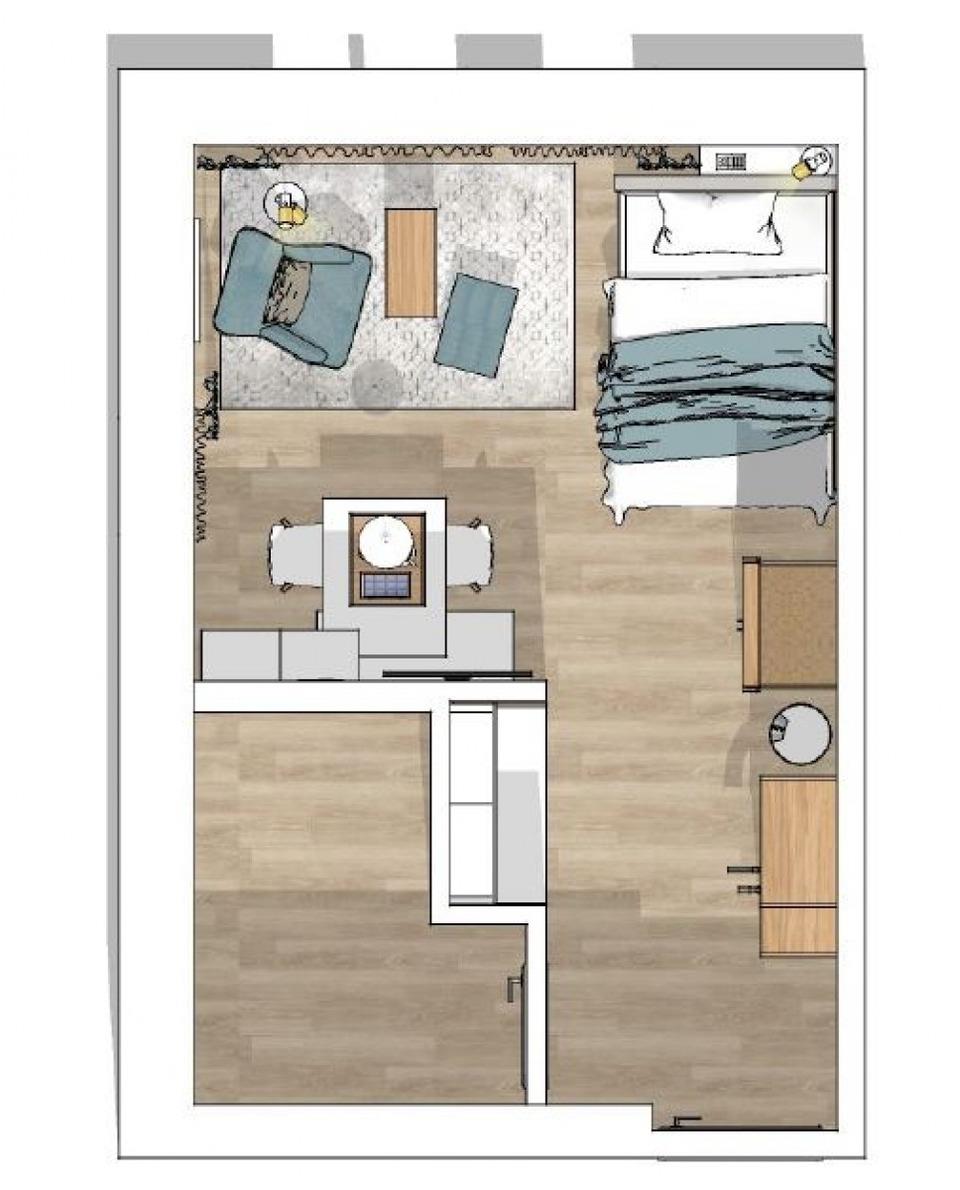 27qm: Wohn- &Schlafzimmer mit Boxspringbett, Bad mit bodengleicher Dusche