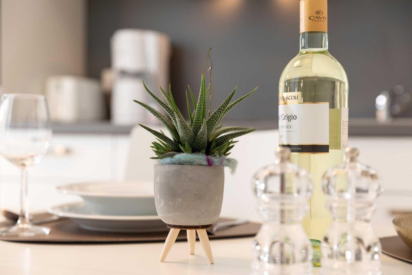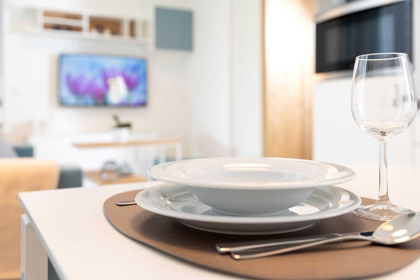 Auf 40 m² verfügt es über eine Pantry-Küche mit Cerankochfeld, Kühlschrank mit Gefrierfach, Spülmaschine, Mikrowelle mit Grill- und Backfunktion, Kaffeemaschine, Mixstab und ausreichend Kochutensilien, um sich vom Frühstück über einen Mittags-Snack bis zum Abendessen selbst versorgen zu können.