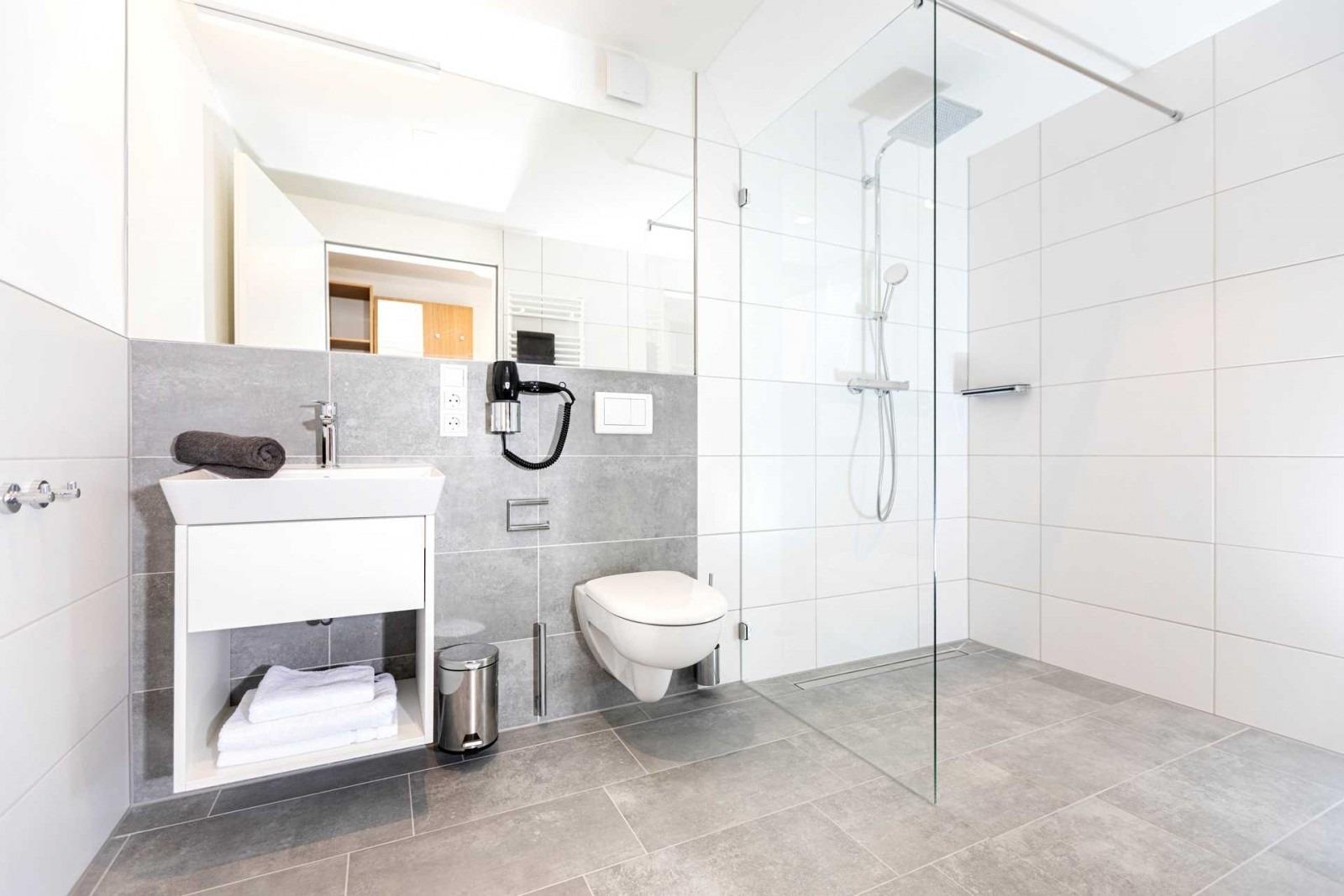 Dieses funktionale, elegante Design wird im Badezimmer durch eine bodengleiche Dusche weiter fortgesetzt. Waschtischunterschrank, Spiegel, Föhn und Seifenspender gehören ebenfalls Standardeinrichtung.