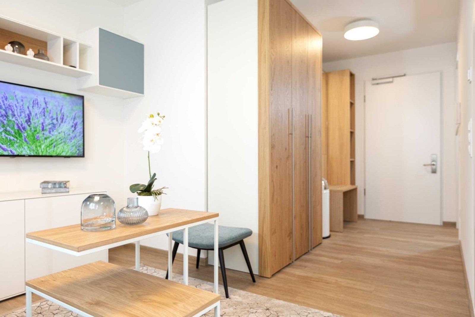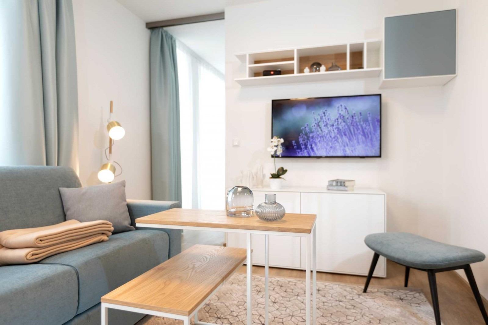 Der Tisch im Essbereich mit 2 Stühlen ist multifunktional und kann durch seine technische Ausstattung auch als Schreibtisch genutzt werden. Ganz selbstverständlich verfügt das Apartment über einen kostenfreien Internetanschluss, einen internetfähigen Smart-TV und ein Bluetooth-Radio.