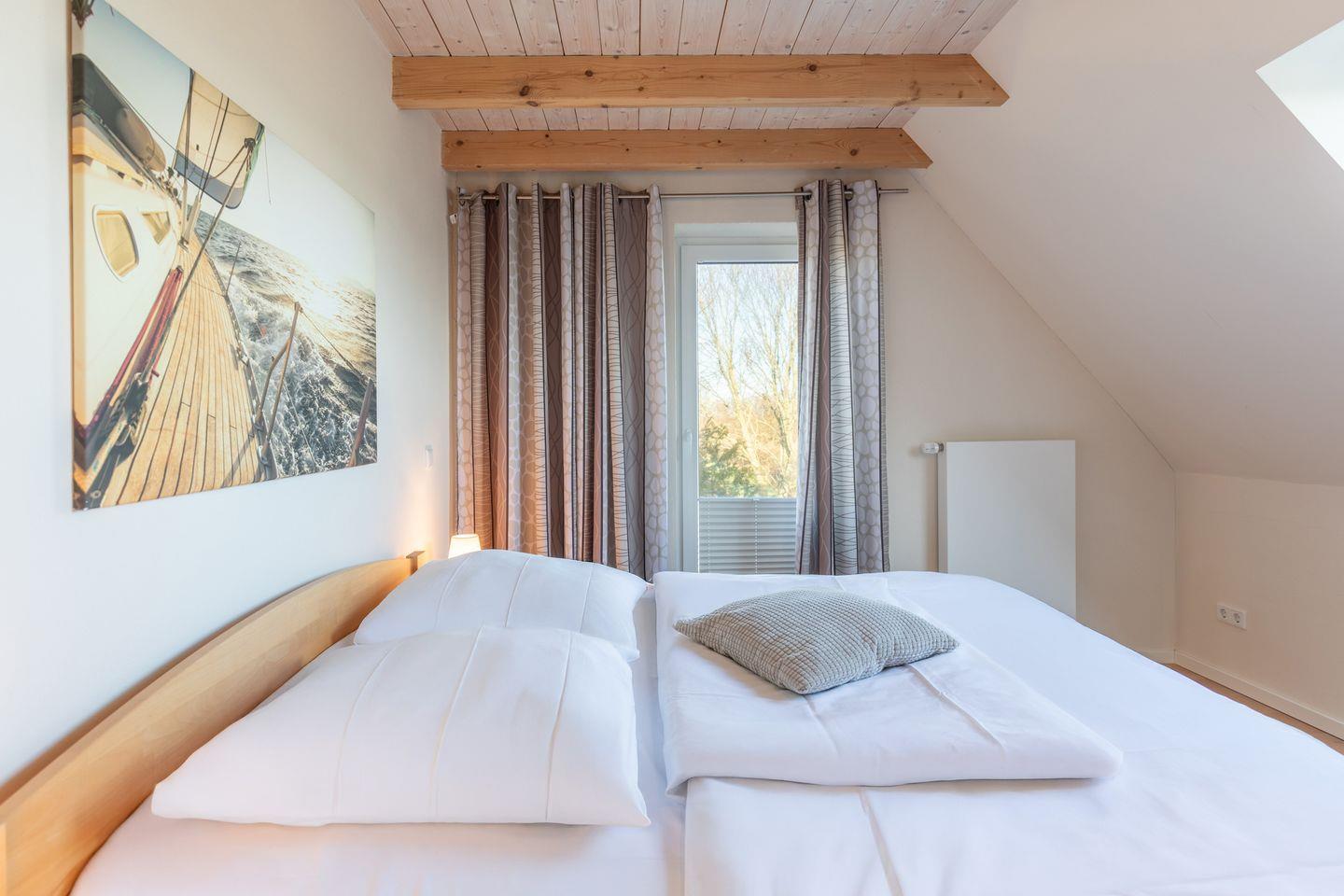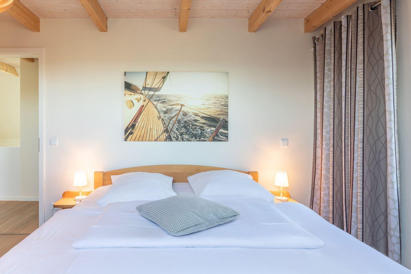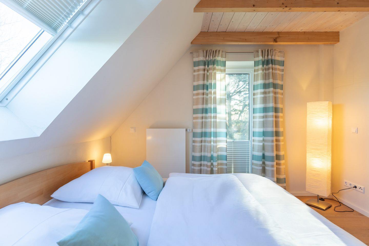 Über eine Holztreppe gelangen Sie ins Obergeschoss mit drei komfortablen Schlafzimmern: zwei Zimmer mit gemütlichen Doppelbetten (180 cm breit) und ein Zimmer mit zwei Einzelbetten (90 cm breit). Alle Schlafräume sind mit Massivholzmöbeln - perfekt für Allergiker - eingerichtet. Die Fliegengitter und die Abdunklungsmöglichkeiten sorgen zusätzlich für einen erholsamen Schlaf.