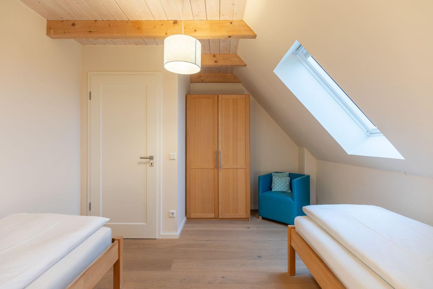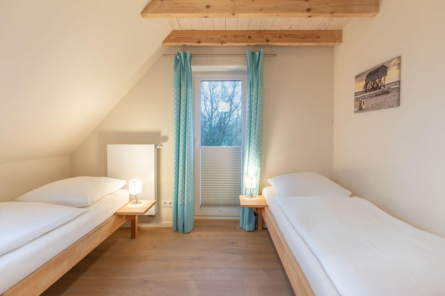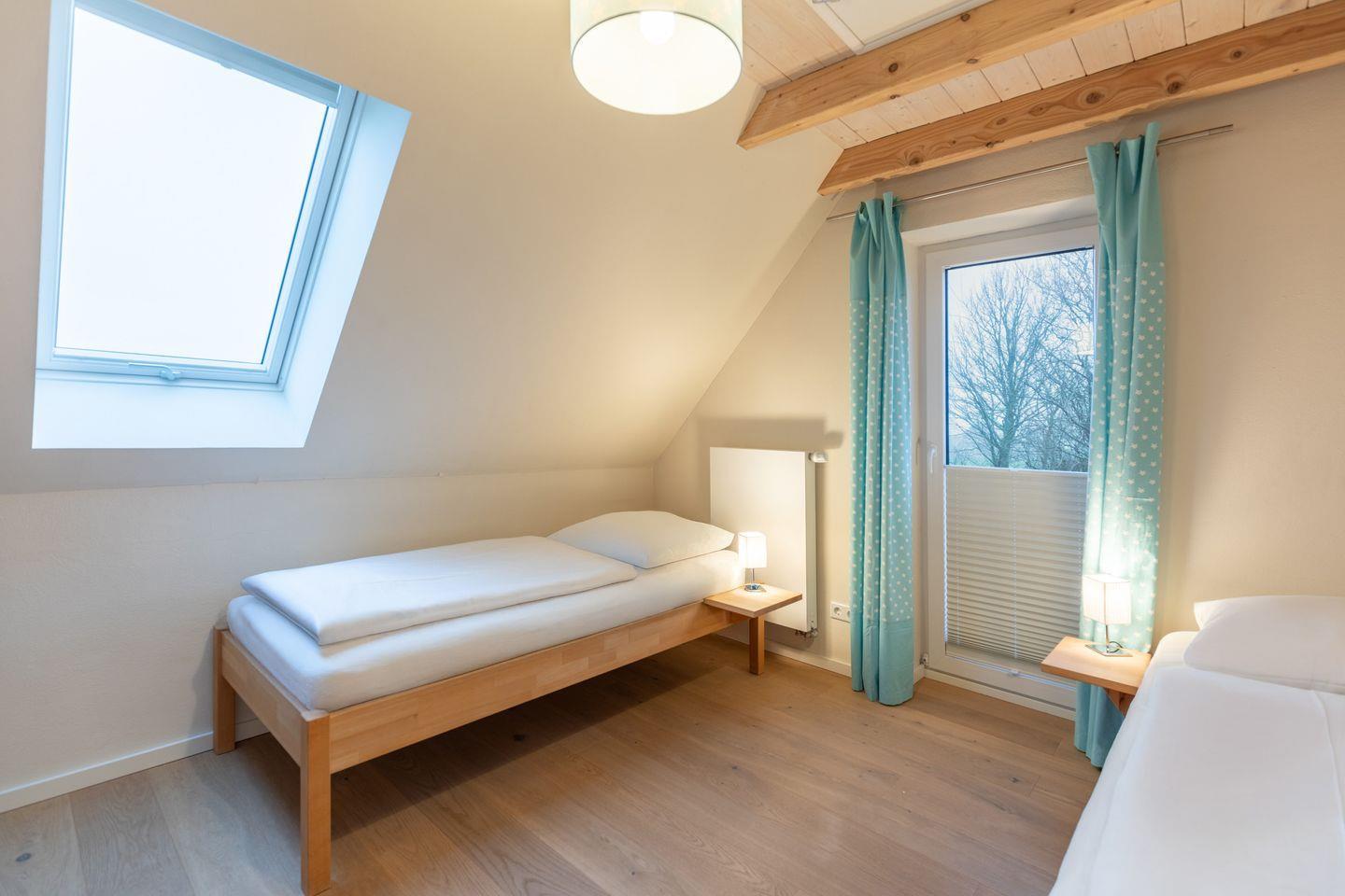 Über eine Holztreppe gelangen Sie ins Obergeschoss mit drei komfortablen Schlafzimmern: zwei Zimmer mit gemütlichen Doppelbetten (180 cm breit) und ein Zimmer mit zwei Einzelbetten (90 cm breit). Alle Schlafräume sind mit Massivholzmöbeln - perfekt für Allergiker - eingerichtet. Die Fliegengitter und die Abdunklungsmöglichkeiten sorgen zusätzlich für einen erholsamen Schlaf.