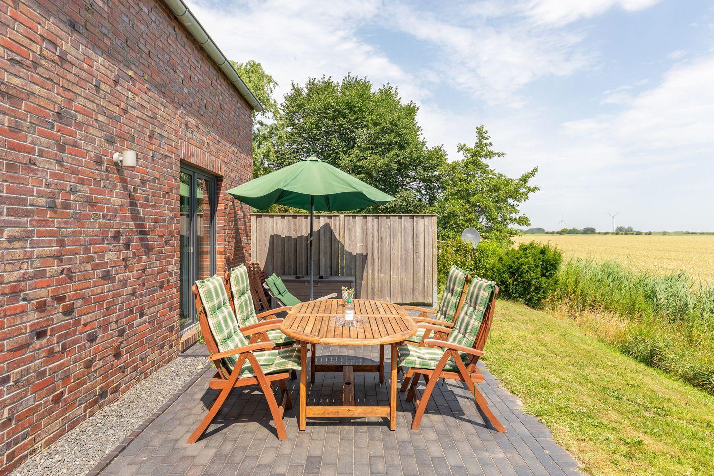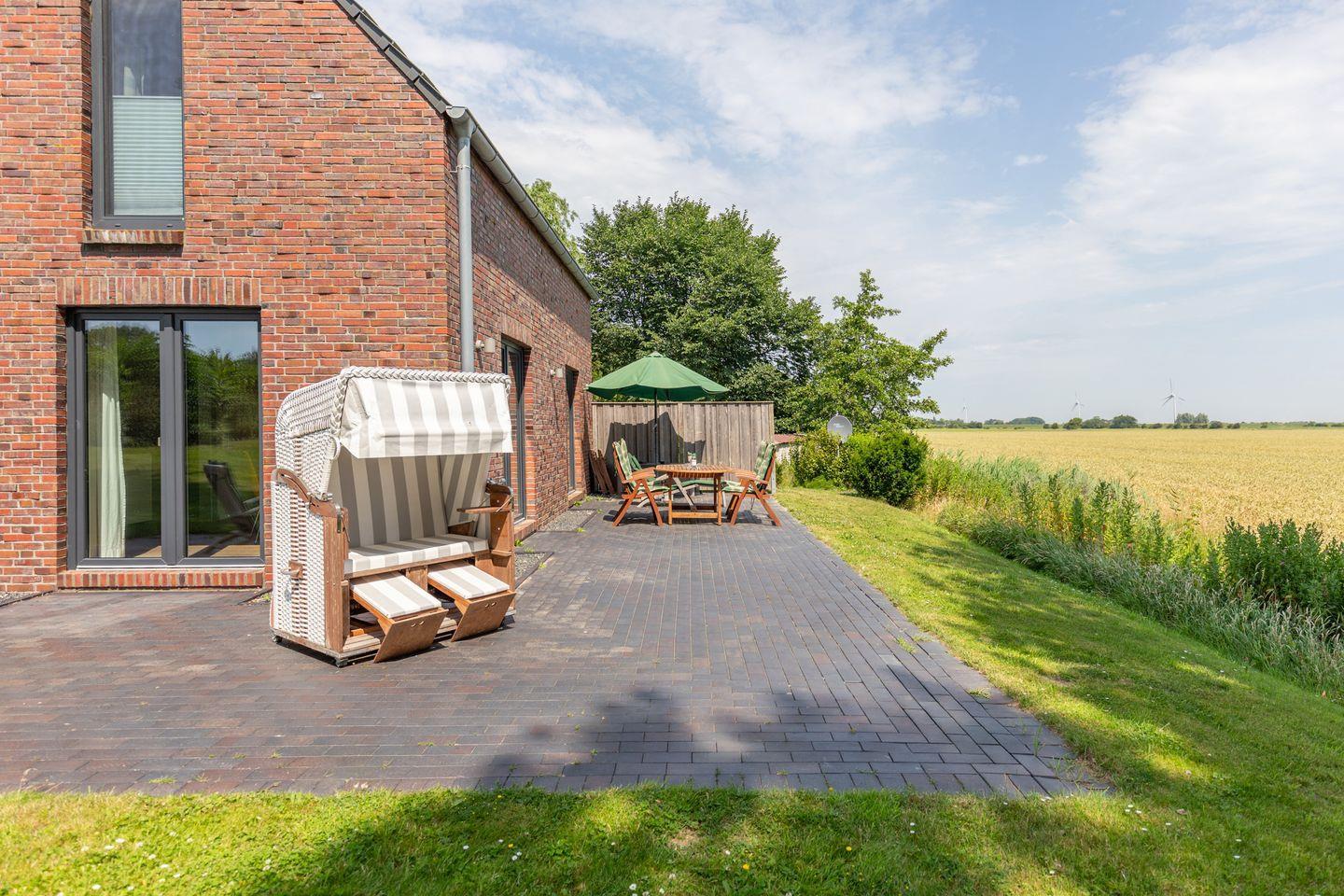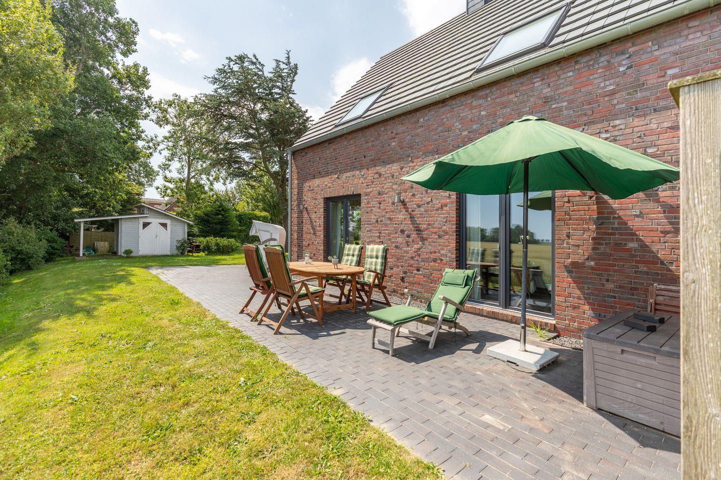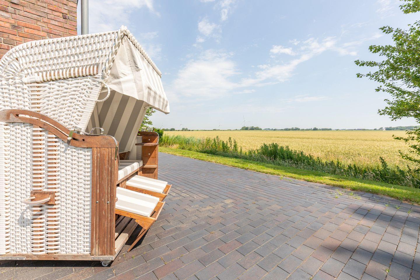 Genießen Sie in dem gepflegten Garten auf der großzügigen Sonnenterrasse (70 qm) den traumhaften Weitblick über die nordfriesischen Felder. Gartenmöbel, zwei Liegen, Sonnenschirm, ein Grill und ein Strandkorb stehen für Sie bereit.