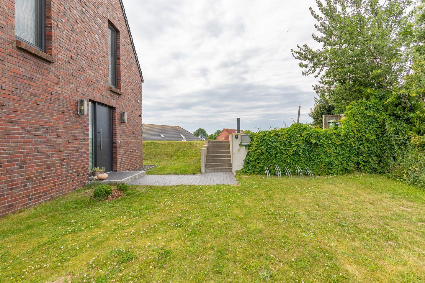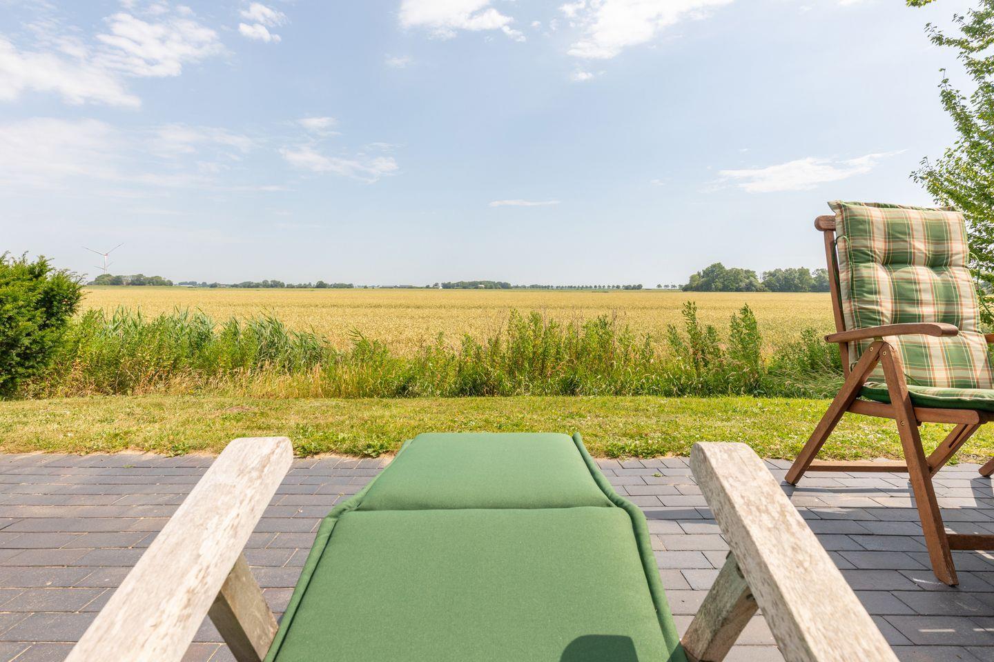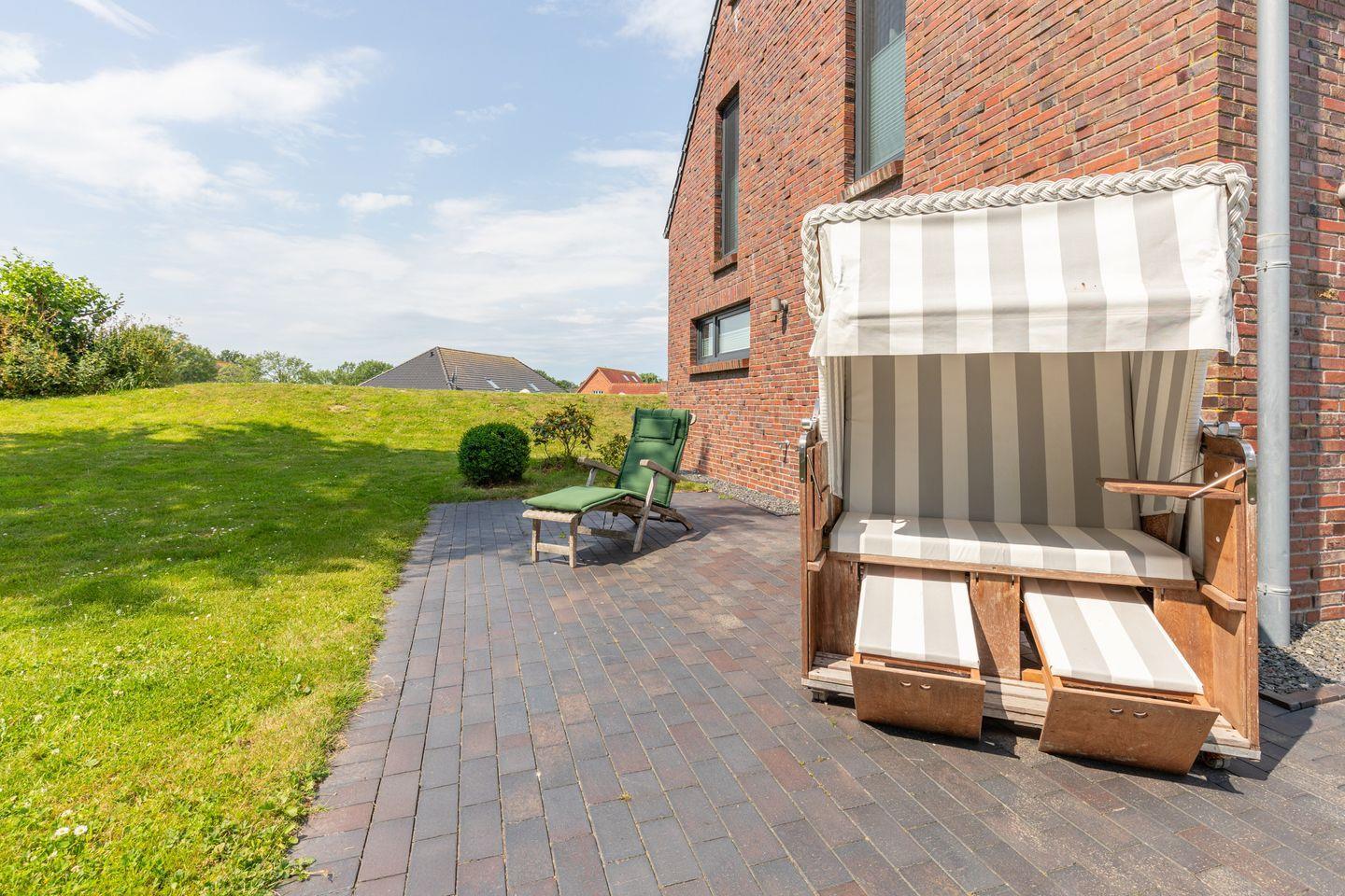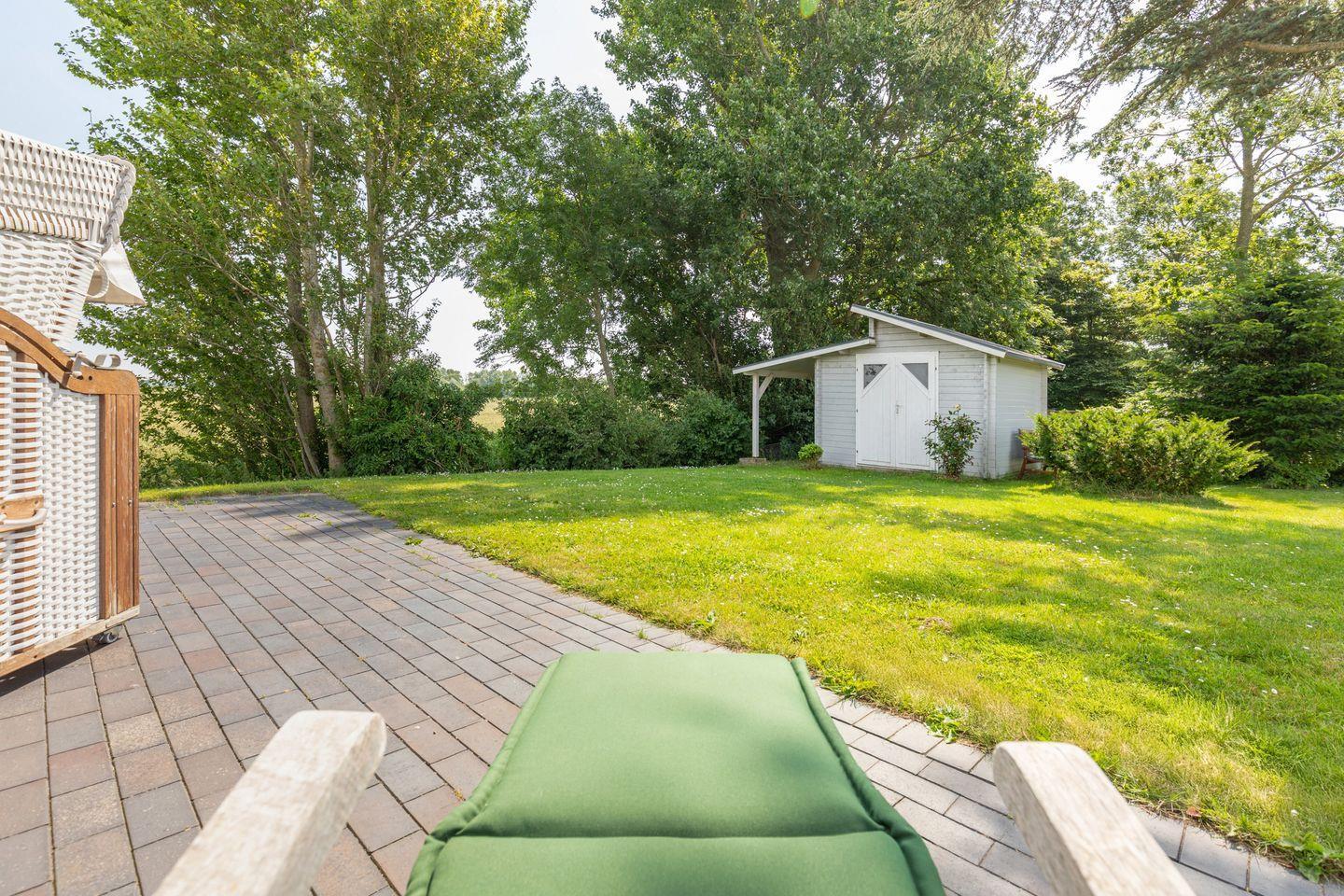 Genießen Sie in dem gepflegten Garten auf der großzügigen Sonnenterrasse (70 qm) den traumhaften Weitblick über die nordfriesischen Felder. Gartenmöbel, zwei Liegen, Sonnenschirm, ein Grill und ein Strandkorb stehen für Sie bereit.
