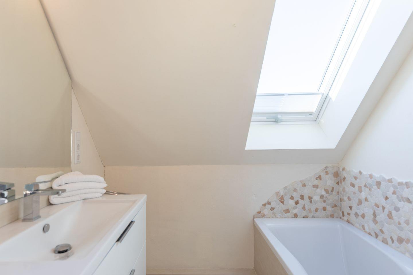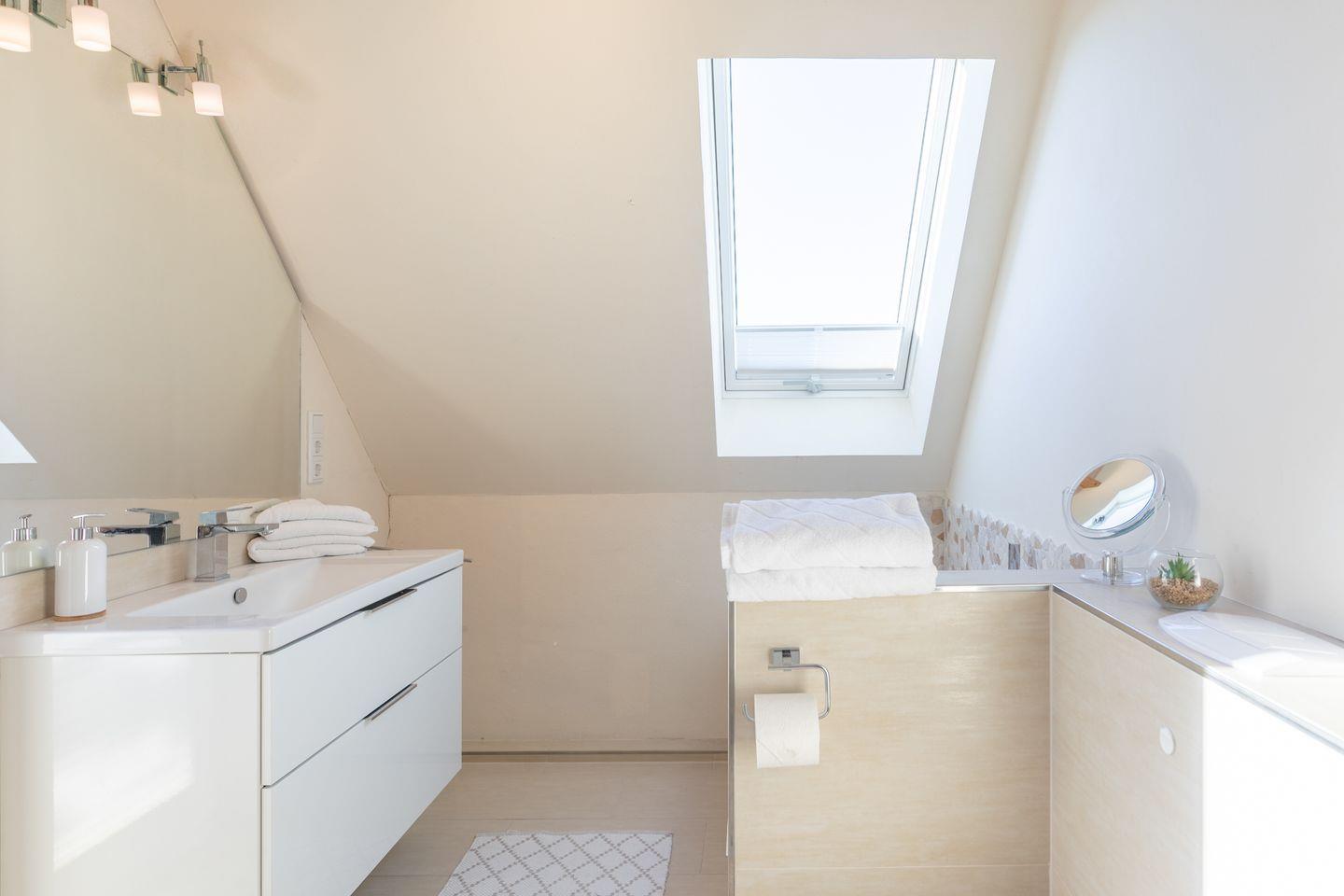 Das Wellness-Badezimmer verwöhnt Sie mit einer Regenbrause und einer stilvollen Badewanne.