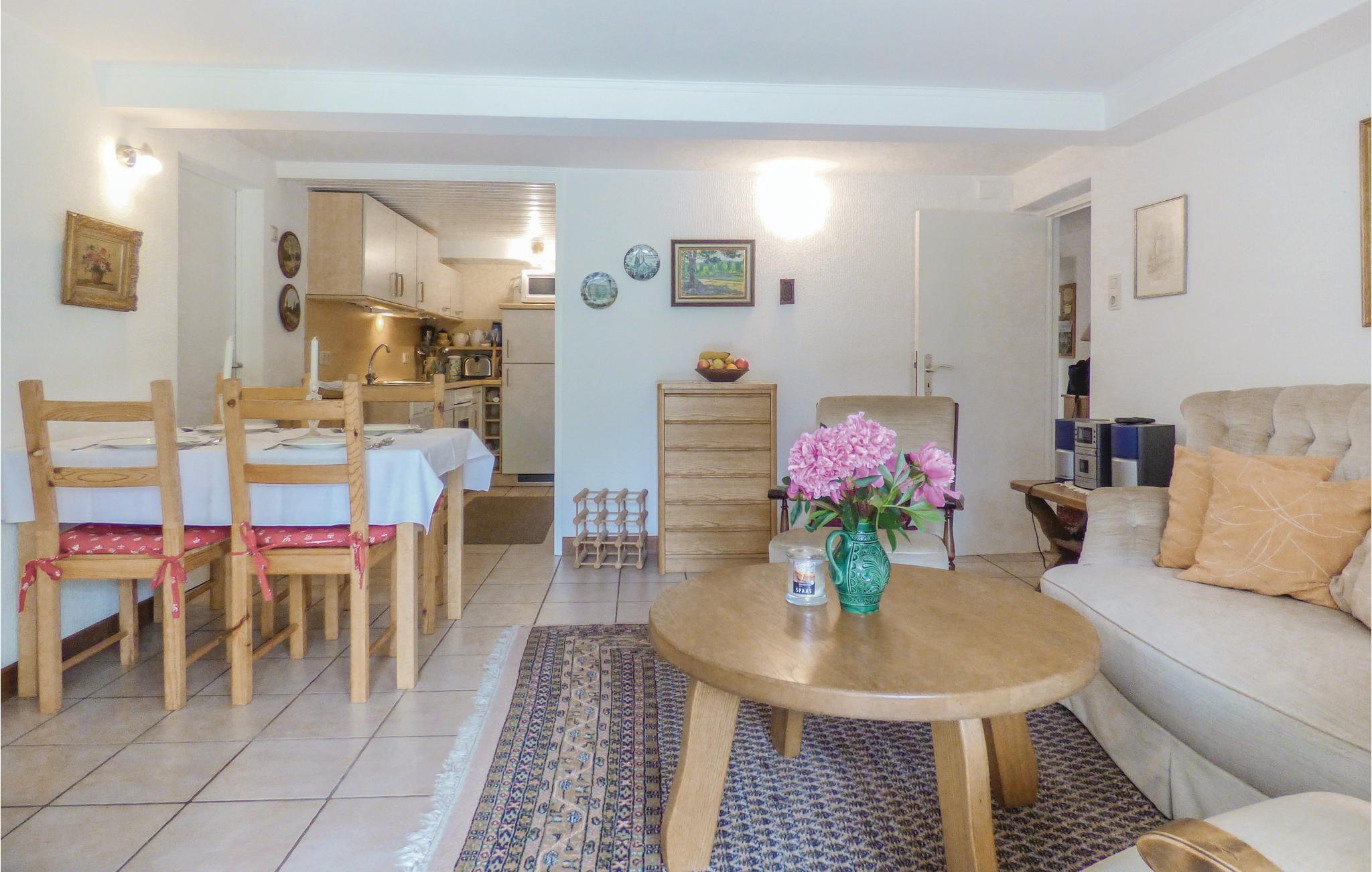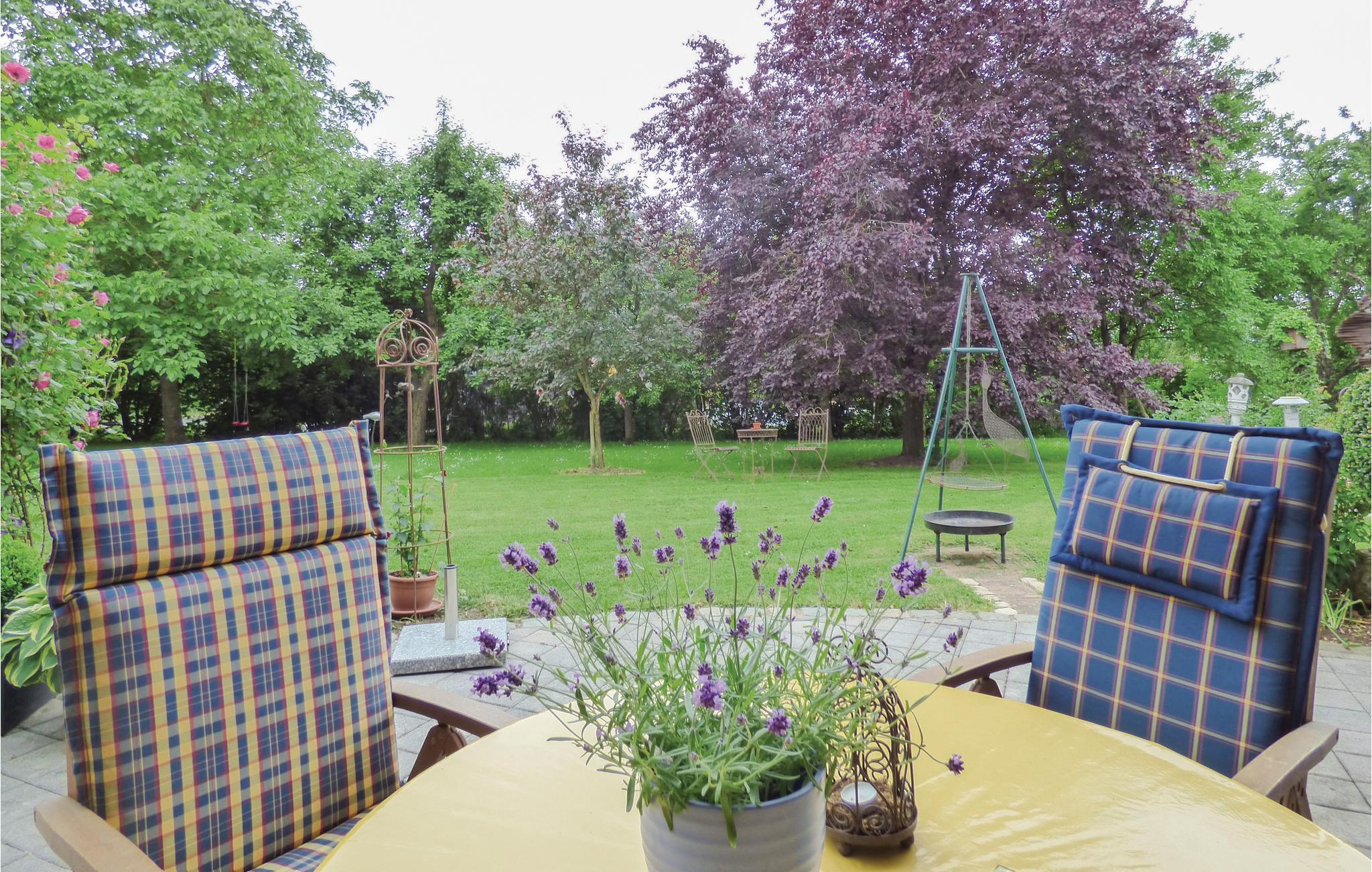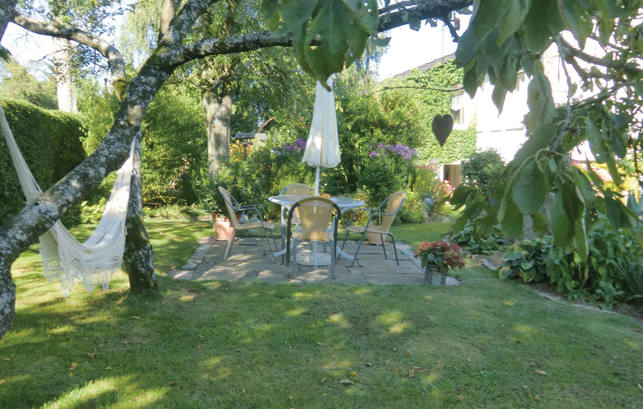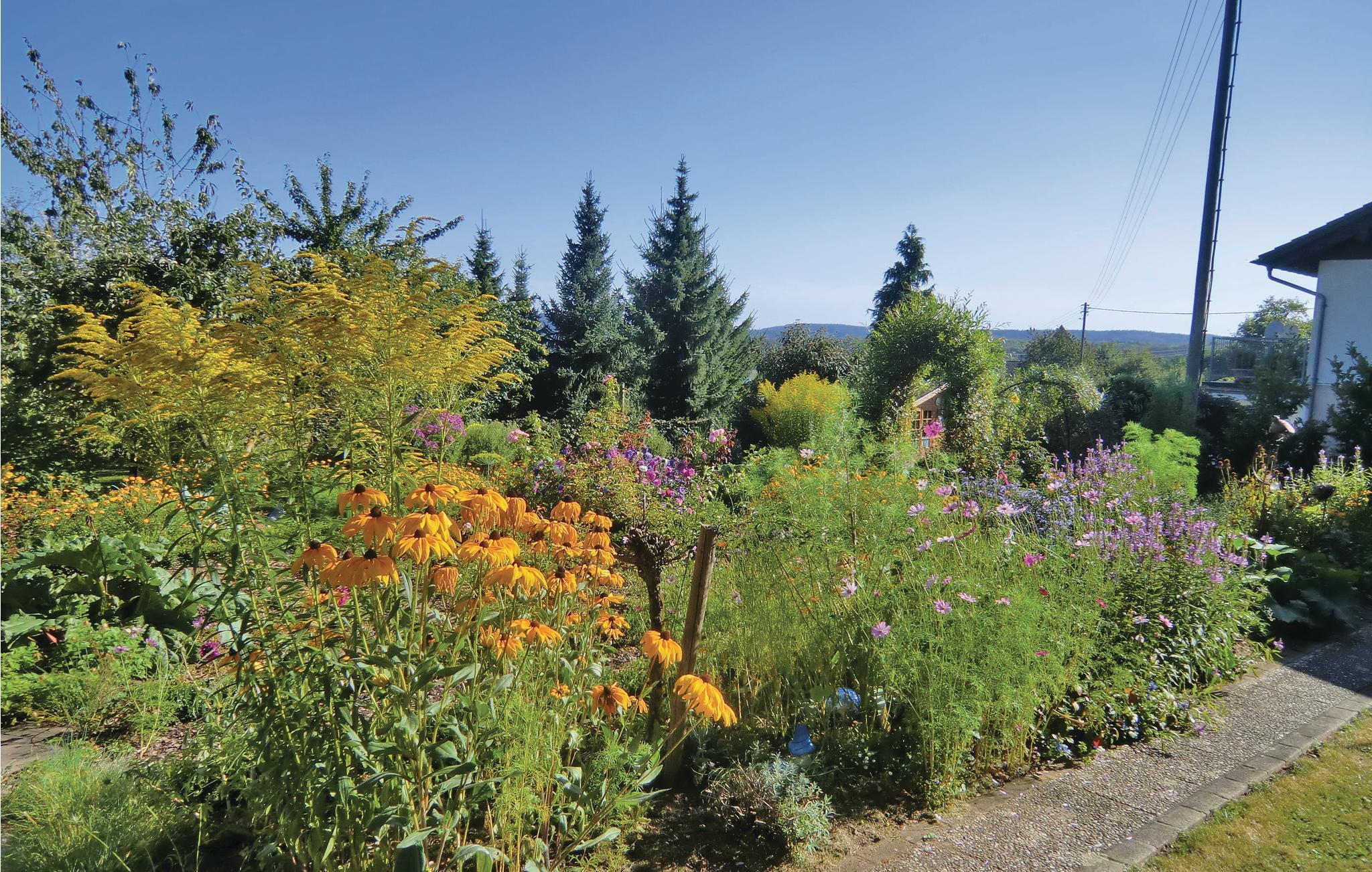 Sie können von der überdachten Terrasse dieser gepflegten und gemütlichen Ferienwohnung aus den schönen Garten genießen. Die ganze Wohnung liegt im Erdgeschoss und hat ein modernes Badezimmer. Da die Decke ein wenig niedriger als üblich ist, eignet sie sich nicht für große Gäste über 1,90 m. Der Zugang auf die Terrasse und in den schönen Garten mit Sandkasten und Grill befindet sich im Wohnzimmer. Das ganze Grundstück hat mehrere Sitzmöglichkeiten, wahlweise in der Sonne oder im Schatten. Auf Anfrage vor Ort bei der freundlichen Vermieterin dürfen Sie gern im großen Gemüsegarten bedienen. Waschen bei der Eigentümerin möglich auf Anfrage und gegen Gebühr. Nusbaum ist ein staatlich anerkannter Fremdenverkehrsort in der Südeifel im Eifelkreis Bitburg-Prüm in Rheinland-Pfalz. In der schönen Natur der Eifel können Sie wandern, Rad fahren und mountainbiken. Einkaufen können Sie im 4 km entfernten Mettendorf oder in der lebhaften Marktstadt Neuerburg. Schwimmbäder gibt es in Mettendorf, Neuerburg und Irrel. Seit 2015 gibt es den im Sommer geöffneten Dinosaurierpark Teufelsschlucht in Ernzen. Die neue, kostenlose Audiotour erzählt spannende und unterhaltsame Geschichten zur Entwicklung des Lebens und macht die Reise durch die Erdgeschichte zum echten Erlebnis.