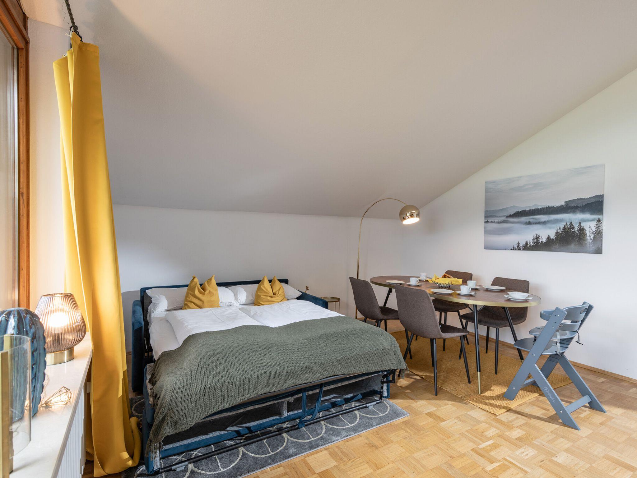 Etwa 60 Quadratmeter, Wohnzimmer mit Flachbild-Fernseher und gemütlicher Essecke, 1 großzügiges Schlafzimmer mit Sternen-Fenster, 1 Bad mit Dusche, hervorragend ausgestattete Küche mit Kühlschrank, kleinem Gefrierfach und Geschirrspüler, Handtücher und Bettwäsche, Waschmaschine mit Trockner, geräumiger Balkon mit Bergblick, Klimaanlage, kostenlose Parkmöglichkeit vor der Unterkunft, kostenloses WLAN inklusive