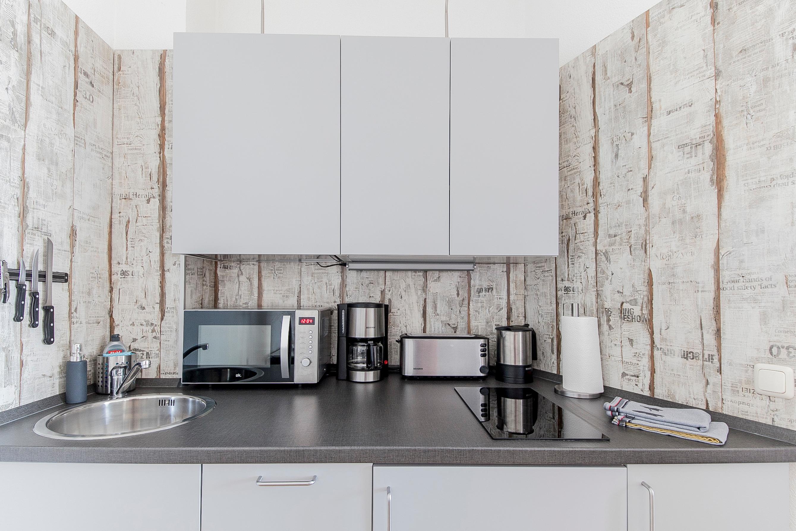 Komfortabel und komplett ausgestattet (2-Plattenherd, Kühlschrank mit Gefrierfach, Toaster, Kaffeemaschine, und Wasserkocher) ist unsere offene Küche. Küchentücher werden selbstverständlich von uns gestellt. Im sich anschließenden Essbereich mit Tisch und Stühlen können Sie mit 3 Personen angenehm verweilen.