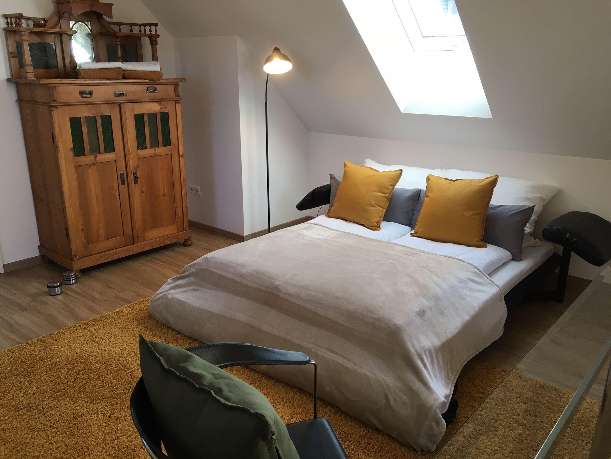 Von der Diele aus führt eine Eichenholztreppe nach oben in das Dachgeschoss. Dort befindet sich ein Schlafzimmer mit Doppelbett (1,80 x 2,00 m), Kommode und einem geräumigen Kleiderschrank. Das zweite Schlafzimmer im Dachgeschoss ist ebenfalls mit einem Doppelbett (1,80 x 2,00 m) sowie mit einem Sofa ausgestattet. Im Dachgeschoss ist darüber hinaus noch eine weitere Toilette vorhanden.