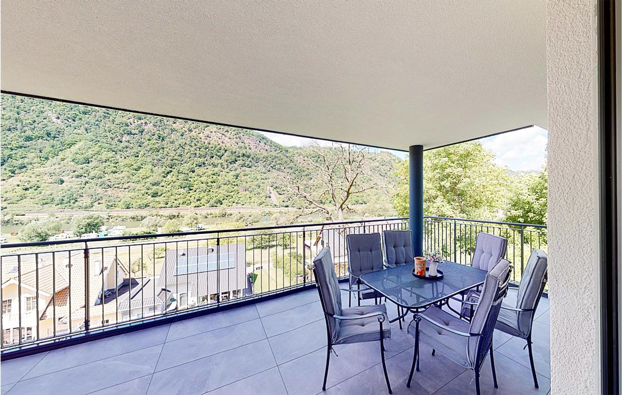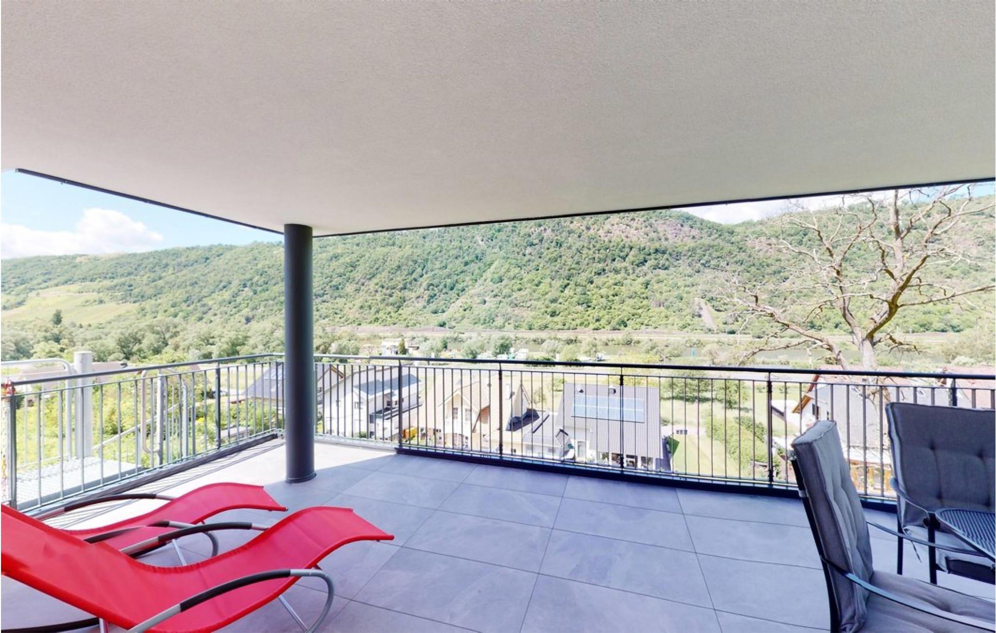 Die überdachte Balkonterrasse lädt dazu ein, bei einer Tasse Kaffee den Panoramablick zu bewundern. Dank der Hanglage erleben Sie eine herrliche Aussicht auf das Moseltal und die umliegende Natur.