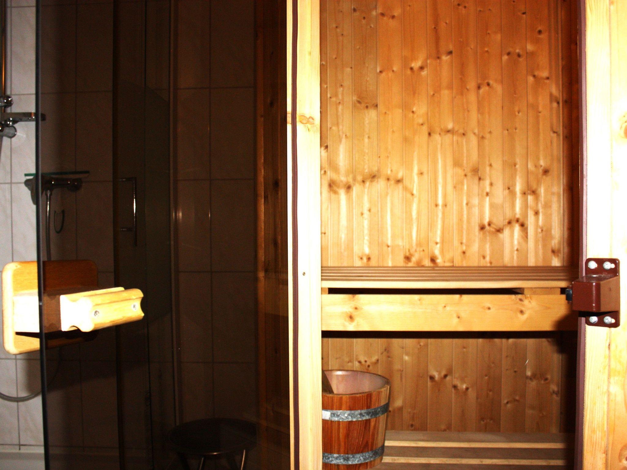 Keller: Flur, 1 Raum für Fitness mit Laufband, Crosstrainer, Ergometer und Rudergerät, 1 Raum mit Sauna, Dusche und Waschbecken, Waschmaschine und Trockner, 1 Raum mit 2 Liegen und Sat-TV zum Entspannen nach Sauna und Fitness. W-LAN ist vorhanden.