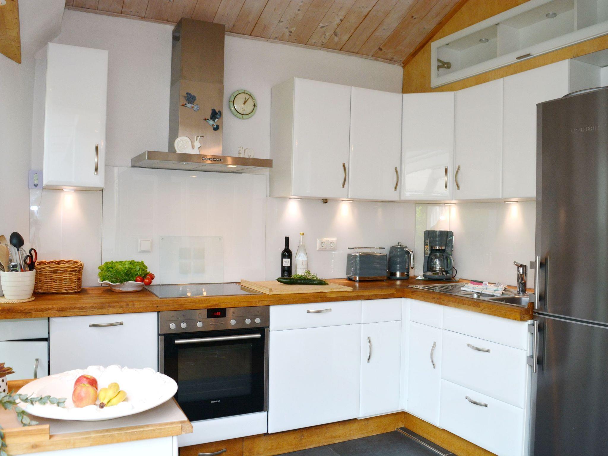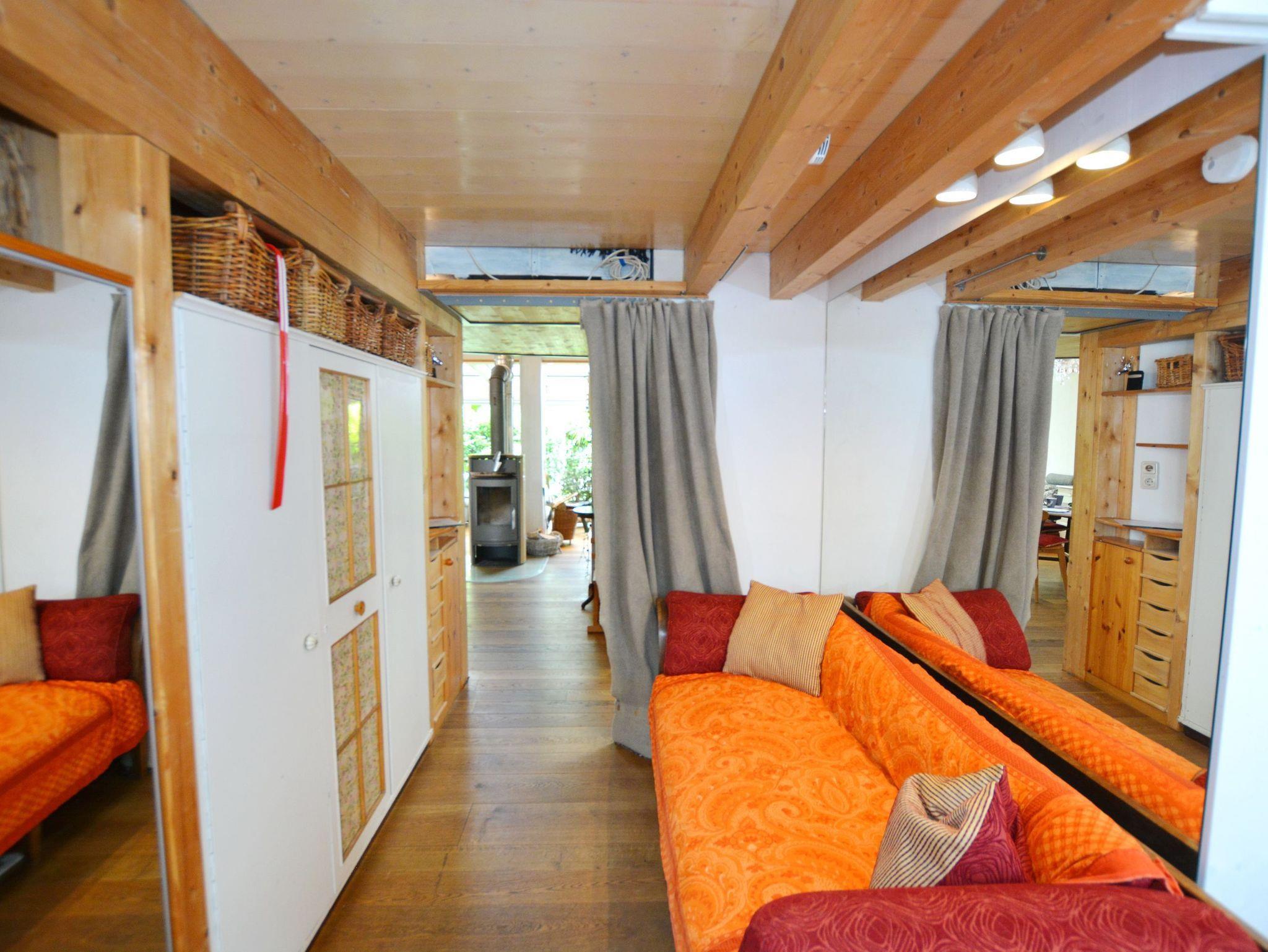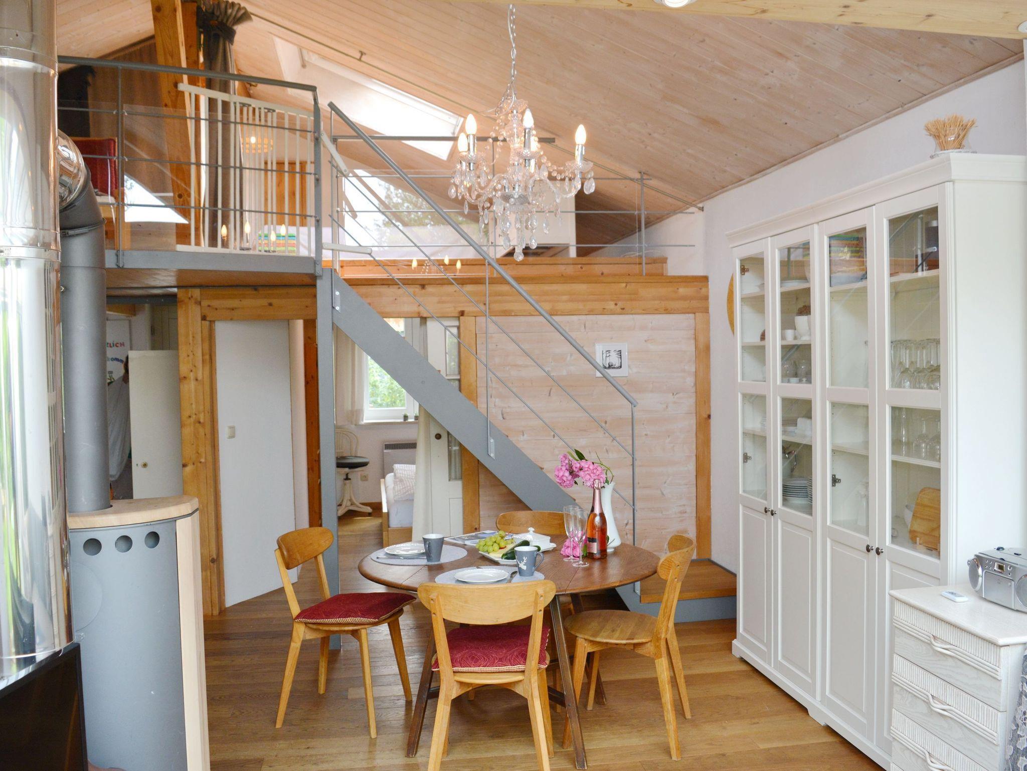 Der modern gestaltete, offene Wohnbereich bildet das Herzstück des kleinen Häuschen. Knisterndes Kaminfeuer (dieses ist die Hauptheizung des Hauses) welches nicht nur vom Essbereich aus betrachtet werden kann - was gibt es in der kalten Jahreszeit Schöneres? Oder genießen Sie vom Sofa aus durch das große Panoramafenster den Blick in den Garten. Die offene Küche mit Essbereich ist mit dem Wohnbereich verbunden. Von hier aus gelangen Sie auf die Terrasse und den Garten - hier werden Sie sicherlich wunderschöne Stunden verbringen. Ergänzt wird das Erdgeschoss durch ein Schlafzimmer mit Doppelbett (ist mit Schiebetüre zu schließen), einem Flur sowie das moderne Badezimmer mit Badewanne und WC. Eine Treppe verbindet den Wohnbereich mit dem großen Schlafbereich auf der offenen Galerie, welches mit einem französischen Bett und zwei stapelbaren Einzelbetten ausgestattet ist - gerade Stehen ist hier nicht möglich.