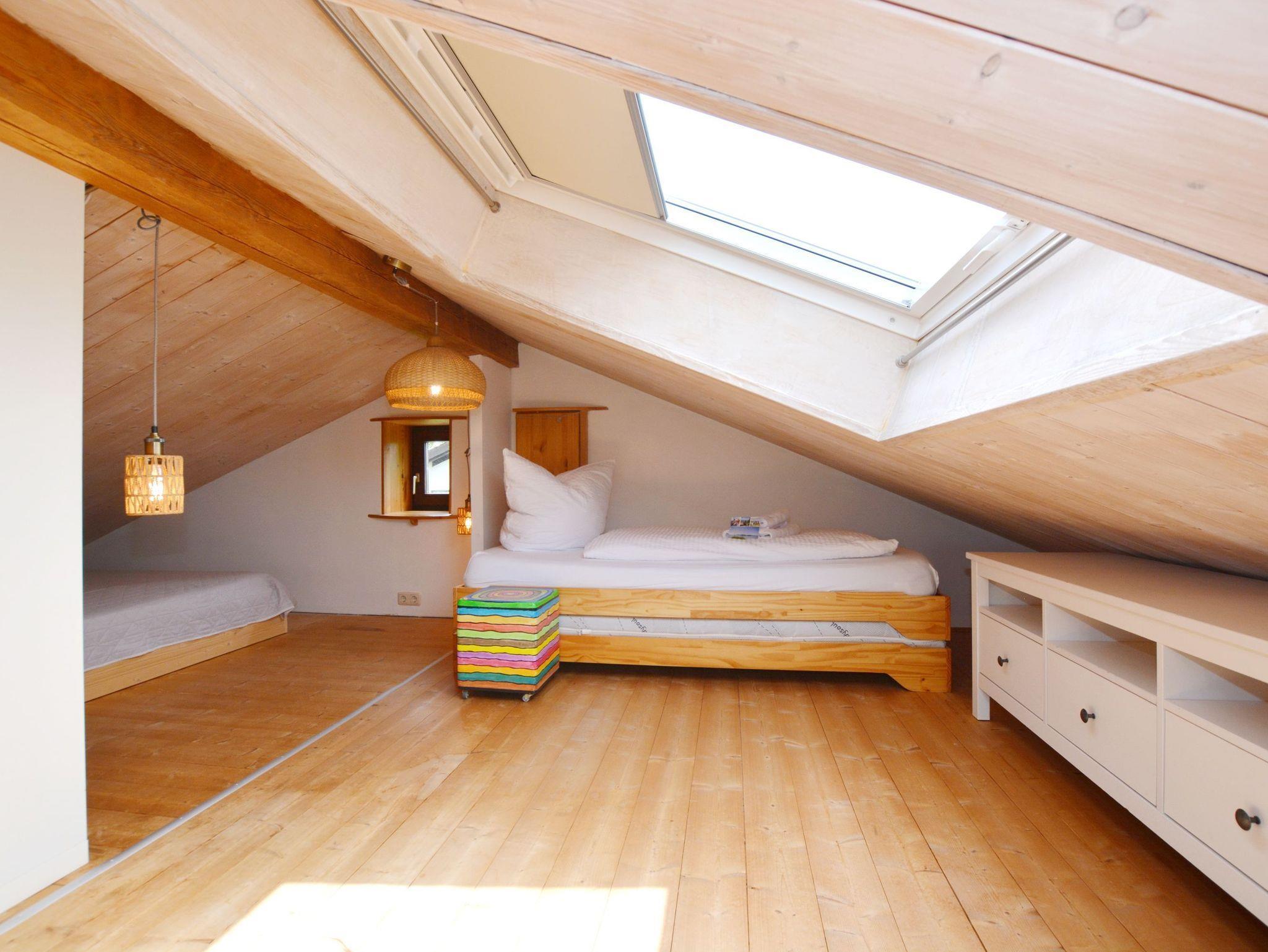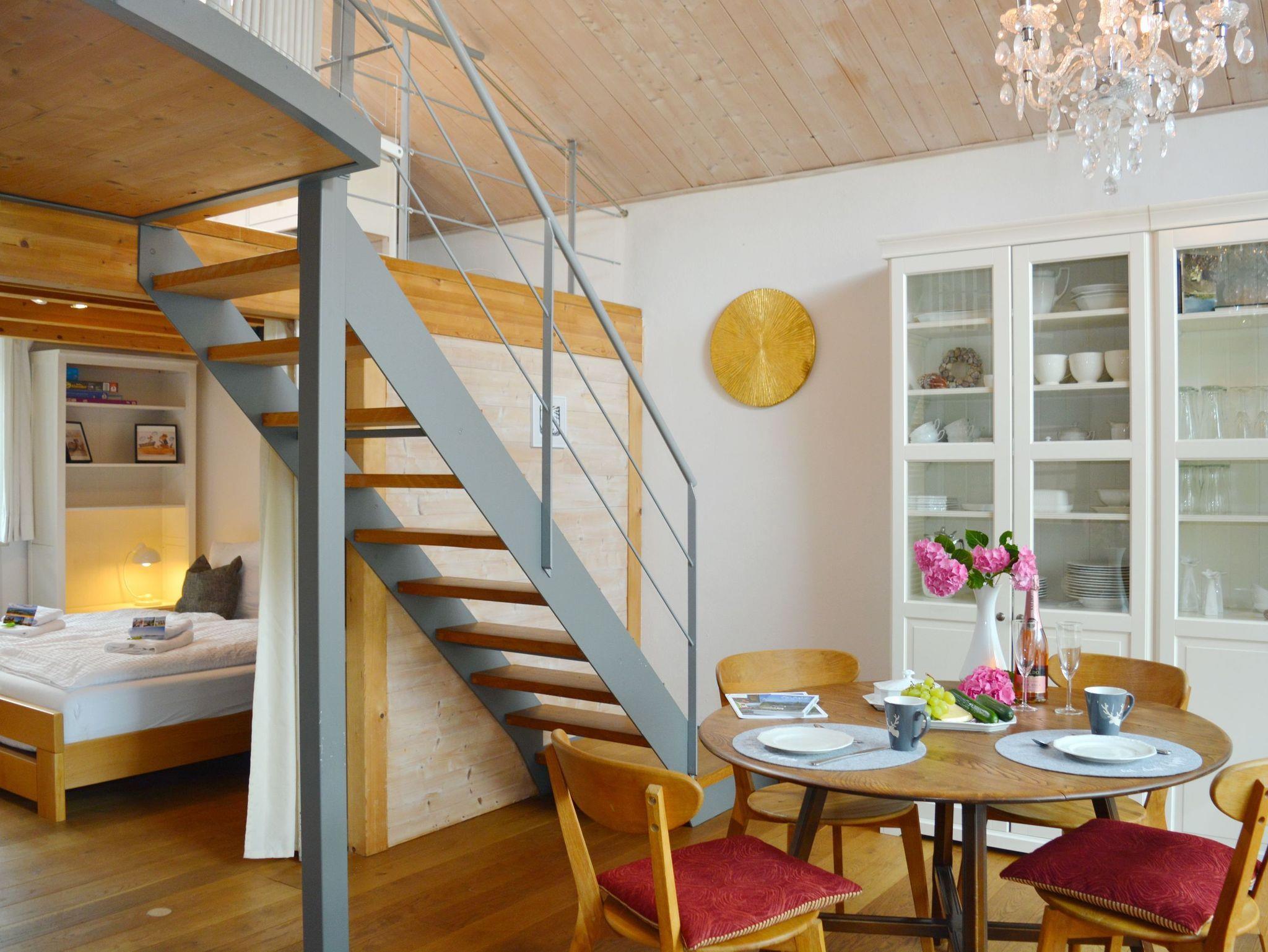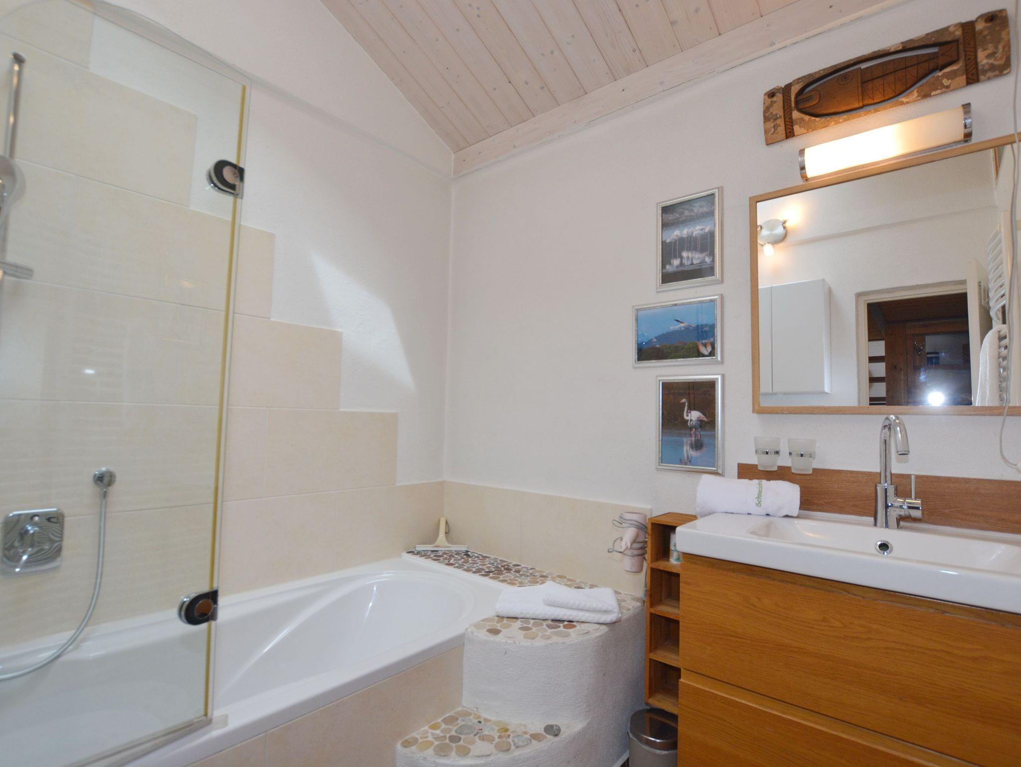 Der modern gestaltete, offene Wohnbereich bildet das Herzstück des kleinen Häuschen. Knisterndes Kaminfeuer (dieses ist die Hauptheizung des Hauses) welches nicht nur vom Essbereich aus betrachtet werden kann - was gibt es in der kalten Jahreszeit Schöneres? Oder genießen Sie vom Sofa aus durch das große Panoramafenster den Blick in den Garten. Die offene Küche mit Essbereich ist mit dem Wohnbereich verbunden. Von hier aus gelangen Sie auf die Terrasse und den Garten - hier werden Sie sicherlich wunderschöne Stunden verbringen. Ergänzt wird das Erdgeschoss durch ein Schlafzimmer mit Doppelbett (ist mit Schiebetüre zu schließen), einem Flur sowie das moderne Badezimmer mit Badewanne und WC. Eine Treppe verbindet den Wohnbereich mit dem großen Schlafbereich auf der offenen Galerie, welches mit einem französischen Bett und zwei stapelbaren Einzelbetten ausgestattet ist - gerade Stehen ist hier nicht möglich.
