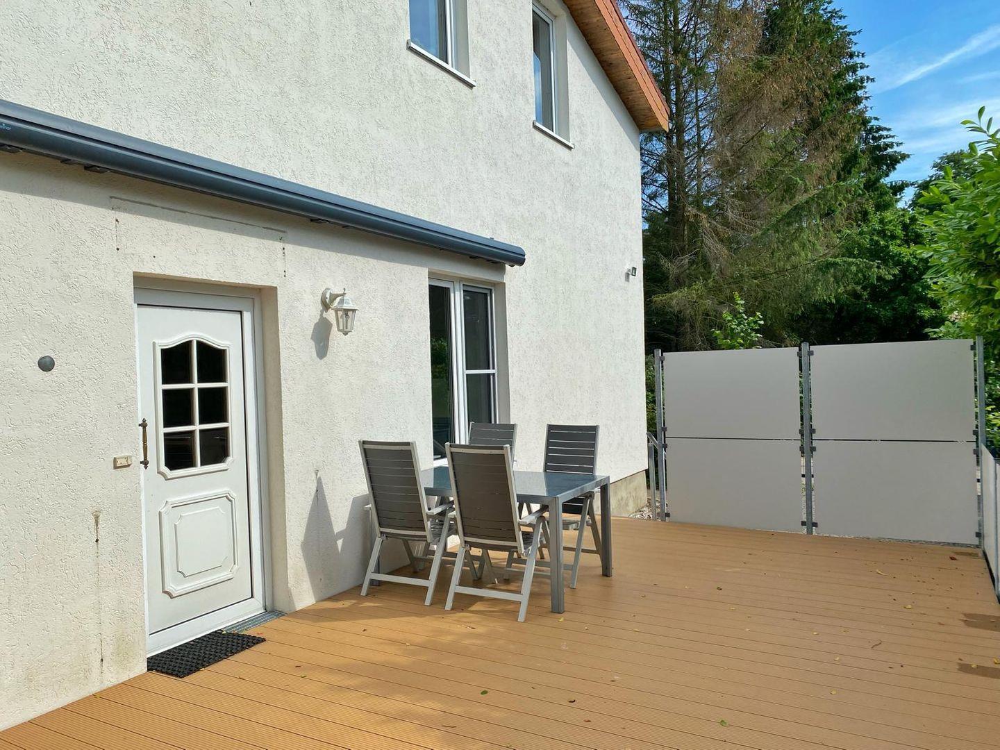 Zur Wohnung gehört eine Terrasse mit Gartenmöbeln.