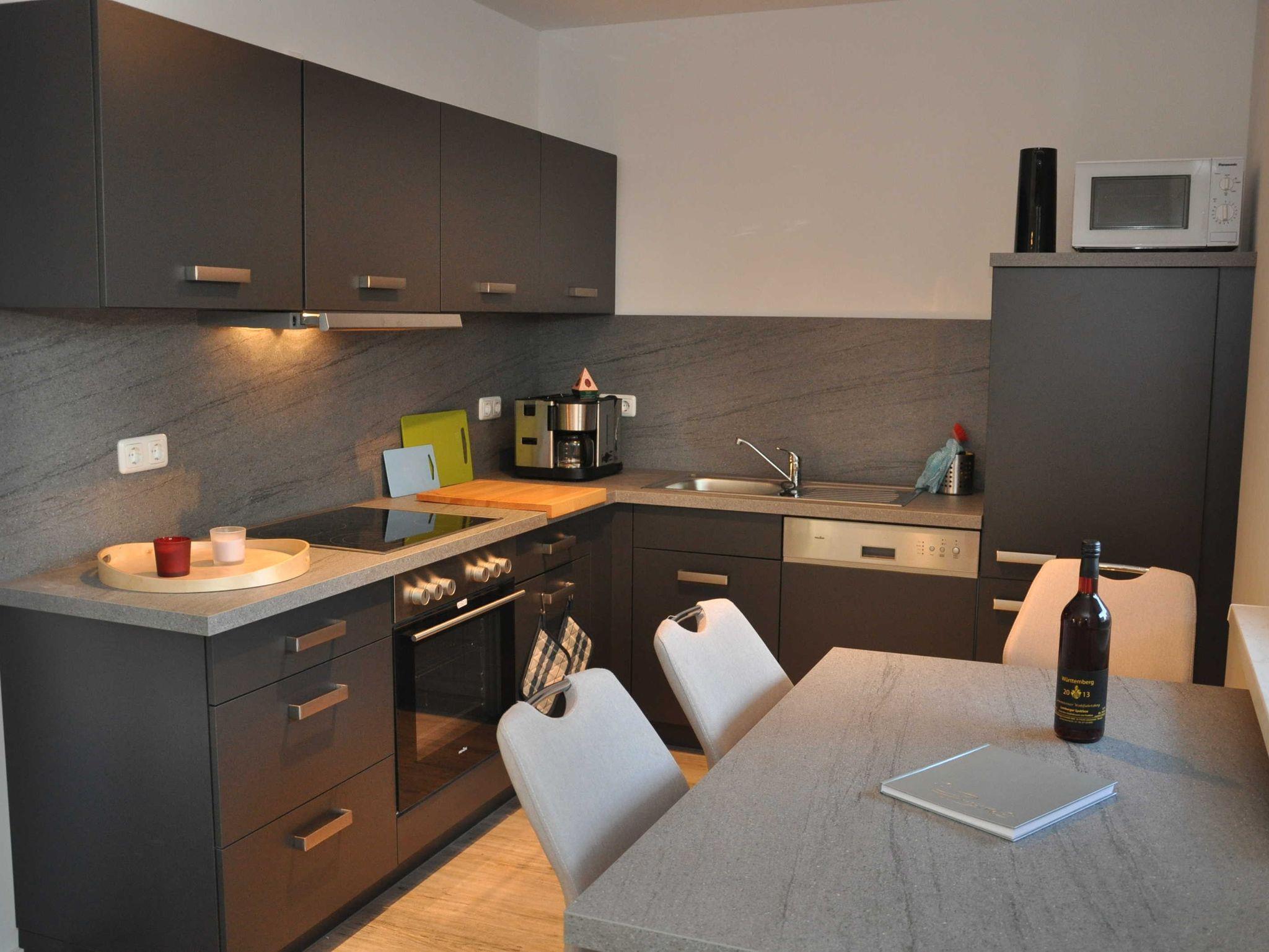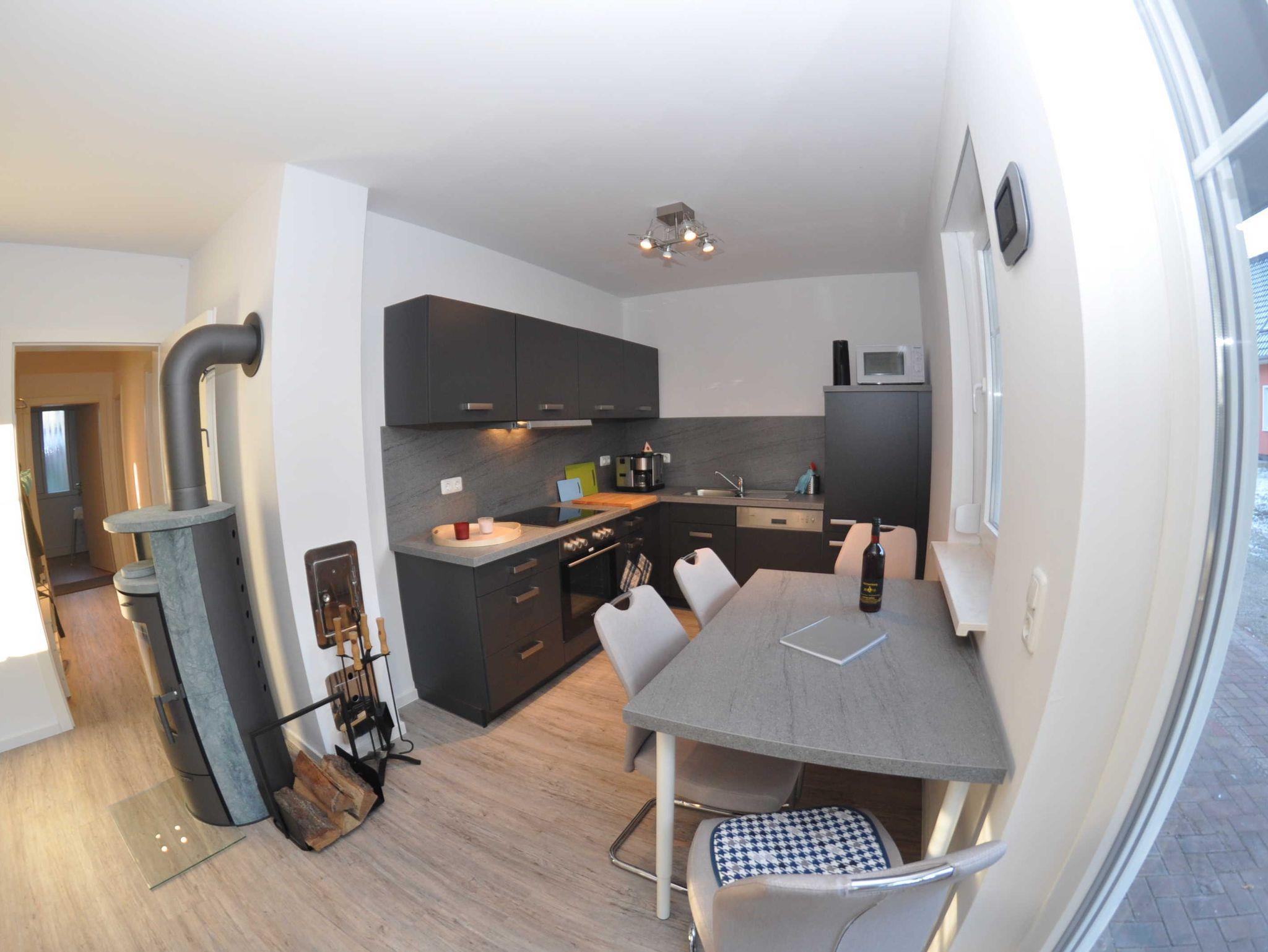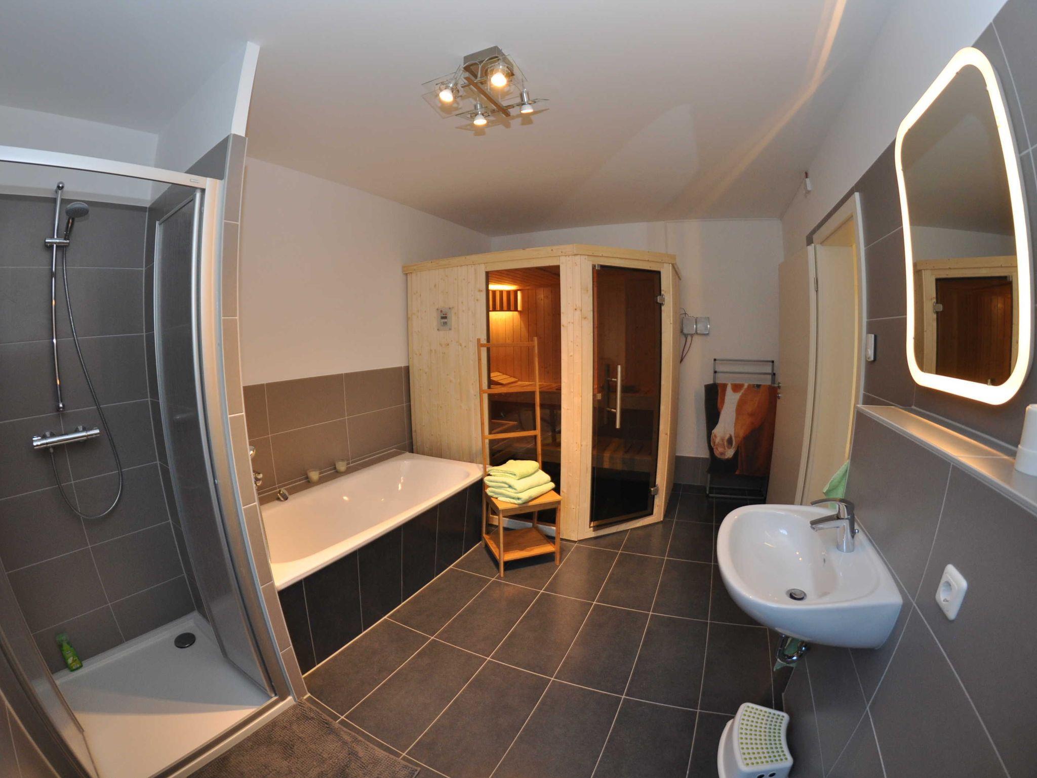Eine Aufbettungsmöglichkeit besteht im Wohnzimmer. Die Couch verfügt über eine Schlaffunktion. Darüber hinaus verfügt das EG-Appartement über 1 Bad mit Dusche und Wanne sowie einer Sauna und Kamin, kostenfreien WLAN, Wohn- /Essbereich mit vollwertiger Einbauküche mit Spülmaschine, Kühl-/Gefrierfunktion, Ceranherd und Mikrowelle stehen ebenfalls zur Verfügung.