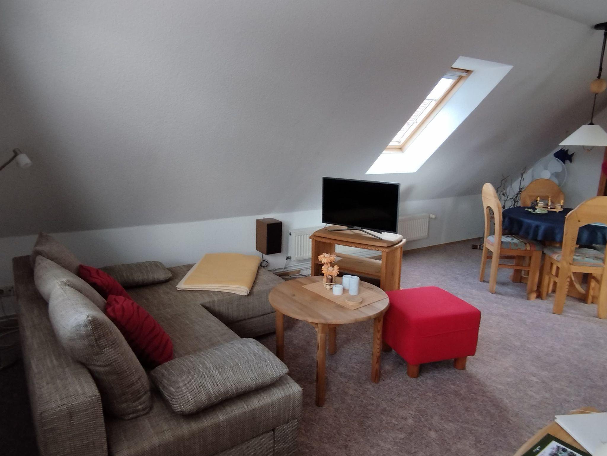 Der großzügige Wohnraum, über die gesamte Etage, ist in einen Essbereich und eine einladende Sitzecke mit Couch unterteilt. In einer kleinen Nische finden Sie ein komfortables Doppelbett für erholsame Nächte.