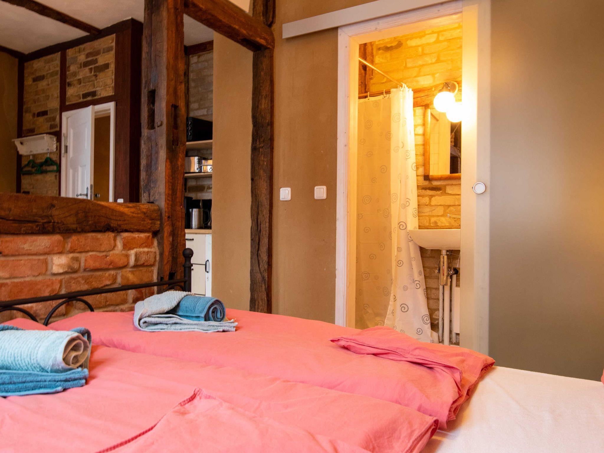 Die Ferienwohnungen im Obergeschoss sind über das inneliegende Treppenhaus zu erreichen. Beide sind mit einer in den Naturlehm eingebetteten Wandheizung ausgestattet. Auf eine ausfallende farbliche Gestaltung der Wände wurde verzichtet, um das besondere Raumklima wirken zu lassen. Die Wohnungen sind schlicht möbliert, mit antiken oder selbst gebauten Möbeln und einigen modernen Elementen. Dielenfußboden und Einzelteppiche unterstreichen zusätzlich die Gemütlichkeit der Räume. So bieten die Ferienwohnungen eine Wohlfühloase zum Entspannen nach einem erlebnisreichen Urlaubstag.