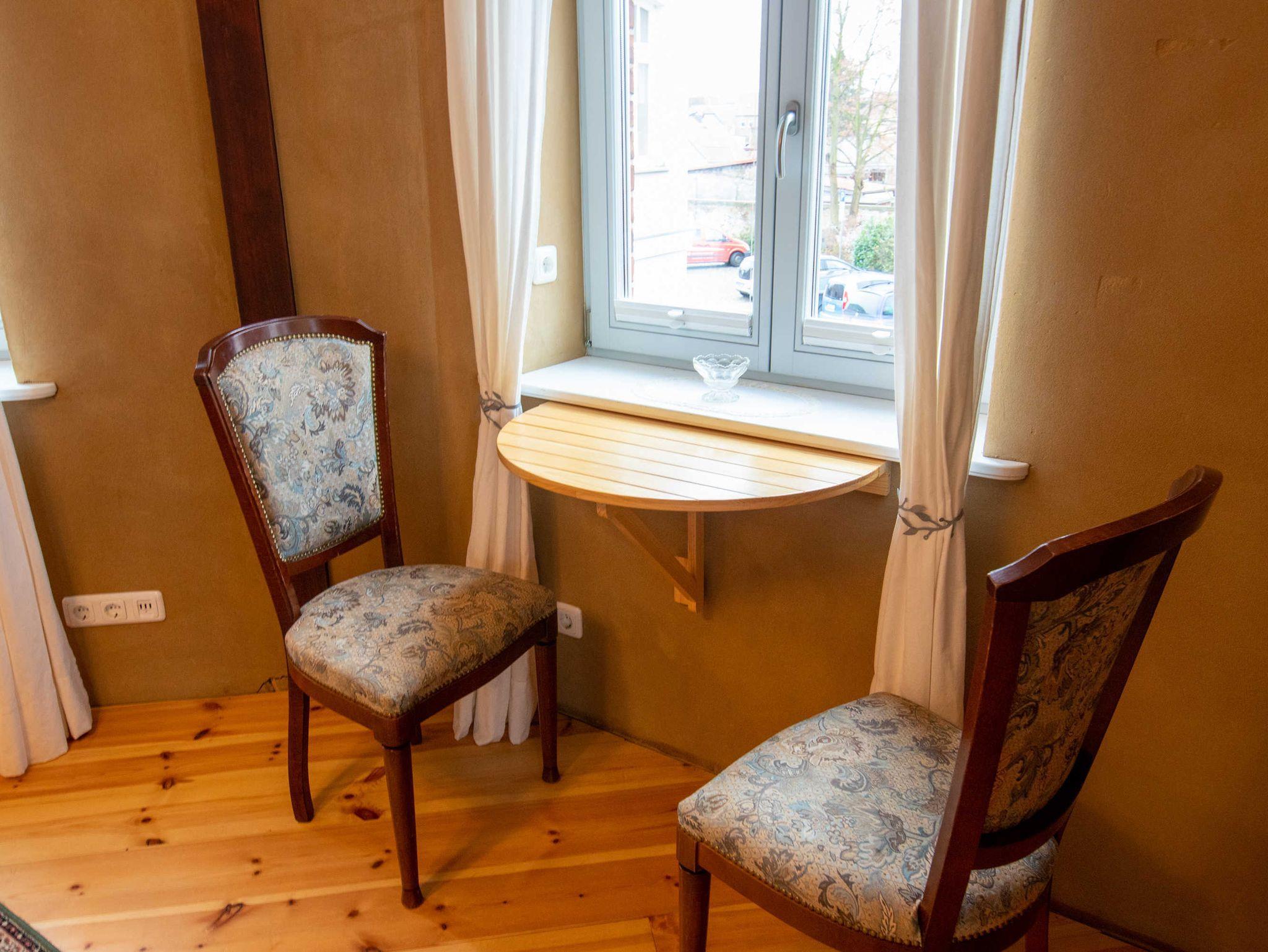 Die 22 m² große Ferienwohnung verfügt über einen großzügig wirkenden Wohn- und Schlafbereich. Mithilfe eines Raumteilers sind die Bereiche voneinander getrennt. Das komfortable Doppelbett hat eine Größe von 140x200. An den Schlafbereich grenzt das Bad mit bodengleicher Dusche. Im Wohnbereich ist eine kleine, individuell gestaltete Kochnische mit Kühlschrank, Spüle, 1 Induktionsfeld, Minibackofen, Wasserkocher, Kaffeemaschine und Toaster integriert. Sie erlaubt es ein gemütliches Frühstück oder mit einfachen Mitteln leckere Gerichte zuzubereiten. Diese können Sie am Essplatz mit Panoramablick auf die Nikolaikirche und das bunte Treiben der Stadt genießen. Ganz bewusst gibt es in der Ferienwohnung keinen Fernseher. So bleibt mehr Raum und Zeit für gute Gespräche, Spaziergänge im Park oder ein gutes Buch.