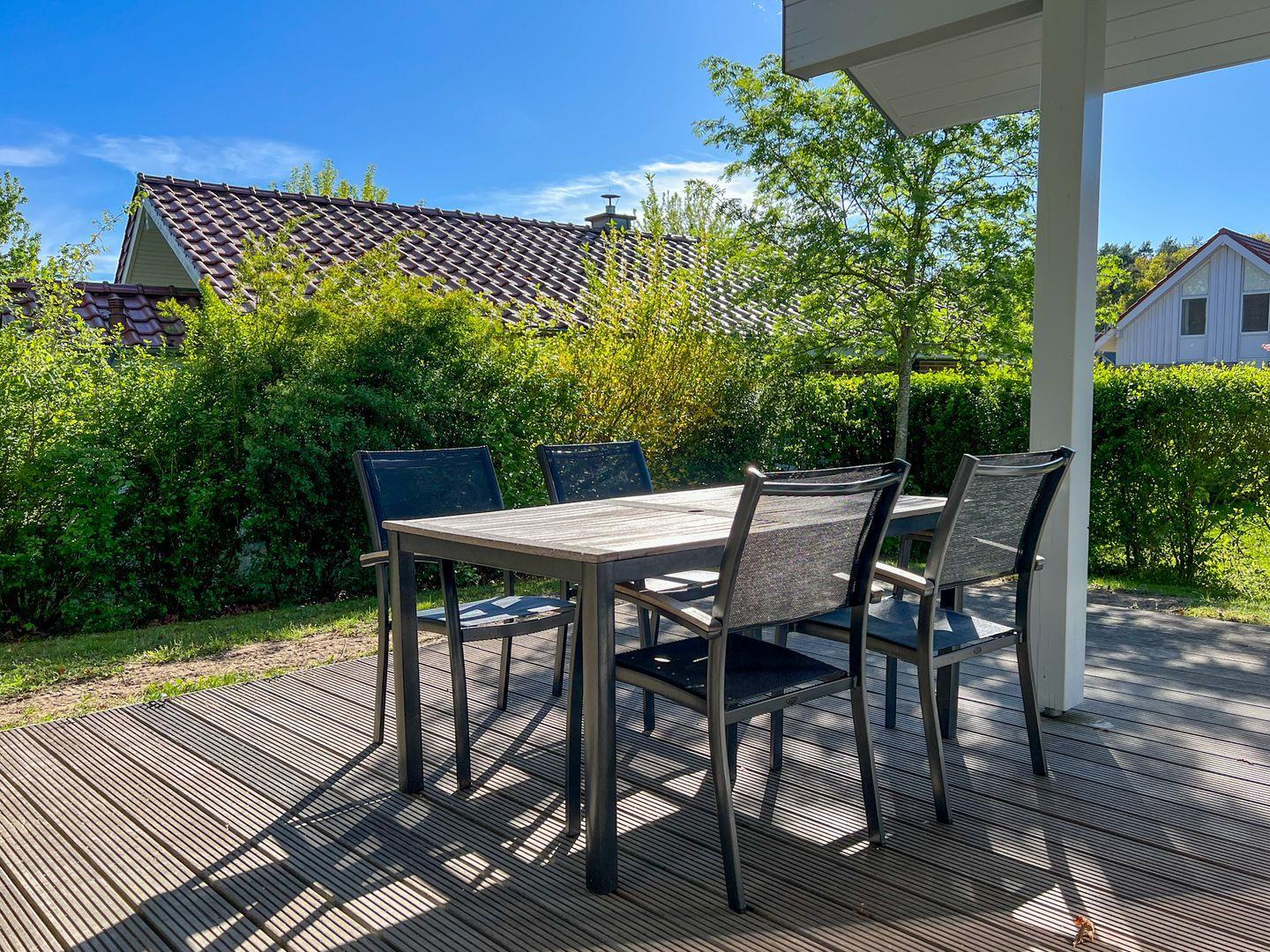 Ein Highlight des Ferienhauses ist die großzügige Terrasse, die zum Verweilen einlädt. Für Ihr privates Wellness-Erlebnis steht Ihnen eine eigene Fasssauna mit Blick in den Garten zur Verfügung – der perfekte Ort, um die Seele baumeln zu lassen.